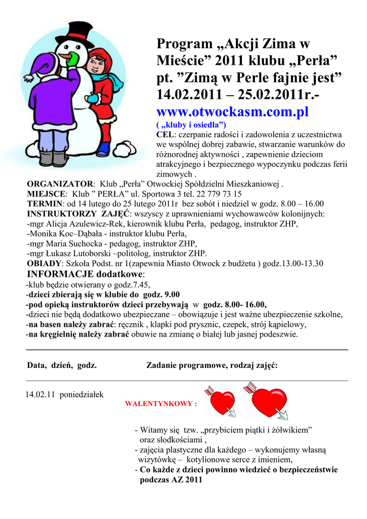 Program „Akcji Zima w Mieście” 2011 klubu „Perła” pt. ”Zimą w Perle fajnie jest” 14.02.2011 – 25.02.2011r.www.otwockasm.com.pl ( „kluby i osiedla”) CEL: czerpanie radości i zadowolenia z uczestnictwa we wspólnej dobrej zabawie, stwarzanie warunków do różnorodnej aktywności , zapewnienie dzieciom atrakcyjnego i bezpiecznego wypoczynku podczas ferii zimowych . ORGANIZATOR: Klub „Perła” Otwockiej Spółdzielni Mieszkaniowej . MIEJSCE: Klub ” PERŁA” ul. Sportowa 3 tel. 22 779 73 15 TERMIN: od 14 lutego do 25 lutego 2011r bez sobót i niedziel w godz. 8.00 – 16.00 INSTRUKTORZY ZAJĘĆ: wszyscy z uprawnieniami wychowawców kolonijnych: -mgr Alicja Azulewicz-Rek, kierownik klubu Perła, pedagog, instruktor ZHP, -Monika Koc–Dąbała - instruktor klubu Perła, -mgr Maria Suchocka - pedagog, instruktor ZHP, -mgr Łukasz Lutoborski –politolog, instruktor ZHP. OBIADY: Szkoła Podst. nr 1(zapewnia Miasto Otwock z budżetu ) godz.13.00-13.30 INFORMACJE dodatkowe: -klub będzie otwierany o godz.7.45, -dzieci zbierają się w klubie do godz. 9.00 -pod opieką instruktorów dzieci przebywają w godz. 8.00- 16.00, -dzieci nie będą dodatkowo ubezpieczane – obowiązuje i jest ważne ubezpieczenie szkolne, -na basen należy zabrać: ręcznik , klapki pod prysznic, czepek, strój kąpielowy, -na kręgielnię należy zabrać obuwie na zmianę o białej lub jasnej podeszwie. Data, dzień, godz. Zadanie programowe, rodzaj zajęć: 14.02.11 poniedziałek WALENTYNKOWY : - Witamy się tzw. „przybiciem piątki i żółwikiem” oraz słodkościami , - zajęcia plastyczne dla każdego – wykonujemy własną wizytówkę – kotylionowe serce z imieniem, - Co każde z dzieci powinno wiedzieć o bezpieczeństwie podczas AZ 2011 (- w formie zabawy - zapoznanie dzieci z zasadami bezpiecznego przebywania w klubie, podczas zajęć, poruszania się po drogach, wsiadania i wysiadania z autokaru, kąpieli w basenie i in.). - „Walentynkowa” poczta - poznajemy się i swoje imiona, piszemy i wykonujemy kartki walentynkowe - zabawa. - Zajęcia plastyczne – wykonujemy „walentynkowe„ ozdobne serca – dekorujemy klub - nagrody , - „Walentynkowy” turniej tenisa stołowego -rozgrywki (z dyplomami i nagrodami ). - Walentynkowe zabawy w lesie z podziałem na zespoły nagrody. - Karaoke dla chętnych. - Śmiechoterapia- zabawa integracyjna 15.02.11 wtorek -Teatrzyk z humorem zajęcia teatralno-plastyczne, podział na grupy , losowanie tematyki wesołych scenek, przygotowanie rekwizytów , przedstawienie scenek - nagrody. - Zabawy na powietrzu. -c.d. „walentynkowego” turnieju tenisa stołowego, - zajęcia plastyczne – maski i ozdoby karnawałowe na bal, - karaoke dla każdego- rywalizacja – nagrody - zasady gry w kręgle – informacja dla dzieci po raz pierwszy korzystających z profesjonalnej kręgielni, 16.02.11 środa - wyjazd autokarem godz. 9. 00 - Wyjazd na kręgielnię ATOMICA w Warszawie, gra na 10 torach w godz.10.30-12.30 , nagrody, medale za 1 miejsca na poszczególnych torach dla Mistrzów Torów, dyplomy, (należy zabrać obuwie z białą lub jasną podeszwą ) - podsumowanie „walentynkowego” turnieju tenisa stołowego dyplomy , medale, nagrody, - zajęcia plastyczne -wykonujemy maski i ozdoby karnawałowe , - gry i zabawy integracyjne , - karaoke dla chętnych. 17.02.11 czwartek - Wielki Klubowy Bal Karnawałowy ( mile widziane przebranie - strój karnawałowy), zabawy , tańce , konkursy - nagrody - gry i zabawy dowolne, - karaoke dla chętnych , - turniej warcabowy – rozgrywki 18.02.11 piątek - wyjazd autokarem godz.9.00 -Wodne figle ”- kąpiemy się i pływamy w basenie w Górze Kalwarii - 1,5 godz.( w godz.10 – 11.30). -turniej warcabowy – podsumowanie – nagrody, medale, dyplomy - gry i zabawy integracyjne. - Czytamy dzieciom – bajka koreańska– zat. „Dlaczego psy nie lubią kotów”, - karaoke dla każdego – „bitwa” – nagrody, dyplomy 21.02.11 poniedziałek - Gra terenowa z podziałem na zespoły –„ Śniegowe stwory” teren leśny lub park, nagrody , -zajęcia plastyczne – „Śniegowe stwory ” w rysunku, -karaoke dla chętnych, - mini turnieje na życzenie – słodkie nagrody - Zimowe zagadki – nagrody 22.02.11 wtorek - wyjazd autokarem godz.9.00 - Kino -Cinema City Warszawa Sadyba– nowość, film animowany, przygodowa komedia „Jogi Bear”, -zajęcia plastyczne - „śmiechoterapia” na podstawie obejrzanego filmu „MIŚ JOGI” – rysunek, nagrody , - zabawy integracyjne proponowane przez dzieci, - karaoke dla chętnych 23.02.11 środa - Spartakiada Zimowa –sportowe konkurencje indywidualne i zespołowe - nagrody, puchary za 3 pierwsze miejsca w ogólnej klasyfikacji, medale , dyplomy ( w zależności od pogody : las lub klub), - zajęcia plastyczne- –projektujemy wzory medali sportowych różnych dyscyplin – nagrody, - gry i zabawy integracyjne, - karaoke dla chętnych „bitwa” – nagrody 24.02.11 czwartek -Udział w imprezie rozrywkowej zorganizowanej przez Miasto Otwock dla dzieci w ramach AZ, - zajęcia plastyczne – przygotowanie rekwizytów do zabawy „Bajka o kocie i myszach” - turniej piłkarzyków parami – rozgrywki , - Czytamy dzieciom - „ Bajka o kocie i myszach” zabawa integracyjna z rekwizytami . - Karaoke dla chętnych. ------------------------------------------------------------------------------------------------------------------------- 25.02.11 piątek - wyjazd autokarem godz.9.00 -„Wodne figle”- kąpiemy się i pływamy w basenie w Górze Kalwarii - 1,5 godz.( w godz.10.00 – 11.30). - zajęcia plastyczne –mój rysunek z AZ do „Perłowej Galerii Rysunku” - turniej „piłkarzyków” parami - nagrody i dyplomy. - Zgaduj-zgadula – zagadki dla chętnych - nagrody, - karaoke dla każdego – „bitwa” – nagrody Opracowała - mgr Alicja Azulewicz-Rek