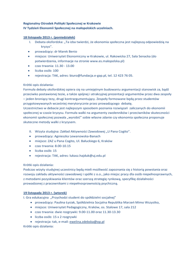 Regionalny Ośrodek Polityki Społecznej w Krakowie IV Tydzień Ekonomii Społecznej na małopolskich uczelniach. 18 listopada 2013 r. (poniedziałek) I. Debata oksfordzka: „Ta izba twierdzi, że ekonomia społeczna jest najlepszą odpowiedzią na kryzys”. • prowadzący: dr Marek Benio • miejsce: Uniwersytet Ekonomiczny w Krakowie, ul. Rakowicka 27, Sala Senacka (do potwierdzenia, informacje na stronie www.es.malopolska.pl) • czas trwania: 11.30 - 13.00 • liczba osób: 100 • rejestracja: TAK, adres: [email protected], tel. 12 423 76 05. Krótki opis działania: Formuła debaty oksfordzkiej opiera się na umiejętnym budowaniu argumentacji stanowisk za, bądź przeciwko postawionej tezie, a także spójnej i atrakcyjnej prezentacji argumentów przez dwa zespoły – jeden broniący tezy, drugi kontrargumentujący. Zespoły formowane będą przez studentów przygotowywanych wcześniej merytorycznie przez prowadzącego debatę. Uczestnictwo w debacie jest najlepszym sposobem poznania rozwiązań zaliczanych do ekonomii społecznej w czasie kryzysu. Formuła walki na argumenty zwolenników i przeciwników skuteczności ekonomii społecznej pozwala „wyrobić” sobie własne zdanie czy ekonomia społeczna proponuje skuteczne metody walki z kryzysem. II. • • • • • Wizyta studyjna: Zakład Aktywności Zawodowej „U Pana Cogito”. prowadzący: Agnieszka Lewanowska-Banach miejsce: ZAZ u Pana Cogito, Ul. Bałuckiego 6, Kraków czas trwania: 8.00-10.15 liczba osób: 15 rejestracja: TAK, adres: [email protected] Krótki opis działania: Podczas wizyty studyjnej uczestnicy będą mieli możliwość zapoznania się z historią powstania oraz rozwoju zakładu aktywności zawodowej i spółki z o.o., jako miejsc pracy dla osób niepełnosprawnych, z metodami pozyskiwania klientów oraz szerszą strategię rynkową, specyfikę działalności prowadzonej z pracownikami z niepełnosprawnością psychiczną. 19 listopada 2013 r. (wtorek) I. Gra edukacyjna „Przychodzi student do spółdzielni socjalnej” • prowadzący: Paulina Łysiak, Spółdzielnia Socjalna Republika Marzeń Mimo Wszystko, • miejsce: Uniwersytet Pedagogiczny, Kraków, os. Stalowe 17, sala 212 • czas trwania: dwie rozgrywki: 9.00-11.00 oraz 11.30-13.30 • liczba osób: 15 x 2 rozgrywki • rejestracja: tak, e-mail: [email protected] Krótki opis działania: Poprzez formułę interaktywnej gry edukacyjnej uczestnicy mają możliwość zapoznać się z zasadami tworzenia i współdecydowania o losach specyficznego przedsiębiorstwa jakim jest spółdzielnia socjalna. Aby zwyciężyć i „stworzyć” najlepiej działającą firmę należy uwzględnić czynniki ekonomiczne oraz czynniki ludzkie, m.in. demokratyczne zarządzanie organizacją. II. Wizyta studyjna: „Przedsiębiorstwo społeczne jako miejsce pracy dla osób niepełnosprawnych.” • prowadzący: Marcin Szczypczyk, PS „Ognisko” Sp. z o.o. • miejsce: „Ognisko” Sp. z o.o., Kraków, ul Prądnicka 10/35 • czas trwania: 10.45-13.05 • liczba osób: 15, e-mail: • rejestracja: TAK, adres: [email protected] Krótki opis działania: Wizyta studyjna do przedsiębiorstwa społecznego prowadzonego w formie spółki prawa handlowego, założonego przez Chrześcijańskie Stowarzyszenie Osób Niepełnosprawnych Ich Rodzin I Przyjaciół. Spółka zatrudnia osoby niepełnosprawne intelektualnie, dlatego też wizyta jest okazją do zapoznania się ze specyfiką organizacji i zarządzania zespołem złożonym z pracowników niepełnosprawnych. 20 listopada 2013 r.(środa) I. Seminarium „Ekonomia społeczna , a kariera zawodowa – wprowadzenie do tematu ES”. • prowadzący: Łukasz Pach, spółdzielnia socjalna Piąty Element • miejsce: Uniwersytet Pedagogiczny, Kraków, os. Stalowe 17, sala 103 • czas trwania: 13.00-15.45 • liczba osób: 50 • rejestracja: TAK, adres: [email protected] Krótki opis działania: Seminarium ma charakter wprowadzający do zagadnień ekonomii społecznej. Celem spotkania jest zapoznanie studentów z tematyką ekonomii społecznej przede wszystkim pod kątem możliwości pracy w tym sektorze. Ukazuje specyfikę działalności spółdzielni socjalnych oraz innych form przedsiębiorstw społecznych koncentrując się na aspekcie zakładania i prowadzenia tego typu podmiotów. II. Warsztat „Animacja lokalna w oparciu o Program Aktywności Lokalnej. Zastosowanie ekonomii społecznej w PAL ” • prowadzący: Dariusz Polakowski • miejsce: Instytut Pedagogiki Uniwersytetu Jagiellońskiego, ul. Stefana Batorego 12, Kraków, sala konferencyjna • czas trwania: 15.00 – 18.15 • liczba osób: 20 os. • rejestracja: TAK, adres: [email protected] Krótki opis działania: Warsztat pozwoli uczestnikom zapoznać się z narzędziem aktywizacji lokalnej jakim jest Program Aktywności Lokalnej (PAL). Jest to metoda, której celem jest realizacja projektów społecznych poprzez zaangażowanie szerokiego grona partnerów (publicznych i niepublicznych) oraz przede wszystkim mieszkańców. PAL cechuje się pewną etapowością, która pozwala w usystematyzowany sposób pracować ze środowiskiem lokalnym; uczestnicy zapoznają się z każdym z etapów realizacji PAL, poznają metody implikacji dobrych praktyk do społeczności lokalnych wymagających interwencji, a wszystko to ze szczególnym uwzględnieniem instrumentów ekonomii społecznej. III. Gra edukacyjna „Przychodzi student do spółdzielni ” • prowadzący: Paulina Łysiak, Spółdzielnia Socjalna Republika Marzeń Mimo Wszystko, • miejsce: Instytut Pedagogiki Uniwersytetu Jagiellońskiego, ul. Stefana Batorego 12, Kraków, sala konferencyjna • czas trwania: 17.30 – 19.00 • liczba osób: 15 os. • rejestracja: TAK, adres: [email protected] Krótki opis działania: Poprzez formułę interaktywnej gry edukacyjnej uczestnicy mają możliwość zapoznać się z zasadami tworzenia i współdecydowania o losach specyficznego przedsiębiorstwa jaki