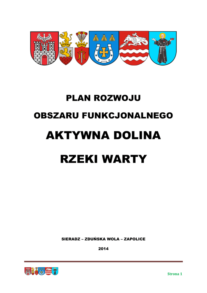 PLAN ROZWOJU OBSZARU FUNKCJONALNEGO AKTYWNA DOLINA RZEKI WARTY SIERADZ – ZDUŃSKA WOLA – ZAPOLICE 2014 Strona 1 PLAN ROZWOJU OBSZARU FUNKCJONALNEGO AKTYWNA DOLINA RZEKI WARTY Spis treści Wprowadzenie ........................................................................................................................... 3 Delimitacja Obszaru Funkcjonalnego Aktywna Dolina Rzeki Warty ................................... 5 1. Analiza endogenicznych czynników rozwoju turystyki Obszaru Funkcjonalnego Aktywna Dolina Rzeki Warty ...................................................................................... 8 1.1 Analiza społeczno-gospodarcza Obszaru Funkcjonalnego Aktywna Dolina Rzeki Warty .............................................................................................................................. 8 1.2 Analiza zasobów przyrodniczych Obszaru Funkcjonalnego Aktywna Dolina Rzeki Warty ................................................................................................................. 26 1.3 Analiza zasobów kulturowych Obszaru Funkcjonalnego Aktywna Dolina Rzeki Warty ............................................................................................................................ 28 1.4 Wybrane imprezy kulturalne i sportowe .................................................................... 50 1.5 Szlaki turystyczne ........................................................................................................ 57 1.6 Instytucje kultury i sportu na Obszarze Funkcjonalnym Aktywna Dolina Rzeki Warty ............................................................................................................................ 58 1.7 Wykaz przedsięwzięć zrealizowanych przez Partnerów w latach 2007-2014, mających oddziaływanie na rozwój turystyki na Obszarze Funkcjonalnym Aktywna Dolina Rzeki Warty .................................................................................... 65 2. Analiza egzogenicznych czynników rozwoju turystyki ............................................ 71 2.1 Analiza ruchu turystycznego w województwie łódzkim .......................................... 71 2.2 Polityka Województwa Łódzkiego w zakresie rozwoju turystyki ............................ 82 3. Analiza SWOT Obszaru Funkcjonalnego Aktywna Dolina Rzeki Warty ............... 87 4. Cele i kierunki rozwoju Obszaru Funkcjonalnego Aktywna Dolina Rzeki Warty .. 90 5. Mechanizmy realizacji ................................................................................................. 92 5.1 Proponowane szlaki turystyczne dla Obszaru Funkcjonalnego Aktywna Dolina Rzeki Warty ................................................................................................................. 95 5.2 Działania inwestycyjne na rzecz rozwoju Obszaru Funkcjonalnego Aktywna Dolina Rzeki Warty................................................................................................... 108 5.3 Strategia promocji Obszaru Funkcjonalnego Aktywna Dolina Rzeki Warty ........ 115 6. Nawiązanie do dokumentów strategicznych ............................................................ 119 7. System wdrażania, monitorowania i ewaluacji realizacji Planu ............................. 126 8. Prognoza oddziaływania na środowisko................................................................... 129 Spis tabel................................................................................................................................ 131 Spis wykresów....................................................................................................................... 131 Spis rysunków ....................................................................................................................... 132 Strona 2 PLAN ROZWOJU OBSZARU FUNKCJONALNEGO AKTYWNA DOLINA RZEKI WARTY Wprowadzenie Plan Rozwoju Obszaru Funkcjonalnego Aktywna Dolina Rzeki Warty jest wynikiem wspólnego przedsięwzięcia miast: Sieradz i Zduńska Wola, gmin wiejskich: Zduńska Wola i Zapolice oraz Powiatu Zduńskowolskiego, które zawarły partnerstwo na rzecz rozwoju tego obszaru. Jest to dokument planistyczny, określający wspólne działania wyżej wskazanych samorządów. Główną ideą łączącą Partnerów jest stworzenie warunków do rozwoju turystyki, w szczególności turystyki aktywnej oraz promocji atrakcji regionu w kraju i za granicą. Celem zaproponowanych działań jest przede wszystkim poprawa jakości życia oraz zwiększenie atrakcyjności inwestycyjnej, a pośrednio zminimalizowanie znacznego odpływu ludności z Obszaru. Turystyka jest sektorem gospodarki generującym rozwój małych i średnich przedsiębiorstw, w ramach których tworzone są miejsca pracy w szczególności dla osób nie posiadających wyspecjalizowanych kwalifikacji. Ponadto wpływa na zwiększenie więzi społecznych oraz poczucia tożsamości lokalnej mieszkańców. Włodarze Gmin oraz Starosta Powiatu przystępują do realizacji tego przedsięwzięcia z nadzieją, że podjęte przez nich działania zainicjują aktywność mieszkańców, przedsiębiorców oraz organizacji pozarządowych na rzecz rozwoju turystyki. Zespołowa organizacja usług turystycznych daje możliwość znacznego poszerzenia kręgu osób, które mogą czerpać korzyści z turystyki, gdyż indywidualnie nie muszą dysponować warunkami do realizacji wszystkich niezbędnych usług wymaganych w obsłudze ruchu turystycznego. Opracowany Plan Rozwoju Obszaru Funkcjonalnego Aktywna Dolina Rzeki Warty podzielić można na dwie części. Pierwsza stanowi analizę czynników społecznogospodarczych oraz przyrodniczo-kulturowych, które mają wpływ na rozwój Obszaru. Druga zawiera elementy planistyczne, wskazuje kierunki rozwoju, mechanizmy jego realizacji, a także konkretnie zdefiniowane działania inwestycyjne. Wyniki analizy Obszaru Funkcjonalnego Aktywna Dolina Rzeki Warty pokazują, że charakteryzuje się on niskim sto