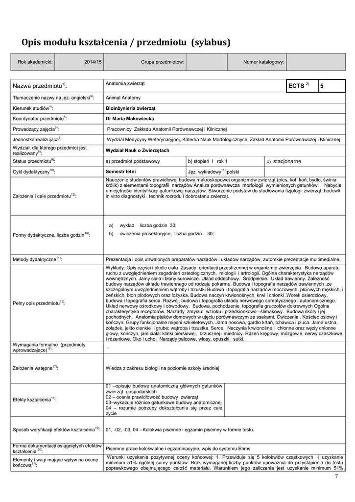 Opis modułu kształcenia / przedmiotu (sylabus) Rok akademicki: Grupa przedmiotów: 2014/15 Nazwa przedmiotu1): Anatomia zwierząt Tłumaczenie nazwy na jęz. angielski3): Animal Anatomy Kierunek studiów4): Bioinżynieria zwierząt 5) Numer katalogowy: ECTS 2) 5 Dr Maria Makowiecka Koordynator przedmiotu : 6) Prowadzący zajęcia : Pracownicy Zakładu Anatomii Porównawczej i Klinicznej Jednostka realizująca7): Wydział Medycyny Weterynaryjnej, Katedra Nauk Morfologicznych, Zakład Anatomii Porównawczej i Klinicznej Wydział, dla którego przedmiot jest realizowany8): Wydział Nauk o Zwierzętach Status przedmiotu9): a) przedmiot podstawowy 10) b) stopień I rok 1 c) stacjonarne 11) Jęz. wykładowy :polski Cykl dydaktyczny : Semestr letni Założenia i cele przedmiotu12): Nauczenie studentów prawidłowej budowy makroskopowej organizmów zwierząt (pies, kot, koń, bydło, świnia, królik) z elementami topografii narządów Analiza porównawcza morfologii wymienionych gatunków. Nabycie umiejętności identyfikacji gatunkowej narządów. Stworzenie podstaw do studiowania fizjologii zwierząt, hodowli in vitro diagnostyki , technik rozrodu i dobrostanu zwierząt. 13) Formy dydaktyczne, liczba godzin : a) wykład b) ćwiczenia prosektoryjne; liczba godzin liczba godzin 30; 30; Metody dydaktyczne14): Prezentacja i opis utrwalonych preparatów narządów i układów narządów, autorskie prezentacje multimedialne. Pełny opis przedmiotu15): Wykłady. Opis części i okolic ciała .Zasady orientacji przestrzennej w organizmie zwierzęcia. Budowa aparatu ruchu z uwzględnieniem zagadnień osteologicznych, miologii i artrologii. Ogólna charakterystyka narządów wewnętrznych. Jamy ciała i błony surowicze. Układ oddechowy. Śródpiersie. Układ trawienny. Zależność budowy narządów układu trawiennego od rodzaju pokarmu. Budowa i topografia narządów trawiennych ,ze szczególnym uwzględnieniem wątroby i trzustki Budowa i topografia narządów moczowych, płciowych męskich, i żeńskich, błon płodowych oraz łożyska. Budowa naczyń krwionośnych, krwi i chłonki .Worek osierdziowy, budowa i topografia serca. Rozwój, budowa i topografia układu nerwowego somatycznego i autonomicznego. Układ nerwowy ośrodkowy i obwodowy. Budowa, pochodzenie, topografia gruczołów dokrewnych Ogólna charakterystyka receptorów. Narządy zmysłu: wzroku i przedsionkowo –ślimakowy. Budowa skóry i jej pochodnych. Anatomia ptaków domowych w ujęciu porównawczym ze ssakami. Ćwiczenia . Kościec osiowy i kończyn. Grupy funkcjonalne mięśni szkieletowych. Jama nosowa, gardło krtań, tchawica i płuca. Jama ustna, żołądek, jelito cienkie i grube; wątroba i trzustka. Serce. Naczynia krwionośne i chłonne oraz węzły chłonne głowy, kończyn, jam ciała: klatki piersiowej, brzusznej i miednicy. Rdzeń kręgowy, mózgowie, nerwy czaszkowe i rdzeniowe. Oko i ucho. Narządy palcowe, włosy, opuszki, sutki. Wymagania formalne (przedmioty wprowadzające)16): - Założenia wstępne17): Wiedza z zakresu biologii na poziomie szkoły średniej Efekty kształcenia18): 01 –opisuje budowę anatomiczną głównych gatunków zwierząt gospodarskich 02 – ocenia prawidłowość budowy zwierząt 03–wykazuje różnice gatunkowe budowy anatomicznej 04 – rozumie potrzeby dokształcania się przez całe życie Sposób weryfikacji efektów kształcenia19): 01, -02, -03, 04 --Kolokwia pisemne i egzamin pisemny w formie testu. Forma dokumentacji osiągniętych efektów Pisemne prace kolokwialne i egzaminacyjne, wpis do systemu Ehms kształcenia 20): Warunki uzyskania pozytywnej oceny końcowej: 1. Przewiduje się 5 kolokwiów cząstkowych i uzyskanie Elementy i wagi mające wpływ na ocenę minimum 51% ogólnej sumy punktów. Brak wymaganej liczby punktów upoważnia do przystąpienia do testu końcową21): poprawkowego obejmującego całość materiału. Warunkiem jego zaliczenia jest uzyskanie minimum 51% 7 maksymalnej liczby punktów. Możliwość uczestnictwa w teście poprawkowym nie przysługuje w przypadku uzyskania wyniku niższego niż 30% maksymalnej liczby punktów z 5 kolokwiów. 2.Uzyskanie zaliczenia semestru uprawnia do przystąpienia do egzaminu końcowego 3. Uzyskanie minimum 51% maksymalnej liczby punktów z egzaminu końcowego przeprowadzonego w formie testu Waga ocen 0% - 50% maksymalnej liczby punktów – niedostateczny 51%-60% maksymalnej liczby punktów – dostateczny 61%-70% maksymalnej liczby punktów – dostateczny plus 71%-80% maksymalnej liczby punktów – dobry 81%-90% maksymalnej liczby punktów – dobry plus 91%-100% maksymalnej liczby punktów – bardzo dobry Student, który uzyskał ocenę 4,5 lub 5 z testów cząstkowych może być zwolniony z egzaminu, uzyskując równorzędną ocenę końcową. Student, który podczas przewidzianych testów nie uzyskał 51% i w wyniku testu poprawkowego z całości materiału został dopuszczony do egzaminu, w przypadku otrzymania liczby punktów wskazujących na ocenę wyższą niż 3 uzyska ocenę końcową obniżoną o 0,5; z kolei student, który miał na zaliczenie 4 a z egzaminu końcowego otrzymał liczbę pukntów wskazującą na ocenę 3 uzyska ocenę 3,5. Miejsce realizacji zajęć22): Sala wykładowa i prosektoria Literatura podstawowa i uzupełniająca23): 1. Przespolewska H., Kobryń H., Bartyzel B.,Szara T. Zarys anatomii zwierząt domowych. Wyd. Wieś Jutra 2009 2. Krysiak K,.Kobryń H.,.Kobryńczuk F. Anatomia zwierząt t I. PWN, 2001. 3. Krysiak K Świeżyński K: Anatomia zwierząt t II. PWN 2001. 4. Kobryń H., Kobryńczuk F.: Anatomia zwierząt t III. PWN 2004. 5. Popesko P. Atlas anatomii topograficznej zwierząt domowych. PWR i L. Warszawa, 2008 6.. Przespolewska H., Kobryń H. Anatomia zwierząt domowych repetytorium . PWR i L.Warszawa, 2011. 7. Dyce KM., Sack W.O., Wensing C.J.G., Anatomia Weterynaryjna. Elsevier Urban&Partner, Wrocław, 2011. 8.Mc Cracken T.O., Kainer R.A. Atlas anatomii małych zwie
