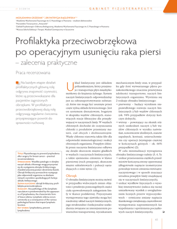 G A B I N E T // 3 / 2 0 1 4 F I Z J O T E R A P E U T Y MGR JOANNA GRZESIAK1, 2, DR PATRYCJA RĄGLEWSKA3, 4 Akademia Wychowania Fizycznego im. E. Piaseckiego w Poznaniu – studium doktoranckie 1 2 Poznańskie Towarzystwo „Amazonki” Zakład Fizykoterapii i Odnowy Biologicznej, Akademia Wychowania Fizycznego im. E. Piaseckiego w Poznaniu 3 4 Wyższa Szkoła Edukacji i Terapii, Wydział Zamiejscowy w Szczecinie Profilaktyka przeciwobrzękowa po operacyjnym usunięciu raka piersi – zalecenia praktyczne Praca recenzowana Na każdym etapie działań profilaktycznych główną rolę odgrywa znajomość czynności, które są przeciwwskazane dla pacjentów zagrożonych obrzękami. W profilaktyce przeciwobrzękowej dużą rolę odgrywają regularne ćwiczenia przyspieszające powrót do sprawności ruchowej. Title: Physiotherapy to prevent lymphedema after surgery for breast cancer – practical recommendations Streszczenie: Wszelkie patologie w obrębie naczyń układu chłonnego mogą przyczyniać się do wystąpienia obrzęku limfatycznego, charakterystycznej postaci obrzmienia tkanek. Obrzęk limfatyczny powszechnie występuje jako odpowiedź organizmu na działanie różnych czynników upośledzających funkcje układu limfatycznego. Słowa kluczowe: obrzęk limfatyczny, profilaktyka przeciwobrzękowa Summary: Any pathology of the lymphatic vasculature is predominated by the appearance of lymphedema, the characteristic form of tissue edema. Lymphatic edema occurs commonly as a consequence of the various pathological factors that impair lymphatic function. Key words: lymphedema, prevent lymphedema U kład limfatyczny jest układem półzamkniętym, który przejmuje i transportuje płyn międzykomórkowy do krążenia żylnego. System naczyń limfatycznych odpowiedzialny jest za odtransportowywanie substancji, które nie mogą być usunięte przez część żylną układu krwionośnego. Jest on systemem drenażowym, bogatym w skupiska węzłów chłonnych, stanowiących stacje filtracyjne dla przepływającej w naczyniach limfy. W węzłach chłonnych dochodzi do oczyszczania chłonki z produktów przemiany materii, ciał obcych i drobnoustrojów. Węzły chłonne stanowią także filtr dla odpowiedzi immunologicznej i reakcji obronnych organizmu. Przepływ chłonki przez naczynia limfatyczne odbywa się dzięki skurczom mięśni gładkich w węzłach i naczyniach limfatycznych, a także ujemnemu ciśnieniu w klatce piersiowej (ruch przepony), skurczom mięśni szkieletowych i pulsacji sąsiadujących z nimi tętnic (1). Obrzęk O obrzęku limfatycznym można mówić w przypadku widocznych zmian objętości i przekroju poszczególnych części ciała spowodowanych zaleganiem limfy w tkance podskórnej. Przyczynami występowania tego zjawiska mogą być niedrożny układ naczyń limfatycznych, jego strukturalne i funkcjonalne uszkodzenia związane ze zmniejszeniem powierzchni transportowej, wyciekaniem mechanicznym limfy oraz, w przypadku gdy ilość wytwarzanego płynu pozakomórkowego znacznie przewyższa zdolności transportowe, naczyń limfatycznych organizmu. Wyróżnia się 2 rodzaje obrzęku limfatycznego: • pierwotny – będący wynikiem nieprawidłowego rozwoju naczyń limfatycznych i/lub węzłów chłonnych (ok. 94% przypadków dotyczy kończyn dolnych), • wtórny – powstający na skutek różnych uszkodzeń naczyń i/lub węzłów chłonnych w wyniku naświetlań, nowotworów złośliwych, stanów zapalnych, kontuzji, unieruchomienia czy operacji (występuje częściej w kończynach górnych – ok. 66% przypadków) (2). W celu minimalizacji wystąpienia obrzęku limfatycznego należy (3, 4, 5): • unikać przenoszenia ciężkich przedmiotów kończyną strony operowanej (długotrwałe napięcie izometryczne powoduje wzrost ciśnienia wewnątrznaczyniowego i w sposób znaczący utrudnia przepływ limfy znajdującej się w naczyniach limfatycznych), • unikać wysiłków fizycznych o wysokiej intensywności (zaleca się raczej umiarkowany wysiłek z uwzględnieniem licznych przerw wypoczynkowych – rytmiczne zmiany napięcia tkankowego zwiększają częstotliwość występowania naprzemiennych faz wypełniania i opróżniania początkowych naczyń limfatycznych), 41 G A B I N E T F I Z J O T E R A P E U T Y 2 fot. archiwum autorek 1 r e h a b i l i t a c j a // 10 cm 10 cm 5 cm 5 cm 3 4 5 Fot. 1. Charakterystyka lokalizacji punktów pomiarowych kończyny górnej stosowanych w prewencji obrzęku limfatycznego Fot. 2-3. Technika głaskania Fot. 4. Chwyty rozcierania kończyny objętej obrzękiem limfatycznym Fot. 5. Chwyt ugniatania kończyny objętej obrzękiem limfatycznym • układać obrzękniętą kończynę powyżej linii barku (ręka powinna być oparta na klinie na całej swej długości – ułatwia to mechaniczny przepływ limfy przez naczynia limfatyczne), • zadbać o dobór odpowiedniej protezy (dbałość o prawidłowe, równomierne obciążenie prawej i lewej strony ciała) – jeśli nie wykonano operacji odtwórczej piersi, zaleca się noszenie protezy zewnętrznej podczas aktywności dnia codziennego, • stosować automasaż, drenaż limfatyczny i kompresjoterapię (w I etapie – bandażowanie kończyny, w II etapie – dobór całościowego rękawa elastycznego) w celu zwiększania wytwarzania limfy, czynnego rozciągania ścian limfangionu, rozciągania ścian naczyń limfatycznych prowadzących do wzmożonej limfangiomotoryki oraz zwiększenia objętości czasowej limfy, 42 • zadbać o systematyczne mierzenie obwodów kończyn – pozwala to na lepszą prewencję przeciwobrzękową i szybsze podjęcie działań w sytuacji wystąpienia obrzęku limfatycznego (należy dokonywać symetrycznych pomiarów kończyn w celu określenia stosunku pomiędzy kończyną zdrową a kończyną po stronie operowanej), • obserwować kończynę strony operowanej pod kątem: stanów zapalnych skóry i naczyń krwionośnych, ucieplenia i zaczerwienienia kończ