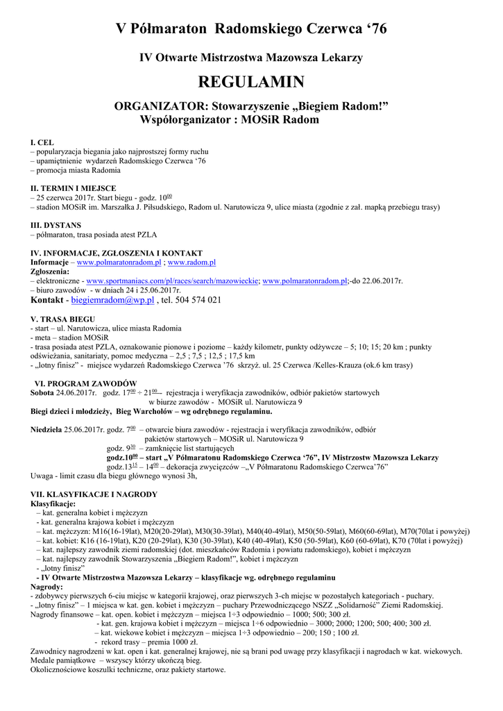 V Półmaraton Radomskiego Czerwca ‘76 IV Otwarte Mistrzostwa Mazowsza Lekarzy REGULAMIN ORGANIZATOR: Stowarzyszenie „Biegiem Radom!” Współorganizator : MOSiR Radom I. CEL – popularyzacja biegania jako najprostszej formy ruchu – upamiętnienie wydarzeń Radomskiego Czerwca ‘76 – promocja miasta Radomia II. TERMIN I MIEJSCE – 25 czerwca 2017r. Start biegu - godz. 1000 – stadion MOSiR im. Marszałka J. Piłsudskiego, Radom ul. Narutowicza 9, ulice miasta (zgodnie z zał. mapką przebiegu trasy) III. DYSTANS – półmaraton, trasa posiada atest PZLA IV. INFORMACJE, ZGŁOSZENIA I KONTAKT Informacje – www.polmaratonradom.pl ; www.radom.pl Zgłoszenia: – elektroniczne - www.sportmaniacs.com/pl/races/search/mazowieckie; www.polmaratonradom.pl;-do 22.06.2017r. – biuro zawodów - w dniach 24 i 25.06.2017r. Kontakt - [email protected] , tel. 504 574 021 V. TRASA BIEGU - start – ul. Narutowicza, ulice miasta Radomia - meta – stadion MOSiR - trasa posiada atest PZLA, oznakowanie pionowe i poziome – każdy kilometr, punkty odżywcze – 5; 10; 15; 20 km ; punkty odświeżania, sanitariaty, pomoc medyczna – 2,5 ; 7,5 ; 12,5 ; 17,5 km - „lotny finisz” - miejsce wydarzeń Radomskiego Czerwca ’76 skrzyż. ul. 25 Czerwca /Kelles-Krauza (ok.6 km trasy) VI. PROGRAM ZAWODÓW Sobota 24.06.2017r. godz. 1700 ÷ 2100 - rejestracja i weryfikacja zawodników, odbiór pakietów startowych w biurze zawodów - MOSiR ul. Narutowicza 9 Biegi dzieci i młodzieży, Bieg Warchołów – wg odrębnego regulaminu. Niedziela 25.06.2017r. godz. 700 – otwarcie biura zawodów - rejestracja i weryfikacja zawodników, odbiór pakietów startowych – MOSiR ul. Narutowicza 9 godz. 930 – zamknięcie list startujących godz.1000 – start „V Półmaratonu Radomskiego Czerwca ‘76”, IV Mistrzostw Mazowsza Lekarzy godz.1315 – 1400 – dekoracja zwycięzców –„V Półmaratonu Radomskiego Czerwca’76” Uwaga - limit czasu dla biegu głównego wynosi 3h, VII. KLASYFIKACJE I NAGRODY Klasyfikacje: – kat. generalna kobiet i mężczyzn - kat. generalna krajowa kobiet i mężczyzn – kat. mężczyzn: M16(16-19lat), M20(20-29lat), M30(30-39lat), M40(40-49lat), M50(50-59lat), M60(60-69lat), M70(70lat i powyżej) – kat. kobiet: K16 (16-19lat), K20 (20-29lat), K30 (30-39lat), K40 (40-49lat), K50 (50-59lat), K60 (60-69lat), K70 (70lat i powyżej) – kat. najlepszy zawodnik ziemi radomskiej (dot. mieszkańców Radomia i powiatu radomskiego), kobiet i mężczyzn – kat. najlepszy zawodnik Stowarzyszenia „Biegiem Radom!”, kobiet i mężczyzn - „lotny finisz” - IV Otwarte Mistrzostwa Mazowsza Lekarzy – klasyfikacje wg. odrębnego regulaminu Nagrody: - zdobywcy pierwszych 6-ciu miejsc w kategorii krajowej, oraz pierwszych 3-ch miejsc w pozostałych kategoriach - puchary. - „lotny finisz” – 1 miejsca w kat. gen. kobiet i mężczyzn – puchary Przewodniczącego NSZZ „Solidarność” Ziemi Radomskiej. Nagrody finansowe – kat. open. kobiet i mężczyzn – miejsca 1÷3 odpowiednio – 1000; 500; 300 zł. - kat. gen. krajowa kobiet i mężczyzn – miejsca 1÷6 odpowiednio – 3000; 2000; 1200; 500; 400; 300 zł. – kat. wiekowe kobiet i mężczyzn – miejsca 1÷3 odpowiednio – 200; 150 ; 100 zł. - rekord trasy – premia 1000 zł. Zawodnicy nagrodzeni w kat. open i kat. generalnej krajowej, nie są brani pod uwagę przy klasyfikacji i nagrodach w kat. wiekowych. Medale pamiątkowe – wszyscy którzy ukończą bieg. Okolicznościowe koszulki techniczne, oraz pakiety startowe. Organizator nie gwarantuje otrzymania koszulek oraz pełnego pakietu startowego dla osób dokonujących opłaty startowej w dniach 24 i 25.06.2017r. IV Otwarte Mistrzostwa Mazowsza Lekarzy – nagrody wg. odrębnego regulaminu VIII. UCZESTNICTWO Do startu w półmaratonie dopuszczeni zostaną zawodnicy którzy ukończyli 16-ty rok życia, posiadają aktualne badania lekarskie lub po podpisaniu oświadczenia o stanie zdrowia. Zawodnicy niepełnoletni muszą posiadać pisemną zgodę rodziców na uczestnictwo w biegu. IX. OPŁATY STARTOWE – 1 Przelew – 1. termin – 30 zł - wpłata do 15.03.2017r. ; 2 termin – 45 zł – wpłata do 15.05.2017r. ; 3 termin – 60 zł wpłata do 22.06.2017r Gotówka - 4 termin – 80 zł – wpłata w biurze zawodów Członkowie Stowarzyszenia „Biegiem Radom!” - odpowiednio : Przelew - 1 termin – 20 zł ; 2 –termin – 30zł; 3 termin – 40zł; gotówka - 4 termin – 50 zł. – dla wpłat dok. przelewem po 20.06.2017 r. zaleca się posiadanie potwierdzenia przelewu X. WYŻYWIENIE I NOCLEGI - Organizator zapewnia posiłek po biegu. - Na trasie biegu ustawione będą stoły z napojami zimnymi (woda, napój izotoniczny), oraz punkty odświeżania z wodą i gąbkami. - Organizator zapewnia bezpłatny nocleg w hali sportowej MOSiR przy ul. Narutowicza 9 (własny śpiwór i materac lub karimata). XI. POSTANOWIENIA KOŃCOWE -Organizatorzy nie odpowiadają za rzeczy zagubione, a nie oddane do depozytu. Uczestnicy biegów biorą udział w zawodach na własną odpowiedzialność i wskazane jest ubezpieczenie na własny koszt od następstw nieszczęśliwych wypadków. Pobranie numeru startowego przez zawodnika jest równoznaczne z akceptacją regulaminu którego ostateczna interpretacja należy do organizatora. UWAGA – W ramach V Półmaratonu Radomskiego Czerwca'76 w dniu 24 czerwca (sobota) rozegrane zostaną biegi dzieci i młodzieży, oraz charytatywny Bieg Warchołów . Regulaminy tych imprez dostępne na – polmaratonradom.pl i www.sportmaniacs.com/pl/races/search/mazowieckie SPONSOR STRATEGICZNY Trend Glass PATRONAT HONOROWY Prezydent Miasta Radomia – Radosław Witkowski WSPÓŁORGANIZATORZY MOSiR Radom, MZDiK, ZUK , Straż Miejska , KM Policji, Okręgowa Izba Lekarska w Warszawie WSPÓŁPRACA NSZZ „Solidarność” Ziemia Radomska, Stowarzyszenie „Radomski Czerwiec’76”, Instytut Pamięci Narodowej PATRONAT MEDIALNY Telewizja Dami; Zebrra