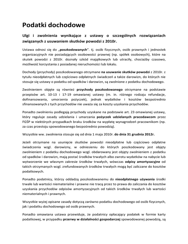 Podatki dochodowe Ulgi i zwolnienia wynikające z ustawy o szczególnych rozwiązaniach związanych z usuwaniem skutków powodzi z 2010r. Ustawa odnosi się do „poszkodowanych”. tj. osób fizycznych, osób prawnych i jednostek organizacyjnych nie posiadających osobowości prawnej (np. spółek osobowych), które na skutek powodzi z 2010r. doznały szkód majątkowych lub utraciły, chociażby czasowo, możliwość korzystania z posiadanej nieruchomości lub lokalu. Dochody (przychody) poszkodowanego otrzymane na usuwanie skutków powodzi z 2010r. z tytułu nieodpłatnych lub częściowo odpłatnych świadczeń a także darowizn, do których nie stosuje się ustawy o podatku od spadków i darowizn, są zwolnione z podatku dochodowego. Zwolnieniem objęte są również przychody poszkodowanego otrzymane na podstawie przepisów art. 10-13 i 17-19 omawianej ustawy (m. in. różnego rodzaju refundacje, dofinansowania, umorzenia pożyczek), jednak wydatków i kosztów bezpośrednio sfinansowanych z tych przychodów nie uważa się za koszty uzyskania przychodów. Ponadto zwolnieniu podlegają przychody uzyskane na podstawie art. 23 omawianej ustawy, który reguluje zasady udzielania i umarzania pożyczek udzielanych pracodawcom przez FGŚP w niektórych przypadkach braku środków na wypłatę wynagrodzeń pracownikom (np. za czas przestoju spowodowanego bezpośrednio powodzią). Wszystkie ww. zwolnienia stosuje się od dnia 1 maja 2010r. do dnia 31 grudnia 2012r. Jeżeli otrzymane na usunięcie skutków powodzi nieodpłatne lub częściowo odpłatne świadczenia wzgl. darowizny, w odniesieniu do których poszkodowany jest objęty zwolnieniem z podatku dochodowego wzgl. obdarowany jest objęty zwolnieniem z podatku od spadków i darowizn, mają postać środków trwałych albo zwrotu wydatków na nabycie lub wytworzenie we własnym zakresie środków trwałych, wówczas odpisy amortyzacyjne od takich otrzymanych wzgl. zrefundowanych środków trwałych mogą być zaliczane do kosztów podatkowych. Ponadto podatnicy, którzy oddadzą poszkodowanemu do nieodpłatnego używania środki trwałe lub wartości niematerialne i prawne nie tracą przez to prawa do zaliczania do kosztów uzyskania przychodów odpisów amortyzacyjnych od takich środków trwałych lub wartości niematerialnych i prawnych. Wszystkie wyżej opisane zasady dotyczą zarówno podatku dochodowego od osób fizycznych, jak i podatku dochodowego od osób prawnych. Ponadto omawiana ustawa przewiduje, że podatnicy opłacający podatek w formie karty podatkowej, w przypadku przerwy w działalności gospodarczej spowodowanej powodzią, są zobowiązani do zawiadomienia właściwego naczelnika urzędu skarbowego o okresie przerwy w dniu rozpoczęcia działalności po tej przerwie (podatek w formie karty nie jest pobierany za okres przerwy trwającej nieprzerwanie co najmniej 10 dni w wysokości 1/30 miesięcznej należności za każdy dzień przerwy pod warunkiem dochowania terminów zawiadomienia). Zwolnienie wynikające z ustawy o wsparciu przedsiębiorców dotkniętych skutkami powodzi z 2010r. Kwoty umorzonych pożyczek udzielonych przedsiębiorcom zgodnie z ustawą podlegają zwolnieniu z podatków dochodowych. Ulgi i zwolnienia wynikające z ustawy o podatku dochodowym od osób fizycznych Wolne od podatku są m.in.: - świadczenia otrzymane z tytułu jednorazowej pomocy materialnej finansowanej ze środków budżetu państwa lub samorządu w związku z zaistniałym zdarzeniem losowym. - zapomogi otrzymane (np. od zakładu pracy i związków zawodowych) w przypadku indywidualnych zdarzeń losowych czy klęsk żywiołowych - do wysokości 2.280 zł w roku podatkowym. - świadczenia z pomocy społecznej. - niektóre świadczenia otrzymane z Zakładowego Funduszu Świadczeń Socjalnych - do wysokości 380 zł w roku podatkowym. - świadczenia w naturze i inne nieodpłatne świadczenia otrzymane od osób zaliczonych do I i II grupy podatkowej (bliższa i dalsza rodzina), poza świadczeniami uzyskanymi w związku z zawartymi umowami o pracę, zlecenie, itd. - wartość otrzymanych nieodpłatnych lub częściowo odpłatnych świadczeń oraz wartość świadczeń rzeczowych (w naturze) finansowanych lub współfinansowanych ze środków budżetu państwa, jednostek samorządu terytorialnego, ze środków agencji rządowych, agencji wykonawczych lub ze środków pochodzących od rządów państw obcych, organizacji międzynarodowych lub międzynarodowych instytucji finansowych, w ramach rządowych programów. - kwoty otrzymane z tytułu ubezpieczeń majątkowych i osobowych, z wyjątkiem odszkodowań za szkody dotyczące składników majątku związanych z prowadzoną działalnością gospodarczą lub prowadzeniem działów specjalnej produkcji rolnej. Dodatkowo w odniesieniu do pomocy materialnej otrzymanej od zakładu pracy wskutek katastrofy naturalnej, w rozumieniu ustawy z dnia 18 kwietnia 2002 r. o stanie klęski żywiołowej - Minister Finansów zaniechał poboru podatku od dochodów z tego źródła, uzyskanych do końca 2010 r., do wysokości nieprzekraczającej 6.000 zł w ciągu roku podatkowego.
