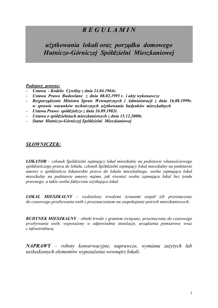 REGULAMIN uŜytkowania lokali oraz porządku domowego Hutniczo-Górniczej Spółdzielni Mieszkaniowej Podstawy prawne: - Ustawa - Kodeks Cywilny z dnia 23.04.1964r. - Ustawa Prawo Budowlane z dnia 08.02.1995 r. i akty wykonawcze - Rozporządzenie Ministra Spraw Wewnętrznych i Administracji z dnia 16.08.1999r. w sprawie warunków technicznych uŜytkowania budynków mieszkalnych - Ustawa Prawo spółdzielcze z dnia 16.09.1982r. - Ustawa o spółdzielniach mieszkaniowych z dnia 15.12.2000r. - Statut Hutniczo-Górniczej Spółdzielni Mieszkaniowej SŁOWNICZEK: LOKATOR – członek Spółdzielni zajmujący lokal mieszkalny na podstawie własnościowego spółdzielczego prawa do lokalu, członek Spółdzielni zajmujący lokal mieszkalny na podstawie umowy o spółdzielcze lokatorskie prawo do lokalu mieszkalnego, osoba zajmująca lokal mieszkalny na podstawie umowy najmu, jak równieŜ osoba zajmująca lokal bez tytułu prawnego, a takŜe osoba faktycznie uŜytkująca lokal. LOKAL MIESZKALNY – wydzielony trwałymi ścianami zespół izb przeznaczony do czasowego przebywania osób z przeznaczeniem na zaspokajanie potrzeb mieszkaniowych. BUDYNEK MIESZKALNY – obiekt trwale z gruntem związany, przeznaczony do czasowego przebywania osób, wyposaŜony w odpowiednie instalacje, urządzenia pomiarowe wraz z infrastrukturą NAPRAWY – roboty konserwacyjne, naprawcze, wymiana zuŜytych lub uszkodzonych elementów wyposaŜenia wewnątrz lokali. 1 ROZDZIAŁ I Przepisy ogólne § 1. 1. Lokator obowiązany jest do terminowego wnoszenia opłat za uŜywanie lokalu mieszkalnego w terminach określonych Statutem Spółdzielni lub wiąŜącą go umową najmu. 2. KaŜda ze stron tj. lokatorzy lokali Hutniczo-Górniczej Spółdzielni Mieszkaniowej jak równieŜ Spółdzielnia ma obowiązek w swoim zakresie dbać o prawidłowe i rzetelne wykonywanie przypadających na nią obowiązków w zakresie ustalonym niniejszym regulaminem. 3. Obowiązkiem kaŜdego lokatora jest niezwłoczne zgłaszanie w administracji zauwaŜonych awarii oraz uszkodzeń instalacji i urządzeń znajdujących się w budynku lub w jego otoczeniu bez względu na to kogo koszt naprawy będzie obciąŜać. 4. Klucze do pomieszczeń technicznych znajdują się w administracji, dozorcy budynku lub osoby upowaŜnionej. § 2. Naprawa uszkodzeń w budynku, powstałych z winy lokatora wykonana zostanie na jego koszt. § 3. Lokal powinien być uŜytkowany w sposób zapewniający: - zachowanie wymogów bezpieczeństwa, - utrzymanie wymaganego stanu technicznego, - utrzymanie wymaganego stanu hignieniczno-sanitarnego określonego odrębnymi przepisami, - prawidłowe funkcjonowanie wspólnych instalacji i urządzeń znajdujących się w tym lokalu. § 4. 1. Lokator moŜe dokonać zmian w mieszkaniu wyłącznie w przypadku ich zgodności z prawem budowlanym, po uprzednim uzyskaniu pisemnej zgody Spółdzielni. Spółdzielnia moŜe taką zgodę wydać lub uzaleŜnić jej wydanie uzyskaniem opinii jednostek do tego uprawnionych np. projektanta, StraŜy PoŜarnej, Sanepidu, Wydziału Architektury i Urbanistyki, Nadzoru Budowlanego. 2. Wszelkie wykonane przez lokatora ulepszenia nie powodują podwyŜszenia wniesionego wkładu. 3. W przypadku opuszczenia lokalu lokator dokonuje uzgodnień i rozliczenia z lokatorem przyjmującym lokal bądź doprowadza lokal do stanu pierwotnego. 2 § 5. 1. Lokator zobowiązany jest do właściwego ogrzewania lokalu zapewniającego zachowanie i utrzymanie jego stanu technicznego. 2. W przypadku wystąpienia w lokalu wilgoci spowodowanej niewłaściwym jego ogrzewaniem na skutek zaniedbania lokatora, koszty usunięcia wilgoci i doprowadzenia lokalu do stanu poprzedniego obciąŜają lokatora. § 6. 1. Lokator zobowiązany jest do zapewnienia właściwego napływu powietrza do lokalu zapewniającego zachowanie i utrzymanie jego stanu technicznego. 2. W przypadku wystąpienia w lokalu wilgoci spowodowanej przyczynami określonymi w ust. 1, czy to na skutek niewłaściwego uŜytkowania stolarki okiennej, czy nadmiernego uszczelnienia mieszkania, koszty usunięcia wilgoci i doprowadzenia lokalu do stanu poprzedniego obciąŜają lokatora. § 7. Lokator jest bezwzględnie zobowiązany do udostępnienia lokalu celem przeprowadzenia przez Spółdzielnię lub podmiotu przez nią upowaŜnionego wymaganych prawem kontroli, przeglądów, odczytów i badań poszczególnych instalacji znajdujących się w lokalu, jak równieŜ wyposaŜenia lokalu w dodatkowe instalacje, czy teŜ usuwania awarii. § 8. 1. Do urządzeń sanitarnych nie wolno wrzucać popiołu, śmieci, szmat, odpadów Ŝywnościowych, środków opatrunkowych i higienicznych. 2. W przypadku zapchania urządzeń sanitarnych i przewodów kanalizacyjnych w lokalu, usunięcie niedroŜności naleŜy do obowiązków lokatora. § 9. 1. Zabrania się montaŜu wszelkiego rodzaju anten na dachach oraz elewacji budynku bez zgody Spółdzielni. 2. W przypadku samowolnego zamontowania anten Spółdzielnia będzie dokonywać ich demontaŜu na koszt lokatora. § 10. Wchodzenie na dachy budynków bez zgody Spółdzielni jest surowo zabronione. 3 ROZDZIAŁ II Postanowienia dotyczące poszczególnych instalacji i urządzeń Instalacja centralnego ogrzewania § 11. Spółdzielnia zapewnia lokatorom korzystającym ze wspólnej instalacji centralnego ogrzewania: 1. temperaturę w wysokości min. 18º C w lokalach mieszkalnych, 2. utrzymywanie urządzeń cieplnych w naleŜytym stanie technicznym, 3. usuwanie awarii instalacji wewnętrznej c.o., 4. wykonywanie niezbędnych remontów instalacji c.o. § 12. 1. Zabrania się samowolnych przeróbek instalacji centralnego ogrzewania (instalowania dodatkowych grzejników, usuwania kryz, demontaŜu zaworów termoregulacyjnych) oraz spuszczania wody z c.o. bez uzgodnienia ze Spółdzielnią. 2. W przypadku stwierdzenia działań wymienionych w pkt. 1 Spółdzielnia obciąŜy lokatora karą w wysokości 6-miesięcznej opłaty za c.o. w lokalu oraz kosztam