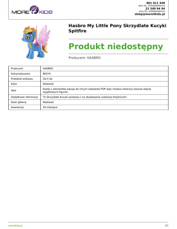 801 011 448 (DLA TEL. STACJONARNYCH) 22 349 94 94 (DLA TEL. KOMÓRKOWYCH) [email protected] Hasbro My Little Pony Skrzydlate Kucyki Spitfire Produkt niedostępny Producent: HASBRO Producent HASBRO Kod producenta B0374 Przedział wiekowy Od 4 lat Kolor Niebieski Opis Każdy z elementów pasuje do innych zestawów POP więc możesz stworzyć jeszcze więcej wyjątkowych figurek. Dodatkowe informacje Te Skrzydlate Kucyki pozwolą ci na zbudowanie ulubionej Księżniczki! Kolor główny Niebieski Gwarancja 24 miesiące more4kids.pl 1/1