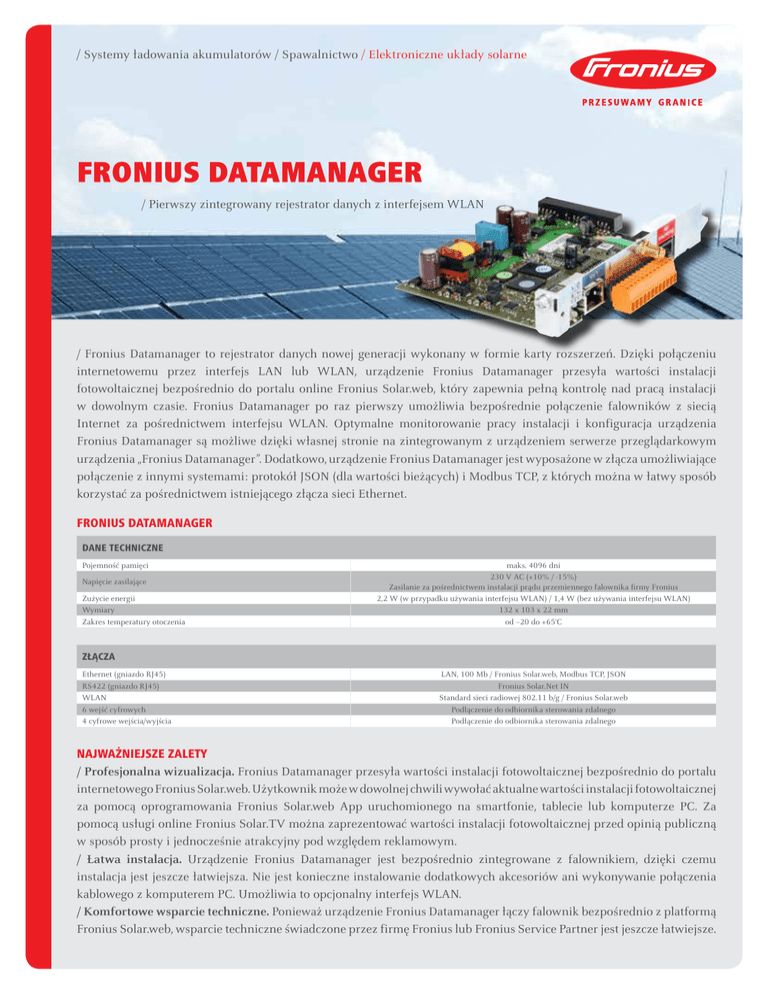 / Systemy ładowania akumulatorów / Spawalnictwo / Elektroniczne układy solarne FRONIUS DATAMANAGER / Pierwszy zintegrowany rejestrator danych z interfejsem WLAN / Fronius Datamanager to rejestrator danych nowej generacji wykonany w formie karty rozszerzeń. Dzięki połączeniu internetowemu przez interfejs LAN lub WLAN, urządzenie Fronius Datamanager przesyła wartości instalacji fotowoltaicznej bezpośrednio do portalu online Fronius Solar.web, który zapewnia pełną kontrolę nad pracą instalacji w dowolnym czasie. Fronius Datamanager po raz pierwszy umożliwia bezpośrednie połączenie falowników z siecią Internet za pośrednictwem interfejsu WLAN. Optymalne monitorowanie pracy instalacji i konfiguracja urządzenia Fronius Datamanager są możliwe dzięki własnej stronie na zintegrowanym z urządzeniem serwerze przeglądarkowym urządzenia „Fronius Datamanager”. Dodatkowo, urządzenie Fronius Datamanager jest wyposażone w złącza umożliwiające połączenie z innymi systemami: protokół JSON (dla wartości bieżących) i Modbus TCP, z których można w łatwy sposób korzystać za pośrednictwem istniejącego złącza sieci Ethernet. FRONIUS DATAMANAGER DANE TECHNICZNE Pojemność pamięci Napięcie zasilające Zużycie energii Wymiary Zakres temperatury otoczenia maks. 4096 dni 230 V AC (+10% / -15%) Zasilanie za pośrednictwem instalacji prądu przemiennego falownika firmy Fronius 2,2 W (w przypadku używania interfejsu WLAN) / 1,4 W (bez używania interfejsu WLAN) 132 x 103 x 22 mm od –20 do +65°C ZŁĄCZA Ethernet (gniazdo RJ45) RS422 (gniazdo RJ45) WLAN 6 wejść cyfrowych 4 cyfrowe wejścia/wyjścia LAN, 100 Mb / Fronius Solar.web, Modbus TCP, JSON Fronius Solar.Net IN Standard sieci radiowej 802.11 b/g / Fronius Solar.web Podłączenie do odbiornika sterowania zdalnego Podłączenie do odbiornika sterowania zdalnego NAJWAŻNIEJSZE ZALETY / Profesjonalna wizualizacja. Fronius Datamanager przesyła wartości instalacji fotowoltaicznej bezpośrednio do portalu internetowego Fronius Solar.web. Użytkownik może w dowolnej chwili wywołać aktualne wartości instalacji fotowoltaicznej za pomocą oprogramowania Fronius Solar.web App uruchomionego na smartfonie, tablecie lub komputerze PC. Za pomocą usługi online Fronius Solar.TV można zaprezentować wartości instalacji fotowoltaicznej przed opinią publiczną w sposób prosty i jednocześnie atrakcyjny pod względem reklamowym. / Łatwa instalacja. Urządzenie Fronius Datamanager jest bezpośrednio zintegrowane z falownikiem, dzięki czemu instalacja jest jeszcze łatwiejsza. Nie jest konieczne instalowanie dodatkowych akcesoriów ani wykonywanie połączenia kablowego z komputerem PC. Umożliwia to opcjonalny interfejs WLAN. / Komfortowe wsparcie techniczne. Ponieważ urządzenie Fronius Datamanager łączy falownik bezpośrednio z platformą Fronius Solar.web, wsparcie techniczne świadczone przez firmę Fronius lub Fronius Service Partner jest jeszcze łatwiejsze. Prosta wizualizacja 1 WLAN lub LAN FALOWNIK FIRMY FRONIUS ZE ZINTEGROWANYM MODUŁEM FRONIUS DATAMANAGER WLAN lub LAN 4 1. FRONIUS SOLAR.WEB / Na życzenie wszystkie dane są automatycznie przesyłane do platformy internetowej Fronius Solar.web. Dzięki temu, w dowolnym momencie za pośrednictwem sieci Internet można wywołać dane bieżące i archiwalne. 3. FRONIUS SOLAR.TV / Przy użyciu bezpłatnego portalu online Fronius Solar.TV można zaprezentować opinii publicznej liczne wartości instalacji fotowoltaicznej w sposób przejrzysty i atrakcyjny pod względem reklamowym. Wymagania: aktywne połączenie internetowe, przeglądarka internetowa (np. Microsoft Internet Explorer 9.0, Firefox 4 lub porównywalna), rejestracja instalacji fotowoltaicznej w portalu Fronius Solar.web. Wymagania: aktywne połączenie internetowe, przeglądarka internetowa (np. Microsoft Internet Explorer 9.0, Firefox 4 lub porównywalna), pełna obsługa JavaScript. 2. FRONIUS SOLAR.WEB APP / Mobilny wariant platformy Fronius Solar.web zapewnia dostęp do informacji dotyczących zysków energetycznych generowanych przez instalację fotowoltaiczną zawsze i wszędzie — nawet podczas podróży. Wymagania dla produktów firmy Apple: iPhone, iPod i iPad z zainstalowanym systemem operacyjnym iOS 4.2 lub nowszym. Wymagania dla smartfonów pracujących pod kontrolą systemu Android: Oprogramowanie: system Android 2.1 (Eclair) lub nowszy. 4. STRONA INTERNETOWA URZĄDZENIA FRONIUS DATAMANAGER: ZA POŚREDNICTWEM INTERFEJSU LAN LUB WLAN / Aby umożliwić błyskawiczny dostęp do informacji większej liczbie użytkowników obecnych w sieci lokalnej, urządzenie Fronius Datamanager udostępnia własną stronę internetową. Wymagania: przeglądarka internetowa (np. Microsoft Internet Explorer 9.0, Firefox 4 lub porównywalna), komputer PC / laptop obecne w tej samej sieci co urządzenie Fronius Datamanager (np. za pośrednictwem interfejsu LAN/WLAN). / W przypadku instalacji fotowoltaicznej wyposażonej w większą liczbę falowników potrzebne jest tylko jedno urządzenie Fronius Datamanager. W pozostałych falownikach wymagana jest funkcja Com Card (zintegrowana lub za pomocą Fronius Com Card). W przypadku instalacji fotowoltaicznych wyposażonych w jeden falownik, funkcja Com Card jest niepotrzebna. / Urządzenie Fronius Datamanager jest kompatybilne ze wszystkimi falownikami (z wyjątkiem Fronius IG TL i Fronius Agilo). W przypadku falowników Fronius Galvo i Fronius Symo urządzenie Fronius Datamanager jest zintegrowane standardowo. Już zainstalowane falowniki można w dowolnym momencie wyposażyć w urządzenie Fronius Datamanager. W zależności od falownika, należy zwracać uwagę na odpowiednią wersję urządzenia Fronius Datamanager. / Systemy ładowania akumulatorów / Spawalnictwo / Elektroniczne układy solarne DZIAŁAMY W TRZECH DZIEDZINACH, LECZ MAMY JEDNĄ PASJĘ: PRZESUWAMY GRANICE. / Niezależnie od tego, czy chodzi o systemy ładowania baterii, spawalnictw