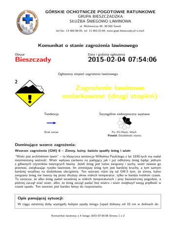 GÓRSKIE OCHOTNICZE POGOTOWIE RATUNKOWE GRUPA BIESZCZADZKA SŁUŻBA ŚNIEGOWO LAWINOWA ul. Mickiewicza 49, 38-500 Sanok tel/fax: 13 464-98-04, tel: 13 463-22-04, www.gopr.bieszczady.pl e-mail: Komunikat o stanie zagrożenia lawinowego Obszar Data i godzina ogłoszenia Bieszczady 2015-02-04 07:54:06 Ogłoszony stopień zagrożenia lawinowego Zagrożenie lawinowe umiarkowane (drugi stopień) Tendencja Szczególnie niebezpieczna wystawa Brak zmian Pn.-Pn.Wsch.-Wsch. Powód: Działalność wiatru Dominujące wzorce zagrożenia: Wzorzec zagrożenia (GM) 6 – Zimny, luźny, świeżo spadły śnieg i wiatr “Wiatr jest architektem lawin” – ta klasyczna sentencja Wilhelma Paulckego z lat 1930-tych ma nadal niezmienioną ważność. Wiatr wpływa zarówno na padający jak i już odłożony śnieg będąc jednym z głównych czynników tworzących lawiny. Jeżeli śnieg jest luźno związany i suchy, wiatr zawsze go przenosi, zwiększając ryzyko lawinowe. Im zimniejszy śnieg tym jest bardziej kruchy, a tym samym bardziej wrażliwy na dodatkowe obciążenia. Ten wzorzec różni się od GM.5 tym, że zimny, luźno związany śnieg nie tworzy się przez dłuższy okres niskich temperatur, tylko w bardzo krótkim czasie. To oznacza, że albo śnieg padał wcześniej w niskich temperaturach i przy bezwietrznej pogodzie, a później zaczął wiać wiatr, albo, że śnieg zaczął padać bez wiatru i wiatr zwiększył swoją prędkość w czasie opadu. Ten wzorzec jest bardzo łatwy do rozpoznania. Opis panującej sytuacji: W ciągu ostatniej doby wystąpiły kolejne opady śniegu (opad dobowy od 10 cm w dolinach do Komunikat lawinowy z 4 lutego 2015 07:54:06 Strona 1 z 2 ok. 15-20 cm w wyższych partiach gór) przy umiarkowanym wietrze z kierunku południowego i temperaturze oscylującej w granicach -4◦ C do -7◦ C. Zagrożenie lawinowe występuje w formacjach wklęsłych, lejach, stromych stokach o wystawie północnej i północno-wschodniej. Po ostatnich opadach pokrywa zbudowana z grubej warstwy śniegu przewianego i silnie sprasowanego. Lokalnie sprasowany śnieg uformował deski śnieżne, poniżej których znajduje się ok 2 cm warstwa znacząco słabiej związanego śniegu (CT0). Na tym znajduje się pokrywa ok. 20 cm śniegu świeżego z ostatniej doby. Stary, zmrożony śnieg, z którego zbudowane są dolne warstwy pokrywy wykazuje dość dużą stabilność. W grzbietowych partiach pokrywa zmienna, kształtująca się w granicach od 20 do 70 cm. Najwięcej śniegu znajduje się w miejscach odłożenia depozytów gdzie pokrywa osiąga grubość 120 cm lub więcej. Stoki południowe wywiane, na części obszaru pokrywa stabilizowana przez nieprzykrytą roślinność. Szlaki częściowo zasypane z utworzonymi przez wiatr zaspami utrudniającymi wędrowanie. Przysłup Caryński (780 m.n.p.m): całkowita pokrywa śniegu 44 cm, (4cm opadu za 24h), temperatura -4◦ C, bezwietrznie (godzina 8:00) Opis ogłoszonego stopnia według skali: Stabilność pokrywy śnieżnej: Pokrywa śnieżna jest umiarkowanie związana na niektórych stromych stokach na ogół jednak jest związana dobrze. Prawdopodobieństwo wyzwolenia (zejścia) lawiny: Wyzwolenie lawiny jest możliwe zwłaszcza przy dużym obciążeniu dodatkowym przede wszystkim na wskazanych stromych stokach. Nie należy spodziewać się samorzutnego schodzenia dużych lawin. Zalecenia dla ruchu osób: Częściowo niekorzystne warunki. Poruszanie się wymaga umiejętności oceny lokalnego zagrożenia lawinowego i odpowiedniego wyboru trasy szczególnie na wszystkich stromych stokach1, oraz na stokach średnio stromych1 szczególnie wskazanych pod względem wystawy i wysokości. Osoba odpowiedzialna Grupa odpowiedzialna Rząsa Wojciech Grupa Bieszczadzka Komunikat lawinowy z 4 lutego 2015 07:54:06 Strona 2 z 2 .