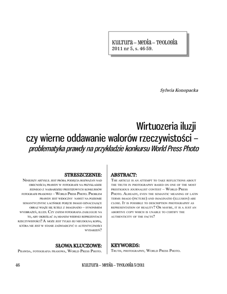 Kultura – Media – Teologia 2011 nr 5, s. 46-59. Sylwia Konopacka Wirtuozeria iluzji czy wierne oddawanie walorów rzeczywistości – problematyka prawdy na przykładzie konkursu World Press Photo STRESZCZENIE: ABSTRACT: NINIEJSZY ARTYKUŁ JEST PRÓBĄ PODJĘCIA ROZWAŻAŃ NAD THE ARTICLE IS AN ATTEMPT TO TAKE REFLECTIONS ABOUT OBECNOŚCIĄ PRAWDY W FOTOGRAFII NA PRZYKŁADZIE THE TRUTH IN PHOTOGRAPHY BASED ON ONE OF THE MOST JEDNEGO Z NAJBARDZIEJ PRESTIŻOWYCH KONKURSÓW PRESTIGIOUS JOURNALIST CONTEST FOTOGRAFII PRASOWEJ – WORLD PRESS PHOTO. PROBLEM PRAWDY JEST WIDOCZNY NAWET NA POZIOMIE SEMANTYCZNYM: ŁACIŃSKIE POJĘCIE IMAGO OZNACZAJĄCE OBRAZ WIĄŻE SIĘ ŚCIŚLE Z IMAGINATIO – SYNONIMEM WYOBRAŻEŃ, ILUZJI. CZY ZATEM FOTOGRAFIA ZASŁUGUJE NA TO, ABY OKREŚLAĆ JĄ MIANEM WIERNEJ REPREZENTACJI – WORLD PRESS PHOTO. ALREADY, EVEN THE SEMANTIC MEANING OF LATIN TERMS IMAGO (PICTURE) AND IMAGINATIO (ILLUSION) ARE CLOSE. IT IS POSSIBLE TO DESCRIPTION PHOTOGRAPHY AS REPRESENTATION OF REALITY? OR MAYBE, IT IS A JUST AN ABORTIVE COPY WHICH IS UNABLE TO CERTIFY THE AUTHENTICITY OF THE FACTS? RZECZYWISTOŚCI? A MOŻE JEST TYLKO JEJ NIEUDOLNĄ KOPIĄ, KTÓRA NIE JEST W STANIE ZAŚWIADCZYĆ O AUTENTYCZNOŚCI WYDARZEŃ? SŁOWA KLUCZOWE: PRAWDA, FOTOGRAFIA PRASOWA, WORLD PRESS PHOTO. 46 KEYWORDS: TRUTH, PHOTOGRAPHY, WORLD PRESS PHOTO. Kultura – Media – Teologia 5/2011 S. Konopacka, Wirtuozeria iluzji... D ominacja ikonosfery w dobie cywilizacji obrazu rodzi szereg pytań o charakter jej wpływu na ludzką percepcję. Hegemonia kultury wizualnej stanowi wyzwanie nie tylko dla kultury słowa, ale również i dla samego człowieka, znajdującego się w centrum uwagi środków społecznego przekazu. Stąd też tak bardzo istotne stają się pytania o jakość mediów wizualnych i o to, czy można je uznać za zdolne do podtrzymywania złudzenia o rzeczywistości, czy też nadać im miano wiernej kopii tego, co realne. Dokumentacja wydarzeń w fotografii prasowej staje naprzeciw wyzwaniu, jakim jest niewątpliwie prawda w obrazie fotograficznym, a podjęte rozważania skłaniają do dalszej refleksji nad problematyką prawdy we wszystkich mediach, nie tylko tych, które wykorzystują właściwości obrazu. Pojęcie wiarygodności przekazu jest związane nierozłącznie z człowiekiem jako nadawcą komunikatów medialnych, ale także jako ich odbiorcą, stąd też należy wyraźnie podkreślić jego rolę jako adresata, ale i twórcy mediów. Kwestia prawdy, rozumianej jako zgodność tego, co zwykło się uważać za ludzki intelekt, z tym, co określa się mianem stanu rzeczy, stanowi podstawę klasycznej inter pretacji rzeczywistości. Ale poglądy filozofów w stosunku do tego, co powinno być określane mianem prawdy, zmieniały się z każdą epoką. Czy w tym kontekście rzeczywiście należałoby rozpatrywać prawdę jako coś zmiennego, czy też jednak przyjąć ją jako jedyną stałą wartość we wszechświecie? Z odpowiedzią przychodzi nam w tym miejscu filozofia chrześcijańska. Jednak analizując chociażby podejście postmodernistyczne, warto zaznaczyć, że kładzie ono mocny akcent na wieloznaczność pojęcia prawdy i możliwość rozumienia go w sposób indywidualny, a niekoniecznie społeczny. Jak w takim sensie rozumieć prawdę? Co przyjmować za jej kryteria, w jaki sposób sprostać wyzwaniu, jakim niewątpliwie staje się jej rola w mediach i jak rozpatrywać w tym kontekście odpowiedzialność za fałszywy przekaz? Niniejszy artykuł będzie próbą odpowiedzi na powyższe pytania na przykładzie fotografii prasowej i jednego z najpopularniejszych konkursów wyróżniających publikowane zdjęcia – World Press Photo. Rodowodu terminu fotografia należy upatrywać w dwóch greckich wyrazach. Pierwszy z nich – fos – oznacza światło, natomiast drugi – grafo – tłumaczy się jako malowanie, stąd też przyjęło się określać proces wykonywania zdjęć jako „malowanie światłem”. Przyglądając się jednak temu zjawisku szerzej, należy określić je jako utrwalanie rzeczywistości przy użyciu fizyczno-chemicznych właściwości światła, czego przykładem jest chociażby camera obscura1. Nic jednak tak bardzo nie zrewolucjonizowało możliwości wiernego odtwarzania rzeczywistości jak niezależnie od siebie wynalezione w 1839 roku dagerotypia oraz talbotypia – dzięki którym możliwy był dalszy rozwój fotografii. Ze względu na fakt, iż fotografia wywodzi się z takich dziedzin nauki jak fizyka i chemia, początkowo budziła ona duże kontrowersje związane z kwestią wiernego re1 Działanie tej prowizorycznej ciemni optycznej, wykorzystywanej z powodzeniem w malarstwie, zostało opisane ok. 1000 roku przez Al-Hasana. Odkrycie wynalazku jest przypisywane przez niektórych znawców fotografii G. della Porcie. Por. T. Goban-Klas, Zarys historii i rozwoju mediów od malowideł naskalnych do multimediów, Kraków 2001, s. 24. Inne stanowisko w tym zakresie przedstawia W. Żdżarski, który uważa, że camera obscura wynalazł L. da Vinci. Por. W. Żdżarski, Zaczęło się od Daguerre'a. Szkice z dziejów fotografii XIX w., Warszawa 1977, s. 41. Kultura – Media – Teologia 5/2011 47 „ PRAWDA W MEDIACH? Fotografia również wzbudzała szereg wątpliwości co do problemu artystycznej interpretacji świata. Szczególnie często podejmowano dyskusje na temat tego, czy fotografia zasługuje na określenie jej mianem sztuki. Wcześniej bowiem sztukę rozumiano m.in. według kryterium podobieństwa pomiędzy np. malarskością obrazu a rzeczywistością. prezentowania rzeczywistości, czego wyrazem są wieloletnie antagonizmy pomiędzy nią a malarstwem. Fotografia również wzbudzała szereg wątpliwości co do problemu ar tystycznej interpretacji świata. Szczególnie często podejmowano dyskusje na temat tego, czy fotografia zasługuje na określenie jej mianem sztuki. Wcześniej bowiem sztukę rozumiano m.in. według kryterium podobieńs