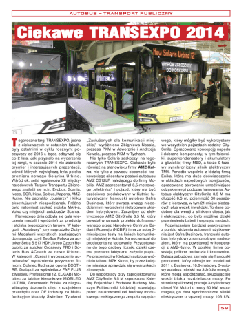 AUTOBUS – TR ANSPORT PUBLICZNY TRANSPORT Ciekawe TRANSEXPO 2014 T egoroczne targi TRANSEXPO, jedne z ciekawszych w ostatnich latach, były ostatnimi w cyklu rocznym: począwszy od 2016 r. będą odbywać się co 2 lata. Jak przystało na wydarzenie tej rangi, w sezonie 2014 nie zabrakło premier i interesujących prezentacji, wśród których największą była polska premiera nowego Solarisa Urbino. Wśród ok. setki wystawców XII Międzynarodowych Targów Transportu Zbiorowego znaleźli się m.in. Evobus, Scania, Iveco, SOR, Irizar, Solbus, Kapena, AMZKutno. Nie zabrakło „busiarzy” i kilku ekscytujących niespodzianek. Próżno było natomiast szukać stoiska MAN-a, Volvo czy miejskich autobusów Scania. Pierwszego dnia odbyła się gala wręczenia medali i wyróżnień za produkty i stoiska tegorocznych targów. W kategorii „Autobusy” jury nagrodziło Złotymi Medalami wszystkich startujących do nagrody, czyli EvoBus Polska za autokar Setra S 517 HDH, Iveco Czech Republic za autokar Crossway PRO i Solaris Bus &Coach za nowe Urbino. W kategorii „Części i wyposażenie autobusów” wyróżnienia przyznano firmom: Colmec Rudna za oponę ECOTIRE, Drabpol za wyświetlacz FAP PLUS z MultiViu Professional 12, EL-CAB i Mobitec za tablice kierunkowe MOBILED ULTIMA, Groeneveld Polska za niegrawitacyjny dozownik oleju z czujnikiem przechyłu oraz OE Industry za Multifunkcyjne Moduły Świetlne. Tytułami „Zasłużonych dla komunikacji miejskiej” wyróżniono Zbigniewa Nosala, prezesa PKM w Jaworznie i Andrzeja Kowola, prezesa PKM w Tychach. Nie tylko Solaris zaskoczył na tegorocznych TRANSEXPO. Ciekawie było również na stanowisku firmy AMZ-Kutno, nie tylko z powodu obecności krakowskiego akcentu w postaci autobusu AMZ CS12LF, należącego do firmy Mobilis. AMZ zaprezentował 8,5-metrowego „elektryka” i pojazd, który ma być częściowo produkowany w Kutnie: futurystyczny francuski autobus Safra Businova, który zwraca uwagę niecodziennym wyglądem i nietypowym układem hybrydowym. Zacznijmy od elektrycznego AMZ CitySmile 8,5 M, który powstał w ramach projektu dofinansowanego przez Narodowe Centrum Badań i Rozwoju (NCBiR) i ma za sobą 3miesięczne testy na liniach komunikacji miejskiej w Kutnie. Na noc wracał do producenta na ładowanie. Przygotowano do tego osobny licznik, dzięki czemu poznano faktyczne zużycie prądu. Po prezentacji w Kielcach autobus wróci do taboru MZK Kutno, by przez kolejne miesiące sprawdzić się w warunkach zimowych. Do współpracy przy zaprojektowaniu AMZ CitySmile 8,5 M zaproszono Katedrę Pojazdów i Podstaw Budowy Maszyn Politechniki Łódzkiej, stawiając przed naukowcami cel budowy modułowego elektrycznego zespołu napędo- wego, który mógłby być wykorzystany we wszystkich pojazdach rodziny CitySmile. Opracowano koncepcję napędu i dobrano komponenty, w tym falowniki, superkondensatory i akumulatory z gliwickiej firmy MBD, a także 9-fazowy synchroniczny silnik elektryczny TM4. Ponadto wspólnie z łódzką firmą Enika, która ma duże doświadczenie w układach napędowych trolejbusów, opracowano sterowanie umożliwiające odzysk energii podczas hamowania. Autobus elektryczny CitySmile 8,5 M ma długość 8,5 m, pojemność 60 pasażerów z kierowcą, w tym 21 miejsc siedzących plus wózek inwalidzki. To dane podobne dla wersji z silnikiem diesla, jak i elektrycznej, co było możliwe dzięki przeniesieniu baterii i osprzętu na dach. Rozwiązaniem bardziej praktycznym z punktu widzenia autonomii użytkowania jest Safra Businova, francuski autobus hybrydowy z samonośnym nadwoziem, który ma powstawać w kooperacji z AMZ-Kutno. W polskiej firmie powstają próbne podwozia i kratownice. Dalszą zabudową zajmuje się francuski producent, który oferuje ten model od 2011 r. Businova, 10,6-metrowy, 3-osiowy autobus miejski ma 3 źródła energii, które mogą współdziałać, skupiając się wokół bloku rozdzielacza mocy. Po stronie spalinowej pracuje 3-cylindrowy diesel VM Motori o mocy 60 kW, wspomagają go dwa synchroniczne silniki elektryczne o łącznej mocy 103 kW. 59 AUTOBUS – TR ANSPORT PUBLICZNY TRANSPORT Rekordowa sprzedaż autobusów dla firmy Mobilis Kraków i opracowanie rodziny elektrobusów o długości 8,5, 10 i 12 m to milowe kroki w historii AMZ-Kutno. CitySmile 12 LF w krakowskich barwach wyposażono w 6,7-litrowy silnik Cummins o mocy 285 KM, „elektryka” napędza synchroniczny silnik elektryczny o mocy ciągłej 155 kW i szczytowej 230 kW, chłodzony cieczą. Źródłem prądu są akumulatory o pojemności 175 kWh. Wkrótce oferta autobusów elektrycznych AMZ powiększy się o model przegubowy. Jest jeszcze silnik hydrauliczny: razem zespół napędowy może wygenerować 280 KM. Energia elektryczna do napędu może być wytwarzana przez silnik spalinowy, jak też pozyskiwana z sieci elektrycznej. Następnie jest ona magazynowana w akumulatorach o pojemności 90 kWh, z których zasilane silniki elektryczne. W efekcie takiego skomplikowania układu napędowego otrzymujemy zużycie paliwa na poziomie 15 l/100 km. Podobnie nietypowe jest wnętrze pojazdu, przypominające raczej salonkę z podniesioną tylną częścią pokładu pasażerskiego niż autobusy miejskie. Łącznie pojazd może przewozić 83 pasażerów i jest może praktyczny, ale wygląd ma mocno dyskusyjny. Prezentowany egzemplarz można spotkać na ulicach Tuluzy. Autosan kontynuuje produkcję pomimo upadłości, pod rządami syndyka. Wszyscy trzymają kciuki za wyjście na prostą przedsiębiorstwa ze 180-letnimi tradycjami. Firma pokazała dwa niskopodłogowe autobusy miejskie: 10-metrowy Sancity 10LF i 12-metrowy Sancity 12LF. W obu zamontowano silniki Cummins o mocy 280 KM. Pojazdy targowe wyposażono w 4-biegowe, automatyczne skrzynie Voith Diwa.6, przednie osie i tylne mosty ZF i zawieszenia pneumatyczne z systemem ECAS. Dodatkowo w Sancity 12LF zamontowano alkobloker, system monitorowania stref dookoła autobusu ProViu i