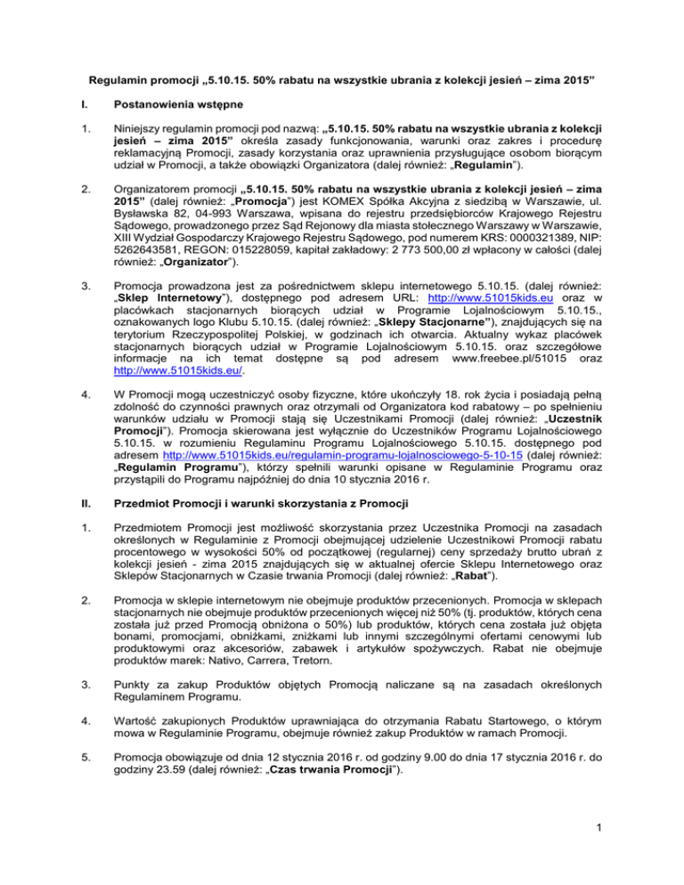 Regulamin promocji „5.10.15. 50% rabatu na wszystkie ubrania z kolekcji jesień – zima 2015” I. Postanowienia wstępne 1. Niniejszy regulamin promocji pod nazwą: „5.10.15. 50% rabatu na wszystkie ubrania z kolekcji jesień – zima 2015” określa zasady funkcjonowania, warunki oraz zakres i procedurę reklamacyjną Promocji, zasady korzystania oraz uprawnienia przysługujące osobom biorącym udział w Promocji, a także obowiązki Organizatora (dalej również: „Regulamin”). 2. Organizatorem promocji „5.10.15. 50% rabatu na wszystkie ubrania z kolekcji jesień – zima 2015” (dalej również: „Promocja”) jest KOMEX Spółka Akcyjna z siedzibą w Warszawie, ul. Bysławska 82, 04-993 Warszawa, wpisana do rejestru przedsiębiorców Krajowego Rejestru Sądowego, prowadzonego przez Sąd Rejonowy dla miasta stołecznego Warszawy w Warszawie, XIII Wydział Gospodarczy Krajowego Rejestru Sądowego, pod numerem KRS: 0000321389, NIP: 5262643581, REGON: 015228059, kapitał zakładowy: 2 773 500,00 zł wpłacony w całości (dalej również: „Organizator”). 3. Promocja prowadzona jest za pośrednictwem sklepu internetowego 5.10.15. (dalej również: „Sklep Internetowy”), dostępnego pod adresem URL: http://www.51015kids.eu oraz w placówkach stacjonarnych biorących udział w Programie Lojalnościowym 5.10.15., oznakowanych logo Klubu 5.10.15. (dalej również: „Sklepy Stacjonarne”), znajdujących się na terytorium Rzeczypospolitej Polskiej, w godzinach ich otwarcia. Aktualny wykaz placówek stacjonarnych biorących udział w Programie Lojalnościowym 5.10.15. oraz szczegółowe informacje na ich temat dostępne są pod adresem www.freebee.pl/51015 oraz http://www.51015kids.eu/. 4. W Promocji mogą uczestniczyć osoby fizyczne, które ukończyły 18. rok życia i posiadają pełną zdolność do czynności prawnych oraz otrzymali od Organizatora kod rabatowy – po spełnieniu warunków udziału w Promocji stają się Uczestnikami Promocji (dalej również: „Uczestnik Promocji”). Promocja skierowana jest wyłącznie do Uczestników Programu Lojalnościowego 5.10.15. w rozumieniu Regulaminu Programu Lojalnościowego 5.10.15. dostępnego pod adresem http://www.51015kids.eu/regulamin-programu-lojalnosciowego-5-10-15 (dalej również: „Regulamin Programu”), którzy spełnili warunki opisane w Regulaminie Programu oraz przystąpili do Programu najpóźniej do dnia 10 stycznia 2016 r. II. Przedmiot Promocji i warunki skorzystania z Promocji 1. Przedmiotem Promocji jest możliwość skorzystania przez Uczestnika Promocji na zasadach określonych w Regulaminie z Promocji obejmującej udzielenie Uczestnikowi Promocji rabatu procentowego w wysokości 50% od początkowej (regularnej) ceny sprzedaży brutto ubrań z kolekcji jesień - zima 2015 znajdujących się w aktualnej ofercie Sklepu Internetowego oraz Sklepów Stacjonarnych w Czasie trwania Promocji (dalej również: „Rabat”). 2. Promocja w sklepie internetowym nie obejmuje produktów przecenionych. Promocja w sklepach stacjonarnych nie obejmuje produktów przecenionych więcej niż 50% (tj. produktów, których cena została już przed Promocją obniżona o 50%) lub produktów, których cena została już objęta bonami, promocjami, obniżkami, zniżkami lub innymi szczególnymi ofertami cenowymi lub produktowymi oraz akcesoriów, zabawek i artykułów spożywczych. Rabat nie obejmuje produktów marek: Nativo, Carrera, Tretorn. 3. Punkty za zakup Produktów objętych Promocją naliczane są na zasadach określonych Regulaminem Programu. 4. Wartość zakupionych Produktów uprawniająca do otrzymania Rabatu Startowego, o którym mowa w Regulaminie Programu, obejmuje również zakup Produktów w ramach Promocji. 5. Promocja obowiązuje od dnia 12 stycznia 2016 r. od godziny 9.00 do dnia 17 stycznia 2016 r. do godziny 23.59 (dalej również: „Czas trwania Promocji”). 1 6. Udział w Promocji jest dobrowolny i bezpłatny (tzn. zakup Produktów w ramach Promocji nie wymaga poniesienia przez Uczestnika Promocji dodatkowych kosztów poza uiszczeniem ceny Produktów podlegających Promocji oraz kosztów dostawy – w przypadku Sklepu Internetowego). 7. Aby wziąć udział w Promocji, należy: a. w przypadku Sklepu Internetowego: złożyć w Czasie trwania Promocji Zamówienie obejmujące co najmniej jeden Produkt objęty Promocją oraz przed złożeniem Zamówienia – zalogować się lub zarejestrować nowe konto, w sekcji Twój Koszyk – wpisać numer Karty Klubu 5.10.15. (Karty Freebee) w przeznaczonym do tego miejscu oraz nacisnąć przycisk DODAJ KARTĘ. zaznaczyć pole „Posiadam kod rabatowy”, wpisać otrzymany przez Uczestnika Promocji od Organizatora kod uprawniający do wykorzystania Rabatu oraz nacisnąć przycisk OBLICZ RABAT. Przekazanie przez Uczestnika Promocji kodu uprawniającego do wykorzystania Rabatu lub numeru Karty Klubu 5.10.15. (Karty Freebee) po złożeniu Zamówienia nie uprawnia do wykorzystania Rabatu. b. w przypadku Sklepów Stacjonarnych – dokonać zakupu co najmniej jednego Produktu objętego Promocją, okazać Kartę Klubu 5.10.15. lub Kartę Freebee (w tym mobilną Kartę Freebee) oraz poinformować pracownika Sklepu Stacjonarnego o chęci wykorzystania Rabatu przed rozpoczęciem transakcji (tj. przed rozpoczęciem skanowania Produktów przez pracownika Sklepu Stacjonarnego). Okazanie Karty Klubu 5.10.15. lub Karty Freebee lub wyrażenie chęci skorzystania z Rabatu po rozpoczęciu skanowania Produktów lub po dokonaniu zapłaty za Produkty nie uprawnia do wykorzystania Rabatu. c. zarówno w przypadku Sklepu Internetowego, jak i Sklepów Stacjonarnych – zapoznać się i zaakceptować Regulamin. 8. Promocja nie łączy się z innymi promocjami, upustami, rabatami, obniżkami, akcjami promocyjnymi, szczególnymi ofertami cenowymi lub produktowymi, które obowiązują w Sklepie Internetowym lub w Sklepach Stacjonarnych, chyba że warunki takiej promocji, upustu, rabatu, ob