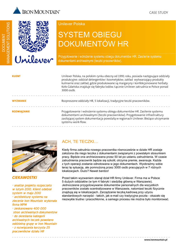CASE STUDY DOCUMENT MANAGEMENT SOLUTIONS Unilever Polska SYSTEM OBIEGU DOKUMENTÓW HR Przygotowanie i wdrożenie systemu obiegu dokumentów HR. Zasilenie systemu dokumentami archiwalnymi (teczki pracowników). KLIENT Unilever Polska, na polskim rynku obecny od 1991 roku, posiada następujące oddziały produkcyjne: oddział detergentów i kosmetyków; zakład wytwarzający produkty kulinarne oraz zakład, gdzie produkowane są margaryny i konfekcjonowane herbaty. Koło Gdańska znajduje się fabryka lodów. Łącznie Unilever zatrudnia w Polsce ponad 3000 osób. WYZWANIE Rozproszone oddziały HR, 5 lokalizacji, tradycyjne teczki pracowników. ROZWIĄZANIE Przygotowanie i wdrożenie systemu obiegu dokumentów HR. Zasilenie systemu dokumentami archiwalnymi (teczki pracowników). Przygotowanie infrastruktury zasilającej system dokumentacja powstałą w regionach Unilever. Bieżące utrzymanie systemu work-flow. Ach, te teczki… Kiedy firma zatrudnia nowego pracownika równocześnie w dziale HR zostaje założona dla niego teczka z dokumentami związanymi z powstałym stosunkiem pracy. Będzie ona archiwizowana przez 50 lat po ustaniu zatrudnienia. W czasie zatrudnienia pracownik będzie się szkolił, otrzyma premie, awansuje. Każda z tych operacji zostanie odnotowana w jego dokumentach. Wyobraźmy sobie teraz tę sytuację, ale pomnożoną przez 3000 osób pracujących w 7 różnych lokalizacjach. Dużo? Nawet bardzo! Ciekawostki - analizę projektu rozpoczęto w lutym 2010, Klient odebrał system w maju 2010 - architekturę systemu na zlecenie Iron Mountain wykonała firma MPM - zeskanowano 400 000 stron archiwalnych dokumentów - do określania kategorii archiwalnych teczek powołano oddzielną grupę w Iron Mountain - z rozwiązania korzysta 25 pracowników działu HR Przed takim wyzwaniem stanął dział HR firmy Unilever. Firma ma w Polsce 5 dużych oddziałów (w tym 4 fabryki i siedzibę główną w Warszawie). Jednoczesne przygotowywanie dokumentów personalnych dla wszystkich pracowników zostało scentralizowane w Warszawie, natomiast teczki fizycznie znajdują się w lokalizacjach. Zarządzanie teczką kadrową przy użyciu standardowych narzędzi - takich, jak e-mail czy tradycyjna poczta - okazało się niezwykle trudne i pracochłonne, a samego procesu nie można było monitorować. www.ironmountain.pl Unilever Polska Wirtualna teczka Od papieru do pikseli Zespół analityków Iron Mountain podczas warsztatów z pracownikami działu HR Unilever przygotował dokumentację przedwykonawczą projektu. Opisano bieżący proces zarządzania teczką kadrową pracownika. Po odebraniu dokumentacji analitycznej przez Unilever, opisane założenia zostały zamodelowane w systemie Workflow. Każda czynność procesowa, dotychczas odbywająca się na dokumentacji papierowej, mogła być wykonywana za pomocą systemu, na zeskanowanych obrazach dokumentów, opisanych zestawem atrybutów. Równolegle z pracami polegającymi na wdrożeniu systemu work-flow, w Centrum Przetwarzania Danych IM uruchomiona została digitalizacja obecnych zasobów dokumentacji HR Unilever. Wszystkie teczki kadrowe, z 5 lokalizacji rozmieszczonych w całej Polsce, zostały zgodnie z uzgodnionym harmonogramem odebrane od klienta i zeskanowane. Sam proces skanowania zawierał w sobie kategoryzację na kilkadziesiąt typów dokumentów oraz opisanie każdego dokumentu zestawem kilku indeksów merytorycznych. Zeskanowane dokumenty zostały zaimportowane do systemu work-flow, a oryginały – po przywróceniu do formy pierwotnej - zwrócono do Unilever. System jest zasilany na bieżąco dokumentami powstającymi w organizacji przez komórki HR w każdym oddziale firmy. Jak obecnie wygląda proces? Przy rekrutacji dokumenty pracownika są skanowane i umieszczane w teczce wirtualnej. Poza skanami (np. świadectwa ukończenia studiów, świadectwa pracy, zaświadczenia o przebytych szkoleniach itp.) w teczce znajdują się też wypełnione formularze elektroniczne. Cała teczka zostaje umieszczona w systemie work-flow Klienta i przesyłana jest do centralnego działu HR. Na podstawie zeskanowanych dokumentów centralny zespół HR wprowadza dane do systemu kadrowo-płacowego oraz przygotowuje umowę o pracę. Przygotowane dokumenty za pomocą work-flow przesyłane są do akceptacji koordynatorów, a następnie do wydruku do fabryk. Po skompletowaniu i akceptacji, teczka jest dostępna dla uprawnionych osób z poziomu pulpitu. Zbiór teczek pracowniczych nie jest statycznym archiwum. Jest żyjącym systemem pozwalającym na ciągłą pracę. Minimalizuje pracę „papierkową” i utrzymuje wysoki poziom kultury pracy. Cały proces jest monitorowany, dostarcza raporty wg żądanych kryteriów, eliminuje „przetrzymanie” dokumentów lub decyzji dzięki informacji, kto jest właścicielem dokumentu w danym momencie. Daje możliwość przypomnienia o istniejącym zadaniu lub – w razie potrzeby – wyśle informację o ponagleniu. Korzyści Po wdrożeniu i zasileniu systemu dokumentami Klient zyskał aktywną, przyrastającą z czasem, bazę dokumentacji oraz platformę pozwalającą na obieg i zdalne zarządzanie dokumentacją HR w korporacji - we wszystkich lokalizacjach. Może monitorować zadania w każdym ze swoich działów i dzięki temu lepiej organizować pracę. Ma pełną kontrolę nad procesem. System workflow jest hostowany na zasobach informatycznych Iron Mountain, w modelu SaaS. Dzięki temu klient zyskuję gwarancję niezawodności oraz bezpieczeństwa, jednocześnie nie ponosząc żadnych dodatkowych kosztów inwestycyjnych. Iron Mountain Polska Sp. z o.o. WARSZAWA ul. Regulska 2 Reguły k/Warszawy 05-820 Piastów 2010 Iron Mountin Incorporated. Wszelkie prawa zastrzeżone. Nazwa Iron Mountain i symbol góry są zastrzeżonymi znakami towarowymi firmy Iron Mountain Incorporated. Wszelkie inne znaki towarowe są własnością odpowiednich firm. Tel: 22 753 61 41 Fax: 22 753 61 42 Iron Mountain prowadzi d