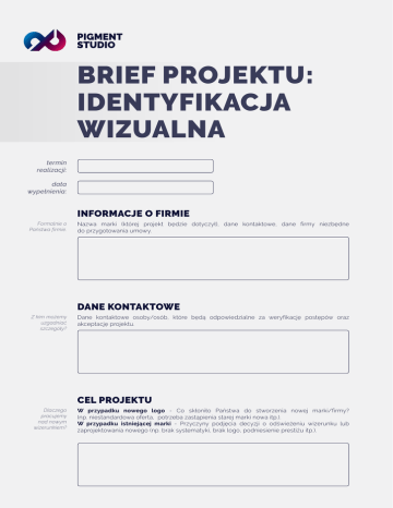 PIGMENT STUDIO BRIEF PROJEKTU: Identyfikacja wizualna termin realizacji: data wypełnienia: INFORMACJE O FIRMIE Formalnie o Państwa firmie. Nazwa marki (której projekt będzie dotyczył), dane kontaktowe, dane firmy niezbędne do przygotowania umowy. DANE KONTAKTOWE Z kim możemy uzgadniać szczegóły? Dane kontaktowe osoby/osób, które będą odpowiedzialne za weryfikację postępów oraz akceptację projektu. CEL PROJEKTU Dlaczego pracujemy nad nowym wizerunkiem? W przypadku nowego logo - Co skłoniło Państwa do stworzenia nowej marki/firmy? (np. niestandardowa oferta, potrzeba zastąpienia starej marki nowa itp.). W przypadku istniejącej marki - Przyczyny podjęcia decyzji o odświeżeniu wizerunku lub zaprojektowania nowego (np. brak systematyki, brak logo, podniesienie prestiżu itp.). STRONA: 1 /3 PRZEKAZ Jakie wartości che przekazać Państwa firma? Jakie komunikaty o firmie ma ilustrować logo/identyfikacja wizualna? Proszę opisać za pomocą przymiotników np.: • profesjonalizm, doświadczenie, nowoczesność, bezpieczeństwo. GRUPA DOCELOWA Do kogo kierują Państwo swoją ofertę? Kim są Państwa klienci? Jakimi wartościami się kierują? Opis Core Target, czyli grupa osób, na którą logo będzie miało bezpośredni wpływ (obecni, przyszli klienci, partnerzy biznesowi). SYMBOLE Jakie symbole chcą Państwo umieścić w logo? Symbole jakie powinny być zawarte w logo. Przykładowo firma kurierska w swoim logo przedstawia wizerunek paczki. Nie jest to wymóg konieczny, logo może opierać się jedynie na przekazie wartości niematerialnych. PRACA KREATYWNA Wytyczne oraz uwagi od strony graficznej projektu. Wymagania graficzne dotyczące projektu (jeśli nie ma, prosimy o informacje =Czy pozostawiają nam Państw wolną rękę w kreacji wizerunku?). Przykładowe wytyczne: • Logo – w jakim kolorze, jednobarwne czy też wielobarwne, składające się z sygnetu, logotypu, czy z obu elementów, informacje o firmowym tagline. (logotyp - jest to napis, sygnet - jest to znak graficzny). • Identyfikacja wizualna – główna kolorystyka, niezbędne elementy, ilość projektów itp. STRONA: 2 /3 ZAKRES PRACY ORAZ BUDŻET Jakich projektów Państwo potrzebują? Zakres pracy do wykonania. Są to informacje niezbędne do wyceny. • ilość propozycji logo jaką Państwo chcą otrzymać. • Co ma zawierać identyfikacja wizualna firmy? ( wizytówki, papier firmowy, płyty CD/DVD, oznakowanie samochodu, identyfikatory, tablice informacyjne itp. ). W przypadku gdy budżet na realizację jest ściśle określony, dostosujemy zakres najpotrzebniejszych w naszej ocenie usług. UWAGI Informacje, które nie pojawiły się wcześniej. Możliwość wskazania istniejących projektów, które zwróciły Państwa uwagę i mogą być przydatne. DZIĘKUJEMY ZA WYPEŁNIENIE. PROSIMY O WYSŁANIE ZAPISANEGO PLIKU NA: [email protected] www.pigmentstudio.pl WYDRUK STRONA: 3 /3