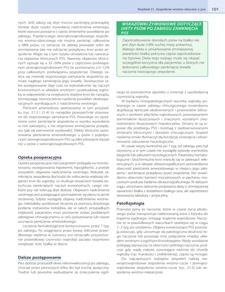 nych. Jeśli założy się zbyt mocno zaciśniętą przewiązkę, istnieje duże ryzyko wywołania nadciśnienia wrotnego, które stanowi poważne i często śmiertelne powikłanie po zabiegu. Pojedynczego zewnątrzwątrobowego zespolenia wrotno-obocznego nie można zamknąć całkowicie u 68% psów, co oznacza, że zabieg prowadzi tylko do zmniejszenia (ale nie odcięcia) przepływu krwi przez zespolenie. Wiąże się z tym ryzyko utrwalenia lub nawracania objawów klinicznych PSS. Nawroty objawów klinicznych opisuje się u 32–50% psów z częściowo podwiązanym zewnątrzwątrobowym PSS (w porównaniu z 0–12% przy całkowitym podwiązaniu zespolenia). Dlatego zaleca się metodę stopniowego zamykania zespolenia zamiast nagłego zamknięcia jego światła. Teoretycznie takie postępowanie daje czas na wykształcenie się naczyń krwionośnych w układzie wrotnym i przebudowę wątroby w odpowiedzi na zwiększony dopływ krwi do narządu, zmniejszając równocześnie nasilenie powikłań okołooperacyjnych wynikających z nadciśnienia wrotnego. Pierścień ameroidowy zastosowany w tym przypadku (ryc. 21.3 i 21.4) to narzędzie powszechnie stosowane do stopniowego zamykania PSS. Powoduje on opóźnione ostre zamknięcie zespolenia w wyniku wywołania w nim zakrzepicy, a nie stopniowe zmniejszenie przepływu (jak się pierwotnie wydawało). Efekty kliniczne zastosowania pierścienia ameroidowego u psów z pojedynczym zewnątrzwątrobowym PSS są zdecydowanie lepsze niż u psów z wewnątrzwątrobowym PSS. Opieka pooperacyjna Opieka pooperacyjna nad pacjentem polegała na monitorowaniu występowania hipotermii, hipoglikemii, a przede wszystkim objawów nadciśnienia wrotnego. Wskutek zamknięcia zespolenia dochodzi do wtłoczenia większej objętości krwi do wątroby, co skutkuje otwarciem światła dotychczas zamkniętych naczyń krwionośnych, czego niektóre psy nie tolerują zbyt dobrze. Objawem nadciśnienia wrotnego jest postępujące gromadzenie się płynu w jamie otrzewnej. Gdyby wystąpiły objawy nadciśnienia wrotnego, należałoby spróbować leczenia za pomocą dożylnego podania roztworów koloidów, ale w takich przypadkach większość pacjentów musi ponownie zostać poddanych zabiegowi chirurgicznemu w celu poluzowania lub nawet usunięcia pierścienia ameroidowego. Leczenie farmakologiczne kontynuowano przez 7 tyg. po zabiegu. Po osiągnięciu przez kwasy żółciowe prawidłowego stężenia w surowicy (co oznaczało przywrócenie prawidłowej czynności wątroby) zaczęto stopniowo zwiększać ilość białka w diecie. Dalsze postępowanie Pies dobrze przeszedł okres rekonwalescencji po zabiegu, chociaż przez pierwszych kilka dni był trochę apatyczny. Trudne lub powolne wybudzanie ze znieczulenia ogól- Rozdział 21. Zespolenie wrotno-oboczne u psa WSKAZÓWKI ŻYWIENIOWE DOTYCZĄCEi DIETY PSÓW PO ZABIEGU ZAMKNIĘCIA PSS Zapotrzebowanie dorosłych psów na białko nie jest zbyt duże (18% suchej masy pokarmu), dlatego dieta o umiarkowanie zmniejszonej zawartości białka pokrywa często zapotrzebowanie bytowe. Dieta tego rodzaju może się okazać szczególnie korzystna dla pacjentów, u których nie dokonano całkowitego zamknięcia światła naczynia tworzącego zespolenie. nego to powszechne zjawisko u zwierząt z upośledzoną czynnością wątroby. W badaniu histopatologicznym wycinka wątroby pobranego w czasie zabiegu chirurgicznego stwierdzono duplikację tętniczek okołowrotnych i przewodów żółciowych z zanikiem płacików wątrobowych, powstawaniem ziarniniaków tłuszczowych i znacznym, rozsianym zwyrodnieniem tłuszczowym hepatocytów. Zmiany te są typowe dla przebiegu PSS i korelują z zaobserwowanymi zmianami klinicznymi i obrazem chirurgicznym. Stopień nasilenia zmian tłumaczył złą kondycję zwierzęcia i obserwowane zaburzenia neurologiczne. W czasie wizyty kontrolnej po 7 tyg. od zabiegu pies był ożywiony, a w tym czasie nie wystąpiły epizody wymiotów, biegunki lub zaburzeń neurologicznych. Parametry hematologiczne i biochemiczne krwi mieściły się w zakresach referencyjnych, a w obrazie ultrasonograficznym potwierdzono obecność pierścienia ameroidowego w miejscu jego założenia i zamknięcie przepływu przez zespolenie. Nie stwierdzono obecności kamieni moczanowych w pęcherzu moczowym podczas badania ultrasonograficznego. W dalszym ciągu utrzymano zalecenie podawania diety o zmniejszonej zawartości białka z dodatkiem białego sera, ale zaprzestano stosowania laktulozy i ampicyliny. Patofizjologia Przewód żylny to naczynie, które w czasie życia płodowego psów transportuje natlenowaną krew z łożyska do krążenia ogólnego, omijając krążenie wątrobowe. Naczynie to w prawidłowych warunkach zasklepia się w ciągu 1–2 tyg. po urodzeniu. Objawy towarzyszące PSS powstają wówczas, gdy utrzymuje się patologiczna drożność tego naczynia lub powstaje inne połączenie między układem wrotnym a ogólnym krwiobiegiem. Wady wrodzone polegają zazwyczaj na obecności jednego naczynia, podczas gdy wady nabyte, powstające wtórnie do chorób wątroby (np. marskości i zwłóknienia), często są mnogie. Do najczęstszych rodzajów zespoleń należą wewnątrzwątrobowe zespolenia wrotno-czcze i zewnątrzwątrobowe zespolenia wrotno-czcze (ryc. 21.5) lub zespolenia wrotno-nieparzyste. 101