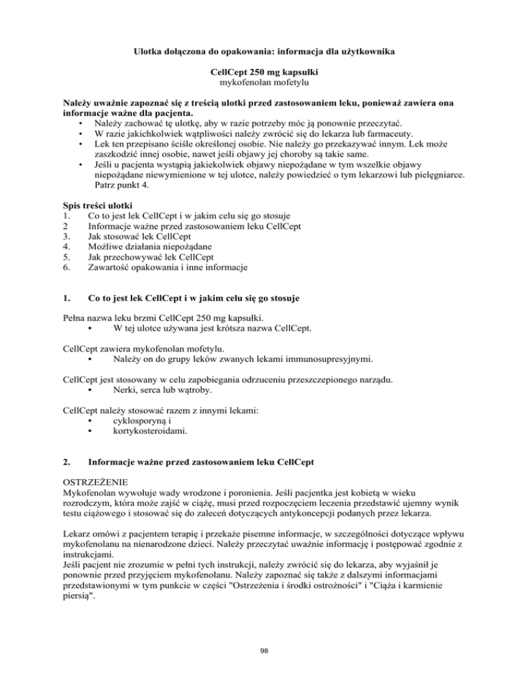 Ulotka dołączona do opakowania: informacja dla użytkownika CellCept 250 mg kapsułki mykofenolan mofetylu Należy uważnie zapoznać się z treścią ulotki przed zastosowaniem leku, ponieważ zawiera ona informacje ważne dla pacjenta. • Należy zachować tę ulotkę, aby w razie potrzeby móc ją ponownie przeczytać. • W razie jakichkolwiek wątpliwości należy zwrócić się do lekarza lub farmaceuty. • Lek ten przepisano ściśle określonej osobie. Nie należy go przekazywać innym. Lek może zaszkodzić innej osobie, nawet jeśli objawy jej choroby są takie same. • Jeśli u pacjenta wystąpią jakiekolwiek objawy niepożądane w tym wszelkie objawy niepożądane niewymienione w tej ulotce, należy powiedzieć o tym lekarzowi lub pielęgniarce. Patrz punkt 4. Spis treści ulotki 1. Co to jest lek CellCept i w jakim celu się go stosuje 2 Informacje ważne przed zastosowaniem leku CellCept 3. Jak stosować lek CellCept 4. Możliwe działania niepożądane 5. Jak przechowywać lek CellCept 6. Zawartość opakowania i inne informacje 1. Co to jest lek CellCept i w jakim celu się go stosuje Pełna nazwa leku brzmi CellCept 250 mg kapsułki. • W tej ulotce używana jest krótsza nazwa CellCept. CellCept zawiera mykofenolan mofetylu. • Należy on do grupy leków zwanych lekami immunosupresyjnymi. CellCept jest stosowany w celu zapobiegania odrzuceniu przeszczepionego narządu. • Nerki, serca lub wątroby. CellCept należy stosować razem z innymi lekami: • cyklosporyną i • kortykosteroidami. 2. Informacje ważne przed zastosowaniem leku CellCept OSTRZEŻENIE Mykofenolan wywołuje wady wrodzone i poronienia. Jeśli pacjentka jest kobietą w wieku rozrodczym, która może zajść w ciążę, musi przed rozpoczęciem leczenia przedstawić ujemny wynik testu ciążowego i stosować się do zaleceń dotyczących antykoncepcji podanych przez lekarza. Lekarz omówi z pacjentem terapię i przekaże pisemne informacje, w szczególności dotyczące wpływu mykofenolanu na nienarodzone dzieci. Należy przeczytać uważnie informację i postępować zgodnie z instrukcjami. Jeśli pacjent nie zrozumie w pełni tych instrukcji, należy zwrócić się do lekarza, aby wyjaśnił je ponownie przed przyjęciem mykofenolanu. Należy zapoznać się także z dalszymi informacjami przedstawionymi w tym punkcie w części "Ostrzeżenia i środki ostrożności" i "Ciąża i karmienie piersią". 98 Kiedy nie stosować leku CellCept: • Jeśli pacjent ma uczulenie na mykofenolan mofetylu, kwas mykofenolowy lub którykolwiek z pozostałych składników tego leku (wymienione w punkcie 6) • Jeśli pacjentka jest zdolna do zajścia w ciążę i przed pierwszym przepisaniem leku nie dostarczyła wyniku testu ciążowego wykluczającego ciążę, mykofenolan powoduje wady wrodzone i poronienia.. • W przypadku ciąży, planowania ciąży lub podejrzenia ciąży. • W przypadku niestosowania skutecznej antykoncepcji (patrz Ciąża, antykoncepcja i karmienie piersią). • W trakcie karmienia piersią. Nie należy stosować tego leku, jeśli którykolwiek z powyższych przypadków dotyczy pacjenta. W razie wątpliwości, należy przed przyjęciem leku CellCept skonsultować się z lekarzem lub farmaceutą. Ostrzeżenia i środki ostrożności Przed przyjęciem leku CellCept należy natychmiast skonsultować się z lekarzem: • jeżeli występują objawy zakażenia (takie jak gorączka lub ból gardła) • jeżeli występują jakiekolwiek niespodziewane siniaki lub krwawienia • jeżeli kiedykolwiek występowały lub występują problemy dotyczące przewodu pokarmowego, takie jak choroba wrzodowa żołądka • jeżeli pacjentka planuje ciążę lub zaszła w ciążę podczas przyjmowania leku CellCept Jeśli którykolwiek z powyższych przypadków dotyczy pacjenta (lub gdy pacjent nie jest tego pewny) należy, przed przyjęciem leku CellCept, natychmiast porozmawiać z lekarzem. Promieniowanie słoneczne Lek CellCept osłabia system obronny organizmu. W wyniku tego występuje zwiększone ryzyko raka skóry. Należy ograniczyć ekspozycję na promieniowanie słoneczne i UV. Można to osiągnąć poprzez: • noszenie odzieży ochronnej zakrywającej także głowę, szyję, ramiona i nogi • stosowanie filtrów przeciwsłonecznych o wysokim wskaźniku ochrony. Lek CellCept a inne leki Należy powiedzieć lekarzowi lub farmaceucie o wszystkich lekach przyjmowanych obecnie lub ostatnio, a także o lekach, które pacjent planuje stosować. Dotyczy to również leków otrzymywanych bez recepty, w tym leków ziołowych. Jest to spowodowane tym, że CellCept może wpływać na działanie niektórych leków. Również niektóre leki mogą wpływać na działanie leku CellCept. W szczególności, przed rozpoczęciem stosowania leku CellCept, należy poinformować lekarza lub farmaceutę o stosowaniu któregokolwiek z następujących leków: • azatiopryny lub innych leków, które hamują układ odpornościowy - podawanych po zabiegu transplantacji • cholestyraminy - stosowanej do leczenia wysokich stężeń cholesterolu • ryfampicyny – antybiotyku stosowanego w zapobieganiu lub leczeniu zakażenia, takich jak gruźlica (TB) • leków zobojętniających sok żołądkowy lub inhibitorów pompy protonowej – stosowanych w przypadku problemów z kwasowością w żołądku, takich jak niestrawność • leków wiążących fosforany - stosowanych u pacjentów z przewlekłą niewydolnością nerek w celu zmniejszenia wchłaniania fosforanów do krwi. Szczepionki W razie konieczności zaszczepienia się (żywą szczepionką) podczas przyjmowania leku CellCept, należy wcześniej omówić to z lekarzem lub farmaceutą. Lekarz powinien doradzić jaką szczepionkę należy podać. Pacjent nie może oddawać krwi podczas leczenia lekiem CellCept i co najmniej przez 6 tygodni po zakończeniu leczenia. Mężczyźni nie mogą oddawać nasienia w trakcie leczenia lekiem CellCept i przez co najmniej 90 
