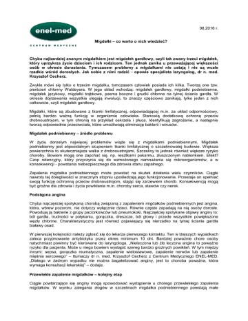 08.2016 r. Migdałki – co warto o nich wiedzieć? Chyba najbardziej znanym migdałkiem jest migdałek gardłowy, czyli tak zwany trzeci migdałek, który uprzykrza życie dzieciom i ich rodzicom. Ten jednak zanika u przeważającej większości osób w okresie dorastania. Tymczasem problemy z migdałkami nie ustają i nie są wcale rzadkie wśród dorosłych. Jak sobie z nimi radzić - opowie specjalista laryngolog, dr n. med. Krzysztof Cecherz. Zwykle mówi się tylko o trzecim migdałku, tymczasem człowiek posiada ich kilka. Tworzą one tzw. pierścień chłonny Waldeyera. W jego skład wchodzą: migdałek gardłowy, migdałki podniebienne, migdałek językowy, migdałki trąbkowe, pasma boczne i grudki chłonne na tylnej ścianie gardła. W okresie dojrzewania wszystkie ulegają inwolucji, to znaczy częściowo zanikają, tylko jeden z nich całkowicie, czyli migdałek gardłowy. Migdałki, które są zbudowane z tkanki limfatycznej, odpowiadającej m.in. za układ odpornościowy, pełnią bardzo ważną funkcję w organizmie człowieka. Stanowią dodatkową ochronę przeciw drobnoustrojom, w tym chronią na przykład oskrzela i płuca. Identyfikują zagrożenie, a następnie tworzą odpowiednie przeciwciała, które umożliwiają eliminację bakterii i wirusów. Migdałek podniebienny – źródło problemu W życiu dorosłym najwięcej problemów wiąże się z migdałkami podniebiennymi. Migdałek podniebienny jest elipsoidalnym skupieniem tkanki limfatycznej o szczelinowatej budowie. Większa powierzchnia to skuteczniejsza walka z drobnoustrojami. Szczeliny to jednak również większe ryzyko choroby. Bowiem mogą one zapchać się, np. resztkami pokarmu, złuszczonym nabłonkiem. Efekt? Czop retencyjny, który przyczynia się do wzmożonego namnażania się mikroorganizmów, a w konsekwencji - powstania niebezpiecznego dla zdrowia stanu zapalnego. Zapalenie migdałka podniebiennego może powstać na skutek działania wielu czynników. Ciągłe nawroty tej dolegliwości w znacznym stopniu upośledzają jego funkcjonowanie. Przestaje on spełniać swoją funkcję ochronną przeciw drobnoustrojom, stając się zarzewiem chorób. Konsekwencją mogą być groźne dla zdrowia i życia powikłania m.in. choroby serca, stawów czy nerek. Podstępna angina Chyba najczęściej spotykaną chorobą związaną z zapaleniem migdałków podniebiennych jest angina, która, wbrew pozorom, nie dotyczy wyłącznie dzieci. Równie często zapadają na nią osoby dorosłe. Powodują ją bakterie z grupy paciorkowców lub pneumokoki. Najczęściej spotykane objawy anginy to: ból gardła, trudności w połykaniu, gorączka, dreszcze, ból głowy i przede wszystkim powiększone węzły chłonne. Charakterystyczny jest również pojawiający się nierzadko na tylnej ścianie gardła białawy osad. W pierwszej kolejności należy zgłosić się do lekarza pierwszego kontaktu. Ten w lżejszych wypadkach zaleca przyjmowanie antybiotyku przez okres minimum 10 dni. Bardziej poważnie chore osoby natychmiast powinny być kierowane do laryngologa. „Nieleczona lub źle leczona angina to poważne ryzyko dla pacjenta. Może u niego bowiem wystąpić szereg bardzo groźnych powikłań. W tym między innymi: sepsa, gorączka reumatyczna, zapalenie wielostawowe, zapalenie nerwów lub zapalenie mięśnia sercowego” – tłumaczy dr n. med. Krzysztof Cecherz z Centrum Medycznego ENEL-MED. „Dlatego w żadnym wypadku nie można bagatelizować anginy, jest to choroba poważna, która wymaga konsultacji lekarskiej” – dodaje. Przewlekłe zapalenie migdałków – kolejny etap Ciągle powtarzające się anginy mogą spowodować wystąpienie u chorego przewlekłego zapalenia migdałków. W wyniku zalegania złogów w szczelinach migdałka podniebiennego powstają małe ropnie, powodujące jego zakażenie. Groźne jest to, że mikroropnie mogą naczyniami krwionośnymi przedostać się do bardzo ważnych narządów, powodując, np. gorączkę reumatyczną, zapalenie mięśnia sercowego. Jak można rozpoznać przewlekłe zapalenie migdałków? Przejawia się ono m.in. okresowym bólem gardła, trudnościami w połykaniu, uczuciem guli w gardle, nieprzyjemnym posmakiem w ustach lub też widocznie powiększonymi węzłami chłonnymi. W tym wypadku niestety leczenie zachowawcze, również antybiotykoterapia, zazwyczaj nie przynoszą zamierzonych rezultatów. Najbardziej optymalnym rozwiązaniem jest usunięcie migdałków podniebiennych, czyli tonsillektomia. „Zabieg wykonuje się w znieczuleniu ogólnym. Trwa on około 30 minut i uznawany jest jako podstawowy zabieg w laryngologii” – wyjaśnia specjalista laryngolog. „Sprowadza się on do wyłuszczenia i wycięcia migdałków, a następnie zatamowania krwawienia, które polega na: ucisku, podwiązaniu naczyń albo elektrokoagulacji” – dodaje ekspert z Centrum Medycznego ENEL-MED. Po operacji lekarze przepisują środki przeciwbólowe, które powinno się zażywać przez pierwszych kilka dni. Poza tym nie ma zbyt wielu zaleceń. Z pewnością warto pić duże ilości wody, by nie dopuścić do odwodnienia osłabionego organizmu. W pierwszym okresie po zabiegu radzi się spożywać jedzenie w postaci półpłynnej z powodu trudności z przełykaniem. Jeśli chodzi o aktywność fizyczną, warto odczekać 2 tygodnie, a potem powoli można wracać do ćwiczeń. Kontakt dla mediów: Lena Pytkowska [email protected] Tel. 518 161 944 Centrum Medyczne ENEL-MED S.A. to polska firma, oferująca pełną obsługę medyczną. ENEL-MED opiekuje się pacjentem od konsultacji, przez diagnostykę, hospitalizację, operację, aż po rehabilitację. Na ogólnopolską sieć medyczną ENEL-MED składają się dwa szpitale zlokalizowane w Warszawie: Szpital Zacisze oraz Szpital Centrum, wieloprofilowe oddziały własne w Warszawie, Gdańsku, Łodzi, Krakowie, Poznaniu, Katowicach i Wrocławiu oraz sześć specjalistycznych przychodni przyzakładowych, a także ponad 1400 plac