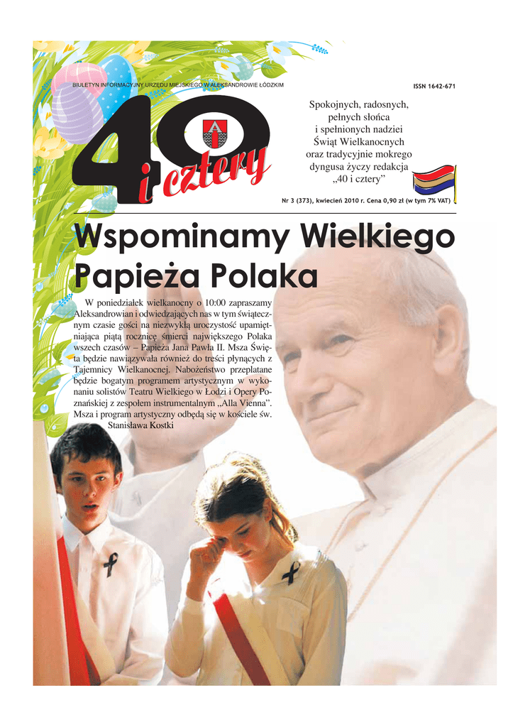 Spokojnych, radosnych, pełnych słońca i spełnionych nadziei Świąt Wielkanocnych oraz tradycyjnie mokrego dyngusa życzy redakcja „40 i cztery” Wspominamy Wielkiego Papieża Polaka W poniedziałek wielkanocny o 10:00 zapraszamy Aleksandrowian i odwiedzających nas w tym świątecznym czasie gości na niezwykłą uroczystość upamiętniająca piątą rocznicę śmierci największego Polaka wszech czasów – Papieża Jana Pawła II. Msza Święta będzie nawiązywała również do treści płynących z Tajemnicy Wielkanocnej. Nabożeństwo przeplatane będzie bogatym programem artystycznym w wykonaniu solistów Teatru Wielkiego w Łodzi i Opery Poznańskiej z zespołem instrumentalnym „Alla Vienna”. g y y y odbędą ę ą sięę w kościele św. Msza i pprogram artystyczny Stanis słłaawa w K ostk os ostk tki tki Stanisława Kostki Z ŻYCIA GMINY Mo Fontanna trysnęła na wiosnę nito ring w OSP W pięć nowych kamer — cztery zewnętrzne i jedną wewnętrzną — zaopatrzyła się Ochotnicza Straż Pożarna w Aleksandrowie Łódzkim. Całość inwestycji została pokryta ze środków własnych OSP. Całkowity jej koszt wyniesie około 12 tys. zł. Taka inwestycja była niezbędna ze względu na ubezpieczenie strażnicy, a zarząd postanowił zamiast krat w oknach, które były jednym z rozwiązań sugerowanych przez ubezpieczyciela, założyć również akceptowany monitoring. — Kamery zewnętrzne będą skierowane na teren strażnicy, na plac oraz będą pokazywały obraz całego budynku od ulicy 11 Listopada — mówi Zdzisław Makowski. Kamery były instalowane z podnośnika, który od niedawna jest w posiadaniu OSP w Aleksandrowie Łódzkim. Dzięki temu udało się zaoszczędzić około 1000 zł. (beta) 2 Aleksandrowianie znowu mogą odpoczywać przy fontannie. Po zimowej przerwie woda trysnęła w zim poniedziałek już na stałe. Wyjątpon kowo ciężką zimę zakonserwowakow ne uurządzenia wodne przetrwały w stanie nienaruszonym i obyło się stan bez jakichkolwiek napraw. Wandateż omijali fontannę, więc wyjątle te kowo nie trzeba wymieniać dysz ani zamontowanych obok nich kolorowych szkiełek. Fontanna cieszyć będzie oko jak zawsze do późnej jesieni. Skwerek, na którym znajduje się wodotrysk jest zresztą ulubionym miejscem wiosennego i letniego odpoczynku aleksandrowian. (kbs) Aleksandrowianie bardzo chętnie spacerują i odpoczywają w pobliżu fontanny. Smolarek patronem klasy Nowe parkingi w centrum Brak miejsc parkingowych w centrum Aleksandrowa to już przeszłość. Uruchomiono tu właśnie dwa nowe parkingi. Oba przy Urzędzie Miejskim. Pierwszy na 44 miejsca, drugi – na 16. Do obu dojazd jest od strony ulicy Jasieńskiego. W ten sposób ilość miejsc do parkowania aut zwiększyła się o kolejne 60. Przestronne parkingi z kostki są oświetlone i dodatkowo monitorowane. Urząd Miejski zapłacił za ich budowę 170 tys. zł. Wkrótce pojawią się też stosowne znaki informujące o nowych miejscach i dojeździe do nich. (kbs) Włodzimierz Smolarek, legenda polskiej piłki nożnej, zostanie patronem (pierwszej w historii aleksandrowskiego ogólniaka) klasy sportowej o profilu piłka nożna, która ruszy w tutejszym liceum od września. - To żywa legenda polskiej piłki, a na dodatek aleksandrowianin i szkoda byłoby nie wykorzystać jego talentu w szkoleniu naszej młodzieży – mówi Robert Śliwakowski, dyrektor Liceum Ogólnokształcącego w Aleksandrowie. - Na propozycję, by objął patronatem taką klasę, zareagował entuzjastycznie. Sam zaproponował szeroko idącą współpracę, czyli udzielanie rad trenerowi piłki nożnej i prowadzenie niektórych treningów. Włodzimierz Smolarek od lat związany jest z Aleksandrowem. Tu rozpoczynał pierwsze treningi piłkarskie i tu nadal wraca, nie tylko wspomnieniami. W 2008 roku został honorowym obywatelem miasta. Po latach kariery zawodowej w kraju i za granicą były piłkarz pracuje obecnie w PZPN, zajmując się wyszukiwaniem młodych talentów w kraju i za granicą. Fachowa pomoc dla aleksandrowskiego liceum będzie jego pracą społeczną na rzecz miasta. (kbs) W tum numerze - uaktualniony imprezownik aleksandrowski - zobacz co się b ędzie działo przez cały rok Imprezownik Aleksandrowski w rolach głównych: 2010 3 ... i w wielu innych Z ŻYCIA GMINY Pojadą do Brukseli W piątek, 19 marca, został rozstrzygnięty powiatowy konkurs pn. „Europa — nasz wspólny dom”. W kategorii gimnazjów pierwsze miejsce zajął Jakub Tomys z Gimnazjum nr 1 w Ozorkowie, natomiast wśród uczniów szkół ponadgimnazjalnych najlepszy okazał się Kamil Kmieć z Liceum Ogólnokształcącego im. M. Kopernika w Aleksandrowie Łódzkim. W nagrodę obydwaj pojadą na wycieczkę do Brukseli, dzięki europosłance Joannie Skrzydlewskiej, która objęła konkurs patronatem i ufundowała główną nagrodę. J. Skrzydlewska osobiście wręczała laureatom pamiątkowe dyplomy i upominki. — Konkurs nie był trudny, choć wymagał przeczytania kilku dodatkowych lektur i ogólnej znajomości tematyki europejskiej wyniesionej ze szkoły — powiedział Adam Kasprzyk, nauczyciel LO im. M. Kopernika oraz opiekun konkursu. — Wszyscy powinni mieć choćby podstawową wiedzę na temat unii i Europy, która jest przecież naszym wspólnym domem. Cieszę się, że niektórzy chcą wiedzieć więcej. — Jestem bardzo zaskoczony zwycięstwem w tym konkursie – stwierdził Jakub Tomys. — Przygotowywałem się do konkursu krótko, korzystając z kilku wskazanych Joanna Skrzydlewska osobiście wręczała laureatom pierwszych miejsc zaproszenia do Brukseli, a pozostałym, dyplomy i drobne upominki przez nauczyciela lektur i Internetu. Sporo wyniosłem po prostu z lekcji. Ale oczywiście bardzo się cieszę z wygranej i z wyjazdu. Podobne zdanie ma zwycięzca w kategorii szkół ponadgimnazjalnych: — Pytania nie były trudne – stwierdził Kamil Kmieć. — Ja od dawna interesuję się tematyką europejs