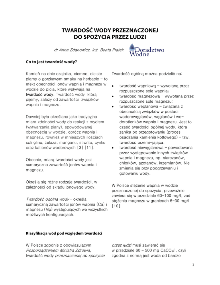 TWARDOŚĆ WODY PRZEZNACZONEJ DO SPOŻYCIA PRZEZ LUDZI