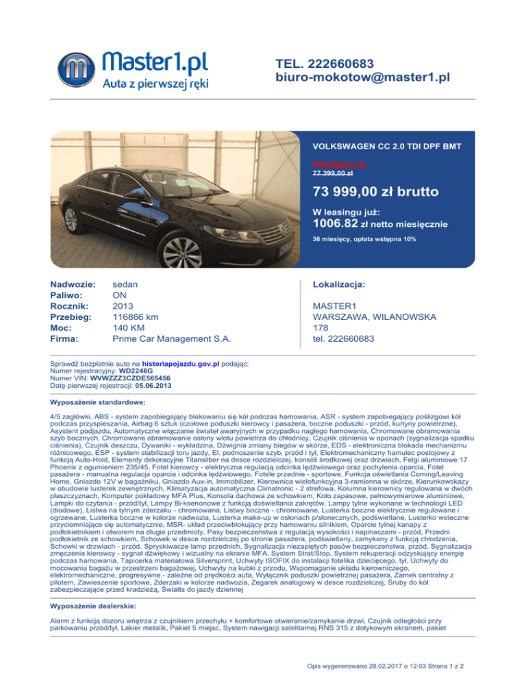 TEL. 222660683 [email protected] VOLKSWAGEN CC 2.0 TDI DPF BMT PROMOCJA 77 399,00 zł 73 999,00 zł brutto W leasingu już: 1006.82 zł netto miesięcznie 36 miesięcy, opłata wstępna 10% Nadwozie: Paliwo: Rocznik: Przebieg: Moc: Firma: sedan ON 2013 116866 km 140 KM Prime Car Management S.A. Lokalizacja: MASTER1 WARSZAWA, WILANOWSKA 178 tel. 222660683 Sprawdź bezpłatnie auto na historiapojazdu.gov.pl podając: Numer rejestracyjny: WD2246G Numer VIN: WVWZZZ3CZDE565456 Datę pierwszej rejestracji: 05.06.2013 Wyposażenie standardowe: 4/5 zagłówki, ABS - system zapobiegający blokowaniu się kół podczas hamowania, ASR - system zapobiegający poślizgowi kół podczas przyspieszania, Airbag 6 sztuk (czołowe poduszki kierowcy i pasażera, boczne poduszki - przód, kurtyny powietrzne), Asystent podjazdu, Automatyczne włączanie świateł awaryjnych w przypadku nagłego hamowania, Chromowane obramowania szyb bocznych, Chromowane obramowanie osłony wlotu powietrza do chłodnicy, Czujnik ciśnienia w oponach (sygnalizacja spadku ciśnienia), Czujnik deszczu, Dywaniki - wykładzina, Dźwignia zmiany biegów w skórze, EDS - elektroniczna blokada mechanizmu różnicowego, ESP - system stabilizacji toru jazdy, El. podnoszenie szyb, przód i tył, Elektromechaniczny hamulec postojowy z funkcją Auto-Hold, Elementy dekoracyjne Titansilber na desce rozdzielczej, konsoli środkowej oraz drzwiach, Felgi aluminiowe 17 Phoenix z ogumieniem 235/45, Fotel kierowcy - elektryczna regulacją odcinka lędźwiowego oraz pochylenia oparcia, Fotel pasażera - manualna regulacja oparcia i odcinka lędźwiowego, Fotele przednie - sportowe, Funkcja oświetlania Coming/Leaving Home, Gniazdo 12V w bagażniku, Gniazdo Aux-in, Immobilizer, Kierownica wielofunkcyjna 3-ramienna w skórze, Kierunkowskazy w obudowie lusterek zewnętrznych, Klimatyzacja automatyczna Climatronic - 2 strefowa, Kolumna kierownicy regulowana w dwóch płaszczyznach, Komputer pokładowy MFA Plus, Konsola dachowa ze schowkiem, Koło zapasowe, pełnowymiarowe aluminiowe, Lampki do czytania - przód/tył, Lampy Bi-ksenonowe z funkcją doświetlania zakrętów, Lampy tylne wykonane w technologii LED (diodowe), Listwa na tylnym zderzaku - chromowana, Listwy boczne - chromowane, Lusterka boczne elektrycznie regulowane i ogrzewane, Lusterka boczne w kolorze nadwozia, Lusterka make-up w osłonach p/słonecznych, podświetlane, Lusterko wsteczne przyciemniające się automatycznie, MSR- układ przeciwblokujący przy hamowaniu silnikiem, Oparcie tylnej kanapy z podłokietnikiem i otworem na długie przedmioty, Pasy bezpieczeństwa z regulacją wysokości i napinaczami - przód, Przedni podłokietnik ze schowkiem, Schowek w desce rozdzielczej po stronie pasażera, podświetlany, zamykany z funkcją chłodzenia, Schowki w drzwiach - przód, Spryskiwacze lamp przednich, Sygnalizacja niezapiętych pasów bezpieczeństwa, przód, Sygnalizacja zmęczenia kierowcy - sygnał dźwiękowy i wizualny na ekranie MFA, System Strat/Stop, System rekuperacji odzyskujący energię podczas hamowania, Tapicerka materiałowa Silversprint, Uchwyty ISOFIX do instalacji fotelika dziecięcego, tył, Uchwyty do mocowania bagażu w przestrzeni bagażowej, Uchwyty na kubki z przodu, Wspomaganie układu kierowniczego, elektromechaniczne, progresywne - zależne od prędkości auta, Wyłącznik poduszki powietrznej pasażera, Zamek centralny z pilotem, Zawieszenie sportowe, Zderzaki w kolorze nadwozia, Zegarek analogowy w desce rozdzielczej, Śruby do kół zabezpieczające przed kradzieżą, Światła do jazdy dziennej Wyposażenie dealerskie: Alarm z funkcją dozoru wnętrza z czujnikiem przechyłu + komfortowe otwieranie/zamykanie drzwi, Czujnik odległości przy parkowaniu przód/tył, Lakier metalik, Pakiet 5 miejsc, System nawigacji satelitarnej RNS 315 z dotykowym ekranem, pakiet Opis wygenerowano 28.02.2017 o 12:03 Strona 1 z 2 Master1 to punkt sprzedaży samochodów Masterlease, pierwszego właściciela. Wszystkie auta zostały zakupione w polskim salonie, posiadają wycenę rzeczoznawcy, były regularnie serwisowane podczas użytkowania i posiadają udokumentowaną historię zdarzeń serwisowych. W Master1.pl znajdziecie Państwo szeroki wachlarz ubezpieczeń komunikacyjnych. Nasza oferta skierowana jest zarówno do klientów indywidualnych jak i firm. Wszelkich formalności można dokonać na miejscu. Opis wygenerowano 28.02.2017 o 12:03 Strona 2 z 2