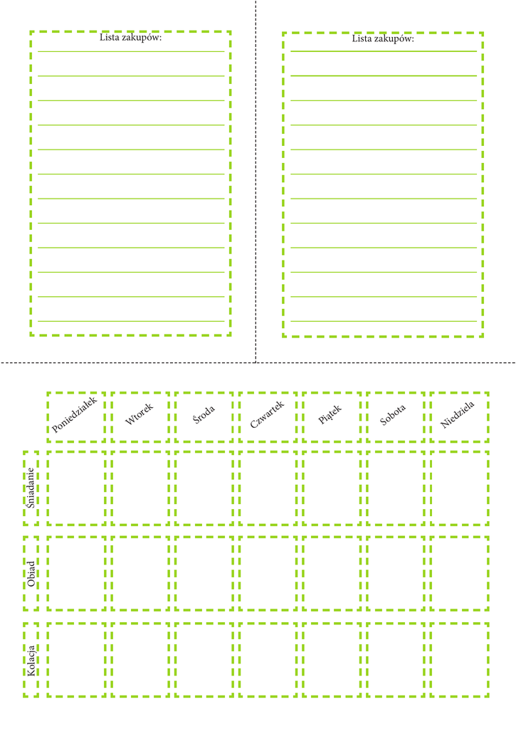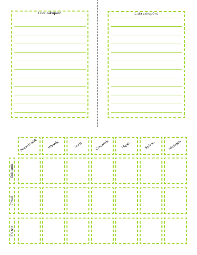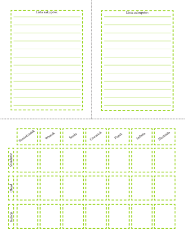 Lista zakupów: Kolacja Obiad Śniadanie e ni o P łek a i dz ek tor W Lista zakupów: a od Śr k rte a w Cz k ąte Pi ota b So e Ni a iel z d