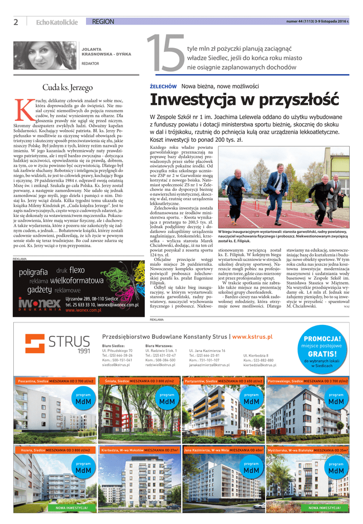 2 region EchoKatolickie jolanta KRaSnoWSKa - dyŃKa reDaKTor K Cuda ks. Jerzego ruchy, delikatny człowiek znalazł w sobie moc, która doprowadziła go do świętości. Nie musiał czynić niemożliwych do pojęcia rozumem cudów, by zostać wyniesionym na ołtarze. Dla głoszenia prawdy nie ugiął się przed niczym. Skromny duszpasterz zwykłych ludzi. Odważny kapelan Solidarności. Kochający wolność patriota. Bł. ks. Jerzy Popiełuszko w modlitwie za ojczyznę widział obowiązek patriotyczny i skuteczny sposób przeciwstawienia się złu, jakie niszczy Polskę. Był jednym z tych, którzy reżim nazwali po imieniu. W jego kazaniach wybrzmiewały nuty prawdziwego patriotyzmu, ale i myśl bardzo zwyczajna - dotycząca ludzkiej uczciwości, opowiedzenia się za prawdą, dobrem, za tym, co w życiu powinno być oczywistością. Dlatego był tak żarliwie słuchany. Robotnicy i inteligencja przylgnęli do niego, bo widzieli, że jest to człowiek prawy, kochający Boga i ojczyznę. 19 października 1984 r. odprawił swoją ostatnią Mszę św. i zniknął. Szukała go cała Polska. Ks. Jerzy został porwany, a następnie zamordowany. Nie udało się jednak zamordować jego myśli, jego dzieła i pamięci o nim. Dzisiaj ks. Jerzy wciąż działa. Kilka tygodni temu ukazała się książka Mileny Kindziuk pt. „Cuda księdza Jerzego”. Jest to zapis nadzwyczajnych, często wręcz cudownych zdarzeń, jakie się dokonały za wstawiennictwem męczennika. Pokazuje uzdrowienia, które mają wymiar fizyczny, ale i duchowy. A także wydarzenia, które z pozoru nie zakończyły się żadnym cudem, a jednak… Bohaterowie książki, którzy zostali cudownie uzdrowieni, podkreślają, że ich życie w pewnym sensie stało się teraz trudniejsze. Bo cud zawsze zdarza się po coś. Ks. Jerzy wciąż o tym przypomina. Reklama \[XUS^MRUM P^aWRXQd[ ^QWXMYMcUQXW[R[^YM`[cM SMPéQ`e^QWXMY[cQ 15 numer 44 (1113) 3-9 listopada 2016 r. tyle mln zł pożyczki planują zaciągnąć władze Siedlec, jeśli do końca roku miasto nie osiągnie zaplanowanych dochodów ŻELECHóW Nowa bieżna, nowe możliwości Inwestycja w przyszłość W Zespole Szkół nr 1 im. Joachima Lelewela oddano do użytku wybudowane z funduszy powiatu i dotacji ministerstwa sportu bieżnię, skocznię do skoku w dal i trójskoku, rzutnię do pchnięcia kulą oraz urządzenia lekkoatletyczne. Koszt inwestycji to ponad 200 tys. zł. Każdego roku władze powiatu garwolińskiego przeznaczają na poprawę bazy dydaktycznej prowadzonych przez siebie placówek oświatowych pokaźne środki. Od początku roku szkolnego uczniowie ZSP nr 2 w Garwolinie mogą korzystać z nowego boiska. Natomiast społeczność ZS nr 1 w Żelechowie ma do dyspozycji bieżnię o nawierzchni syntetycznej, skocznię w dal, rzutnię oraz urządzenia lekkoatletyczne. Żelechowska inwestycja została dofinansowana ze środków ministerstwa sportu. - Kwota wynikająca z przetargu to 200,5 tys. zł. Jednak podjęliśmy decyzję i dodatkowo zakupiliśmy urządzenia nagłaśniające, fotokomórki, krzesełka - wylicza starosta Marek Chciałowski, dodając, iż na ten cel powiat pozyskał z resortu sportu 124 tys. zł. Oficjalne przecięcie wstęgi miało miejsce 26 października. Nowoczesny kompleks sportowy poświęcił proboszcz żelechowskiej parafii ks. prałat Eugeniusz Filipiuk. Odbył się także bieg inauguracyjny, w którym wystartowali: starosta garwoliński, radny powiatowy, nauczyciel wychowania fizycznego i proboszcz. Niekwe- W biegu inauguracyjnym wystartowali: starosta garwoliński, radny powiatowy, nauczyciel wychowania fizycznego i proboszcz. Niekwestionowanym zwycięzcą został ks. E. Filipiuk. stionowanym zwycięzcą został ks. E. Filipiuk. W kolejnym biegu wystartowali uczniowie w strojach szkolnej drużyny sportowej. Nareszcie mogli pobiec na profesjonalnym torze, gdzie czas mierzony jest przez profesjonalny sprzęt. W trakcie spotkania nie zabrakło także miejsce na prezentację szkolnej grupy cheerleaderek. - Bardzo cieszy nas widok zadowolonej młodzieży, która otrzymuje nowe możliwości. Dlatego stawiamy na edukację, unowocześniając bazę do kształcenia i budując nowe obiekty sportowe. W tym roku czeka nas jeszcze jedna kosztowna inwestycja: modernizacja maszynowni i uzdatniania wody basenowej w Zespole Szkół im. Stanisława Staszica w Miętnem. Na wszystkie przedsięwzięcia wydamy ok. 1,4 mln zł. Jednak nie żałujemy pieniędzy, bo to są inwestycje w przyszłość - spuentował WAJ M. Chciałowski. Reklama PROMOCJA! miejsce postojowe GRATIS! do wybranych lokali w Siedlcach 14 www.echokatolickie.pl Fot. pixabay.com Planowana pożyczka nie zwiększy zadłużenia miasta, a posłuży jedynie utrzymaniu płynności finansowej. SIEDLCE Sesja rady miasta W planach pożyczka Jeśli do końca roku miasto nie osiągnie zaplanowanych dochodów, będzie zmuszone zaciągnąć pożyczkę w wysokości 15 mln zł. - Pożyczka, obligacja i kredyt to normalne instrumenty dopuszczalne ustawowo, które służą zabezpieczeniu płynności finansowej budżetu - przekonywał skarbnik Kazimierz Paryła. Kwestia kolejnego obciążenia finansowego wzbudziła kontrowersje wśród radnych opozycji podczas październikowej sesji rady miasta. Zwracali oni uwagę na kondycję Siedlec w związku z czekającymi wydatkami na wkład własny w planowane inwestycje oraz szykującą się reformę szkolnictwa. Radni wskazywali, że na obecną sytuację wpłynęły źle zaplanowane dochody w budżecie. Chcieli także wiedzieć, czy miasto poradzi sobie ze spłatą kolejnego długu. Tylko w razie konieczności Pożyczka w wysokości 15 mln zł ma pozwolić na załatanie dziury w budżecie miasta, spowodowanej brakiem wpływu ze sprzedaży nieruchomości oraz niektórych opłat. - Od września badamy budżet i mamy obawy, że w grudniu może zabraknąć 8 mln zł. Z przyczyn technicznych i prawnych kilka nieruchomości nie znalazło w tym roku nabywców. Chodzi o warte