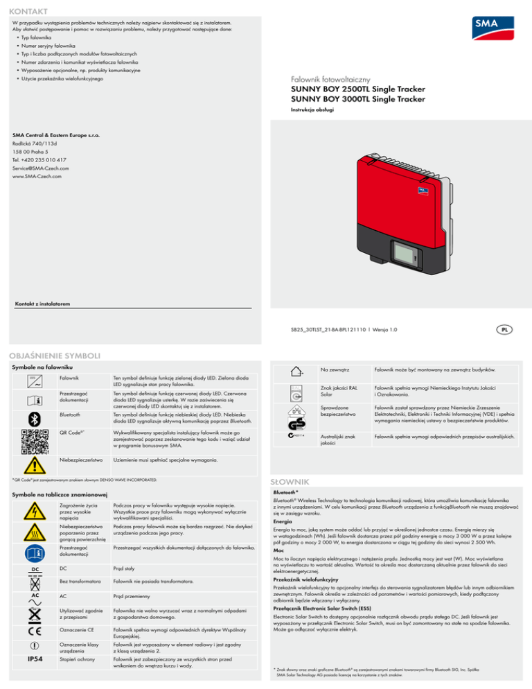 KONTAKT W przypadku wystąpienia problemów technicznych należy najpierw skontaktować się z instalatorem. Aby ułatwić postępowanie i pomoc w rozwiązaniu problemu, należy przygotować następujące dane: •Typ falownika •Numer seryjny falownika •Typ i liczba podłączonych modułów fotowoltaicznych •Numer zdarzenia i komunikat wyświetlacza falownika •Wyposażenie opcjonalne, np. produkty komunikacyjne Falownik fotowoltaiczny SUNNY BOY 2500TL Single Tracker SUNNY BOY 3000TL Single Tracker •Użycie przekaźnika wielofunkcyjnego Instrukcja obsługi SMA Central & Eastern Europe s.r.o. Radlická 740/113d 158 00 Praha 5 Tel. +420 235 010 417 [email protected] www.SMA-Czech.com Kontakt z instalatorem SB25_30TLST_21-BA-BPL121110 l Wersja 1.0 PL Objaśnienie symboli Symbole na falowniku Falownik Ten symbol definiuje funkcję zielonej diody LED. Zielona dioda LED sygnalizuje stan pracy falownika. Przestrzegać dokumentacji Ten symbol definiuje funkcję czerwonej diody LED. Czerwona dioda LED sygnalizuje usterkę. W razie zaświecenia się czerwonej diody LED skontaktuj się z instalatorem. Bluetooth Ten symbol definiuje funkcję niebieskiej diody LED. Niebieska dioda LED sygnalizuje aktywną komunikację poprzez Bluetooth. QR Code®* Wykwalifikowany specjalista instalujący falownik może go zarejestrować poprzez zeskanowanie tego kodu i wziąć udział w programie bonusowym SMA. Niebezpieczeństwo Uziemienie musi spełniać specjalne wymagania. *QR Code® jest zarejestrowanym znakiem słownym DENSO WAVE INCORPORATED. Niebezpieczeństwo poparzenia przez gorącą powierzchnię IP54 Podczas pracy w falowniku występuje wysokie napięcie. Wszystkie prace przy falowniku mogą wykonywać wyłącznie wykwalifikowani specjaliści. Podczas pracy falownik może się bardzo rozgrzać. Nie dotykać urządzenia podczas jego pracy. Przestrzegać dokumentacji Przestrzegać wszystkich dokumentacji dołączonych do falownika. DC Prąd stały Bez transformatora Falownik nie posiada transformatora. AC Prąd przemienny Utylizować zgodnie z przepisami Falownika nie wolno wyrzucać wraz z normalnymi odpadami z gospodarstwa domowego. Oznaczenie CE Falownik spełnia wymogi odpowiednich dyrektyw Wspólnoty Europejskiej. Oznaczenie klasy urządzenia Stopień ochrony Falownik może być montowany na zewnątrz budynków. Znak jakości RAL Solar Falownik spełnia wymogi Niemieckiego Instytutu Jakości i Oznakowania. Sprawdzone bezpieczeństwo Falownik został sprawdzony przez Niemieckie Zrzeszenie Elektrotechniki, Elektroniki i Techniki Informacyjnej (VDE) i spełnia wymagania niemieckiej ustawy o bezpieczeństwie produktów. Australijski znak jakości Falownik spełnia wymogi odpowiednich przepisów australijskich. SŁOWNIK Bluetooth* Symbole na tabliczce znamionowej Zagrożenie życia przez wysokie napięcia Na zewnątrz Bluetooth® Wireless Technology to technologia komunikacji radiowej, która umożliwia komunikację falownika z innymi urządzeniami. W celu komunikacji przez Bluetooth urządzenia z funkcjąBluetooth nie muszą znajdować się w zasięgu wzroku. Energia Energia to moc, jaką system może oddać lub przyjąć w określonej jednostce czasu. Energię mierzy się w watogodzinach (Wh). Jeśli falownik dostarcza przez pół godziny energię o mocy 3 000 W a przez kolejne pół godziny o mocy 2 000 W, to energia dostarczona w ciągu tej godziny do sieci wynosi 2 500 Wh. Moc Moc to iloczyn napięcia elektrycznego i natężenia prądu. Jednostką mocy jest wat (W). Moc wyświetlana na wyświetlaczu to wartość aktualna. Wartość ta określa moc dostarczaną aktualnie przez falownik do sieci elektroenergetycznej. Przekaźnik wielofunkcyjny Przekaźnik wielofunkcyjny to opcjonalny interfejs do sterowania sygnalizatorem błędów lub innym odbiornikiem zewnętrznym. Falownik określa w zależności od parametrów i wartości pomiarowych, kiedy podłączony odbiornik będzie włączany i wyłączany. Przełącznik Electronic Solar Switch (ESS) Electronic Solar Switch to dostępny opcjonalnie rozłącznik obwodu prądu stałego DC. Jeśli falownik jest wyposażony w przełącznik Electronic Solar Switch, musi on być zamontowany na stałe na spodzie falownika. Może go odłączać wyłącznie elektryk. Falownik jest wyposażony w element radiowy i jest zgodny z klasą urządzenia 2. Falownik jest zabezpieczony ze wszystkich stron przed wnikaniem do wnętrza kurzu i wody. * Znak słowny oraz znaki graficzne Bluetooth® są zarejestrowanymi znakami towarowymi firmy Bluetooth SIG, Inc. Spółka SMA Solar Technology AG posiada licencję na korzystanie z tych znaków. Wskazówki dotyczące bezpieczeństwa Widok poglądowy urządzenia 1,(%(=3,(&=(ĭ67:2 Tabliczka znamionowa do identyfikacji falownika Zagrożenie życia przez wysokie napięcie w falowniku. Numer seryjny Nawet gdy falownik nie jest podłączony do zewnętrznego napięcia, może w nim występować bardzo wysokie napięcie. •Nie otwierać falownika. •Wszystkie czynności instalacyjne, naprawy i modyfikacje urządzenia mogą być wykonywane wyłącznie przez specjalistów. SMA Solar Technology AG Sonnenallee 1 34626 Niestetal Germany www.SMA.de SUNNY BOY Solar Inverter* made in Germany Górna pokrywa obudowy by SMA Solar Technology AG Model SB XXXXXXXXXXX Serial No. XXXXXXXXXX ny Y Made r* Y BO inverte NNstring SU oltaic in Germa Date YYYY-MM-DD 21 Photov 0TL500 SB XXX 26752ŝ1,( P Dolna pokrywa obudowy Niebezpieczeństwo poparzenia przez gorące elementy obudowy. I VE D VE D * *XXX •Gdy urządzenie jest włączone, wolno dotykać tylko dolnej pokrywy obudowy i wyświetlacza. Zmniejszenie uzysku energii wskutek niewłaściwego odprowadzania ciepła. Wyświetlacz kWh •Nie kłaść na obudowie żadnych przedmiotów. kVAr kW kVAr h kWh MVA rh MW h ESS (opcja) Czyszczenie falownika 68"(" Diody LED Uszkodzenie wyświetlacza przez użycie środków czyszczących. •Jeśli falownik jest zabrudzony, pokrywę obudowy, wyświetlacz i diody 