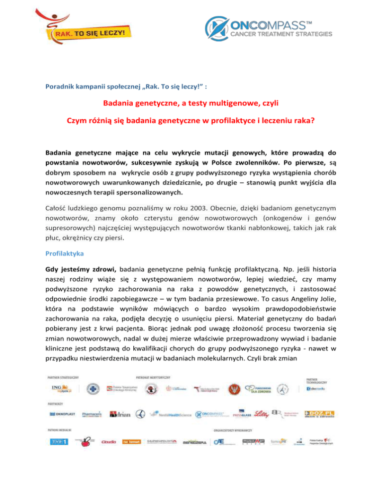 Poradnik kampanii społecznej „Rak. To się leczy!” : Badania genetyczne, a testy multigenowe, czyli Czym różnią się badania genetyczne w profilaktyce i leczeniu raka? Badania genetyczne mające na celu wykrycie mutacji genowych, które prowadzą do powstania nowotworów, sukcesywnie zyskują w Polsce zwolenników. Po pierwsze, są dobrym sposobem na wykrycie osób z grupy podwyższonego ryzyka wystąpienia chorób nowotworowych uwarunkowanych dziedzicznie, po drugie – stanowią punkt wyjścia dla nowoczesnych terapii spersonalizowanych. Całość ludzkiego genomu poznaliśmy w roku 2003. Obecnie, dzięki badaniom genetycznym nowotworów, znamy około czterystu genów nowotworowych (onkogenów i genów supresorowych) najczęściej występujących nowotworów tkanki nabłonkowej, takich jak rak płuc, okrężnicy czy piersi. Profilaktyka Gdy jesteśmy zdrowi, badania genetyczne pełnią funkcję profilaktyczną. Np. jeśli historia naszej rodziny wiąże się z występowaniem nowotworów, lepiej wiedzieć, czy mamy podwyższone ryzyko zachorowania na raka z powodów genetycznych, i zastosować odpowiednie środki zapobiegawcze – w tym badania przesiewowe. To casus Angeliny Jolie, która na podstawie wyników mówiących o bardzo wysokim prawdopodobieństwie zachorowania na raka, podjęła decyzję o usunięciu piersi. Materiał genetyczny do badań pobierany jest z krwi pacjenta. Biorąc jednak pod uwagę złożoność procesu tworzenia się zmian nowotworowych, nadal w dużej mierze właściwie przeprowadzony wywiad i badanie kliniczne jest podstawą do kwalifikacji chorych do grupy podwyższonego ryzyka - nawet w przypadku niestwierdzenia mutacji w badaniach molekularnych. Czyli brak zmian patogennych w wykonanych badaniach genetycznych nie wyklucza chorego z grupy ryzyka, jeżeli wywiad rodzinny jest obciążający. Leczenie W przypadku osób chorych na raka badania genetyczne mają zazwyczaj związek z nowoczesnymi metodami leczenia. Chodzi o tzw. terapie spersonalizowane. Jednak te badania najczęściej prowadzone są w kierunku tylko niektórych genów czy sekwencji genowych. Najprościej można powiedzieć, że to badania zmierzające do dopasowania pacjenta do określonego, dostępnego leczenia. Do najlepiej znanych badań tego typu zaliczamy testy w kierunku oceny mutacji w obrębie genów RAS (dla nowotworów jelita grubego), EGFR (dla raka płuc), a także receptora HER-2 lub HER2 (dla raka piersi i raka żołądka). W świecie nauk medycznych coraz więcej miejsca poświęca się jednak nowemu podejściu do pacjenta, czyli badaniom zmierzającym do dopasowania leku do profilu genetycznego nowotworu u konkretnego pacjenta. W tym przypadku niezbędne są badania obejmujące wiele genów, gdzie w pierwszej kolejności stwierdza się obecność mutacji genowych. Materiał do badań pochodzi z biopsji guza. Badania – i co dalej? Wiedza na temat obecności dodatkowych mutacji patogennych, mających udział w procesie tworzenia nowotworów, lub ich braku już dzisiaj jest podstawą do kwalifikacji chorego do standardowych metod terapii celowanych. Może również skutkować włączeniem chorego do badania klinicznego z udziałem leków ukierunkowanych molekularnie, a w przyszłości być podstawą do wdrożenia nowszych metod leczenia celowanego, które aktualnie są w fazie badań klinicznych. W większości ośrodków europejskich, w ramach rutynowych badań mutacji genowych, bada się od jednego do dwóch genów. W Polsce badania mutacji genowych prowadzi niemieckowęgierska firma KPS Diagnostics, działająca za pośrednictwem serwisu www.Oncompass.pl, która analizuje od 6 do 58 możliwych mutacji genów (ich twórcy 10 lat temu odkryli mutację genu EGFR, która występuje u ok 10% osób chorych na raka płuc). Na podstawie wyników badania pacjent oraz prowadzący go lekarz otrzymują raport opisujący występujące mutacje, a dodatkowo - wykaz terapii spersonalizowanych, które mogą być efektywne dla pacjenta posiadającego właśnie taką mutację (ostateczną decyzję o zasadności leczenia podejmuje lekarz interpretujący badanie genetyczne). Dzięki współpracy z ośrodkami badawczymi na całym świecie Oncompass wyszukuje również dostępne w danym momencie badania kliniczne, prowadzone pod kątem takich mutacji i pomaga pacjentom w kontakcie z danym ośrodkiem klinicznym. Więcej informacji można znaleźć w serwisie www.oncompass.pl Badania pokazują, że 70% pacjentów uczestniczących w dopasowanych badaniach klinicznych odnosi korzyści. Badania mutacji genowych nie są jednak jeszcze standardem w diagnostyce, zarówno w Polsce, jak i w Europie, dlatego koszty ich przeprowadzenia ponosi pacjent. Za to w przypadku zakwalifikowania się do badań klinicznych, pacjent ponosi wyłącznie wydatki związane z logistyką. *** Oncompass to nowy Partner kampanii społecznej „Rak. To się leczy!”, którą wspiera w obszarze edukacji na temat nowego podejścia do leczenia onkologicznego w zakresie terapii spersonalizowanej – celowanej molekularnie i opartej na wynikach badań mutacji genowych. Kampanię wspierają również: ING Życie, Nestle Health Science, Pharmaceris i Oknoplast. Oficjalna strona: www.rak.tosieleczy.pl Firma KPS Diagnostics Co. jest międzynarodową firmą świadczącą usługi informacji i diagnostyki molekularnej, która pomaga chorym na raka w odnalezieniu najlepszych dla nich terapii celowanych. Posiada 10 letnie doświadczenie w farmakodiagnostyce molekularnej oraz najnowocześniejsze, odznaczone certyfikatem ISO laboratorium diagnostyczne patologii molekularnej, uznane przez zewnętrzne programy jakości Europejskiego Stowarzyszenia Patologów. Siedziba firmy znajduje się w Heidelbergu (Niemcy) oraz w Budapeszcie (Węgry), a sieć dystrybutorów obejmuje także Szwajcarię, Rumunię, Hiszpanię, Wielką Brytanię, Polskę, a wkrótce również Czechy. Więcej informacji na: http://kpsdx.com/ Kontakt dla mediów: Alicja Zakrz