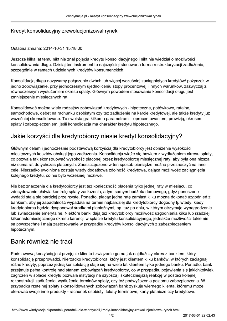 Windykacja.pl - Kredyt konsolidacyjny zrewolucjonizował rynek Kredyt konsolidacyjny zrewolucjonizował rynek Ostatnia zmiana: 2014-10-31 15:18:00 Jeszcze kilka lat temu nikt nie znał pojęcia kredytu konsolidacyjnego i nikt nie wiedział o możliwości konsolidowania długu. Dzisiaj ten instrument to najczęściej stosowana forma restrukturyzacji zadłużenia, szczególnie w ramach udzielanych kredytów konsumenckich. Konsolidacją długu nazywamy połączenie dwóch lub więcej wcześniej zaciągniętych kredytów/ pożyczek w jedno zobowiązanie, przy jednoczesnym ujednoliceniu stopy procentowej i innych warunków, zazwyczaj z równoczesnym wydłużeniem okresu spłaty. Głównym powodem stosowania konsolidacji długu jest zmniejszenie miesięcznych rat. Konsolidować można wiele rodzajów zobowiązań kredytowych - hipoteczne, gotówkowe, ratalne, samochodowe, debet na rachunku osobistym czy też zadłużenie na karcie kredytowej, ale także kredyty już wcześniej skonsolidowane. To swoista gra kilkoma parametrami - oprocentowaniem, prowizją, okresem spłaty i zabezpieczeniem, jeśli konsolidacja ma charakter kredytu hipotecznego. Jakie korzyści dla kredytobiorcy niesie kredyt konsolidacyjny? Głównym celem i jednocześnie podstawową korzyścią dla kredytobiorcy jest obniżenie wysokości miesięcznych kosztów obsługi jego zadłużenia. Konsolidacja wiąże się bowiem z wydłużeniem okresu spłaty, co pozwala tak skonstruować wysokość płaconej przez kredytobiorcę miesięcznej raty, aby była ona niższa niż suma rat dotychczas płaconych. Zaoszczędzone w ten sposób pieniądze można przeznaczyć na inne cele. Nierzadko uwolniona zostaje wtedy dodatkowa zdolność kredytowa, dająca możliwość zaciągnięcia kolejnego kredytu, co nie było wcześniej możliwe. Nie bez znaczenia dla kredytobiorcy jest też konieczność płacenia tylko jednej raty w miesiącu, co zdecydowanie ułatwia kontrolę spłaty zadłużenia, a tym samym budżetu domowego, gdyż ponoszone wydatki stają się bardziej przejrzyste. Ponadto, płacąc jedną ratę zamiast kilku można dokonać uzgodnień z bankiem, aby jej zapadalność wypadała na termin najbardziej dla kredytobiorcy dogodny tj. wtedy, kiedy kredytobiorca będzie dysponował środkami pieniężnymi, np. tuż po dniu, w którym otrzymuje wynagrodzenie lub świadczenie emerytalne. Niektóre banki dają też kredytobiorcy możliwość uzgodnienia kilku lub rzadziej kilkunastomiesięcznego okresu karencji w spłacie kredytu konsolidacyjnego, jednakże możliwości takie nie są powszechne i mają zastosowanie w przypadku kredytów konsolidacyjnych z zabezpieczeniem hipotecznym. Bank również nie traci Podstawową korzyścią jest przejęcie klienta i związanie go na jak najdłuższy okres z bankiem, który konsolidację przeprowadzi. Nierzadko kredytobiorca, który jest klientem kilku banków, w których zaciągnął różne kredyty, poprzez jedną konsolidację staje się na wiele lat klientem tylko jednego banku. Ponadto, bank przejmuje pełną kontrolę nad stanem zobowiązań kredytobiorcy, co w przypadku pojawienia się jakichkolwiek zagrożeń w spłacie kredytu pozwala instytucji na szybszą i skuteczniejszą reakcję w postaci kolejnej rekonstrukcji zadłużenia, wydłużenia terminów spłaty, czy też podwyższenia poziomu zabezpieczenia. W przypadku rzetelnej spłaty skonsolidowanych zobowiązań bank zyskuje wiernego klienta, któremu może oferować swoje inne produkty - rachunek osobisty, lokaty terminowe, karty płatnicze czy kredytowe. http://www.windykacja.pl/poradnik,poradnik-dla-wierzycieli,kredyt-konsolidacyjny-zrewolucjonizowal-rynek.html 1/2 2017-03-01 22:02:43 Windykacja.pl - Kredyt konsolidacyjny zrewolucjonizował rynek Wysoki poziom konkurencji na rynku bankowym skłania jego uczestników do stosowania różnych form pozyskiwania klientów. Coraz więcej banków posiada uniwersalny charakter i bardzo zdywersyfikowaną ofertę. Dzisiaj trudno byłoby sobie wyobrazić istnienie tych instytucji bez takiego narzędzia jak kredyt konsolidacyjny. Stał się on jednym z najważniejszych sposobów budowania portfela kredytowego banków, które walcząc o klientów wymyślają coraz to nowsze jego odmiany. Autor komentarza: Paweł Kosmala - Prezes Zarządu Górnośląskiego Towarzystwa Finansowego GTF Sp. z o.o. http://www.windykacja.pl/poradnik,poradnik-dla-wierzycieli,kredyt-konsolidacyjny-zrewolucjonizowal-rynek.html 2/2 2017-03-01 22:02:43