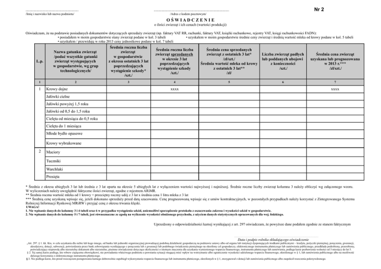 .................................................... Nr 2 .......................................................................... /Imię i nazwisko lub nazwa podmiotu/ /Adres z kodem pocztowym/ OŚWIADCZENIE o ilości zwierząt i ich cenach (wartości produkcji) Oświadczam, że na podstawie posiadanych dokumentów dotyczących sprzedaży zwierząt (np. faktury VAT RR, rachunki, faktury VAT, książki rachunkowe, rejestry VAT, księgi rachunkowości FADN): • posiadałem w moim gospodarstwie stany zwierząt podane w kol. 3 tabeli • uzyskałem w moim gospodarstwie średnie ceny zwierząt i średnią wartość mleka od krowy podane w kol. 5 tabeli • uzyskałem / przewiduję w roku 2013 ceny jednostkowe podane w kol. 7 tabeli L.p. Nazwa gatunku zwierząt /podać wszystkie gatunki zwierząt występujących w gospodarstwie, wg grup technologicznych/ Średnia roczna liczba zwierząt w gospodarstwie z okresu ostatnich 3 lat poprzedzających wystąpienie szkody* /szt./ Średnia roczna liczba zwierząt sprzedanych w okresie 3 lat poprzedzających wystąpienie szkody /szt./ Średnia cena sprzedanych zwierząt z ostatnich 3 lat* /zł/szt./ Średnia wartość mleka od krowy z ostatnich 3 lat** /zł/ Liczba zwierząt padłych lub poddanych ubojowi z konieczności /szt./ Średnia cena zwierząt uzyskana lub prognozowana w 2013 r.*** /zł/szt./ 1 2 3 4 5 6 7 1 Krowy dojne xxxx xxxx Jałówki cielne Jałówki powyżej 1,5 roku Jałówki od 0,5 do 1,5 roku Cielęta od miesiąca do 0,5 roku Cielęta do 1 miesiąca Młode bydło opasowe Krowy wybrakowane 2 Maciory Tuczniki Warchlaki Prosięta * Średnia z okresu ubiegłych 3 lat lub średnia z 3 lat oparta na okresie 5 ubiegłych lat z wyłączeniem wartości najwyższej i najniższej. Średnie roczne liczby zwierząt kolumna 3 należy obliczyć wg załączonego wzoru. W wyliczeniach należy uwzględnić faktyczne ilości zwierząt, zgodne z rejestrem ARiMR. ** Średnia roczna wartość mleka od 1 krowy = przeciętny roczny udój z 3 lat x średnia cena 1 litra mleka z 3 lat *** Średnią cenę uzyskaną wpisuje się, jeżeli dokonano sprzedaży przed datą szacowania. Cenę prognozowaną wpisuje się z umów kontraktacyjnych, w pozostałych przypadkach należy korzystać z Zintegrowanego Systemu Rolniczej Informacji Rynkowej MRiRW i przyjąć cenę z okresu trwania klęski. UWAGA! 1. Nie wpisanie danych do kolumny 3 i 4 tabeli oraz 6 w przypadku wystąpienia szkód, uniemożliwi sporządzenie protokołu z oszacowania zakresu i wysokości szkód w gospodarstwie. 2. Nie wpisanie danych do kolumny 5 i 7 tabeli, jest równoznaczne ze zgodą na wyliczenie wysokości obniżonego przychodu, z użyciem danych statystycznych opracowanych dla woj. łódzkiego. Uprzedzony o odpowiedzialności karnej wynikającej z art. 297 oświadczam, że powyższe dane podałem zgodnie ze stanem faktycznym ......................................................................................................................................................................................................................................................... Data i podpis rolnika składającego oświadczenie „Art. 297. § 1. kk. Kto, w celu uzyskania dla siebie lub kogo innego, od banku lub jednostki organizacyjnej prowadzącej podobną działalność gospodarczą na podstawie ustawy albo od organu lub instytucji dysponujących środkami publicznymi – kredytu, pożyczki pieniężnej, poręczenia, gwarancji, akredytywy, dotacji, subwencji, potwierdzenia przez bank zobowiązania wynikającego z poręczenia lub z gwarancji lub podobnego świadczenia pieniężnego na określony cel gospodarczy, elektronicznego instrumentu płatniczego lub zamówienia publicznego, przedkłada podrobiony, przerobiony, poświadczający nieprawdę albo nierzetelny dokument albo nierzetelne, pisemne oświadczenie dotyczące okoliczności o istotnym znaczeniu dla uzyskania wymienionego wsparcia finansowego, instrumentu płatniczego lub zamówienia, podlega karze pozbawienia wolności od 3 miesięcy do lat 5. § 2. Tej samej karze podlega, kto wbrew ciążącemu obowiązkowi, nie powiadamia właściwego podmiotu o powstaniu sytuacji mogącej mieć wpływ na wstrzymanie albo ograniczenie wysokości udzielonego wsparcia finansowego, określonego w § 1, lub zamówienia publicznego albo na możliwość dalszego korzystania z elektronicznego instrumentu płatniczego. § 3. Nie podlega karze, kto przed wszczęciem postępowania karnego dobrowolnie zapobiegł wykorzystaniu wsparcia finansowego lub instrumentu płatniczego, określonych w § 1, zrezygnował z dotacji lub zamówienia publicznego albo zaspokoił roszczenia pokrzywdzonego. Wzory do obliczania stanów średniorocznych zwierząt gospodarskich i przelotowości (średniej rocznej liczby zwierząt) WYJAŚNIENIA DO OBROTU STADA Sztuki przelotowe są to sztuki, które przeszły przez daną grupę technologiczną w ciągu roku, (które przebywały w danej grupie technologicznej w ciągu roku). Przelotowość, stan przelotowy – to liczba zwierząt, które przeszły przez daną grupę technologiczną w ciągu roku. Stan średnioroczny – to średnia liczba zwierząt w poszczególnych grupach technologicznych. Stan średnioroczny to okres 12 miesięcy. OBLICZANIE PRZELOTOWOŚCI I STANÓW ŚREDNIOROCZNYCH: A. Dla zwierząt przebywających w grupie technologicznej rok lub dłużej Przelotowość = stan średnioroczny Stan średnioroczny = (stan na początek roku + stan na koniec roku) / 2 B. Dla zwierząt przebywających w grupie technologicznej krócej niż 1 rok Przelotowość = sztuki na sprzedaż + na przeklasowanie + 0,5 upadków i ubojów z konieczności + 0,5 stanu na koniec roku – 0,5 stanu na początek roku Stan średnioroczny = (przelotowość x ilość miesięcy przebywania w klasie) / 12