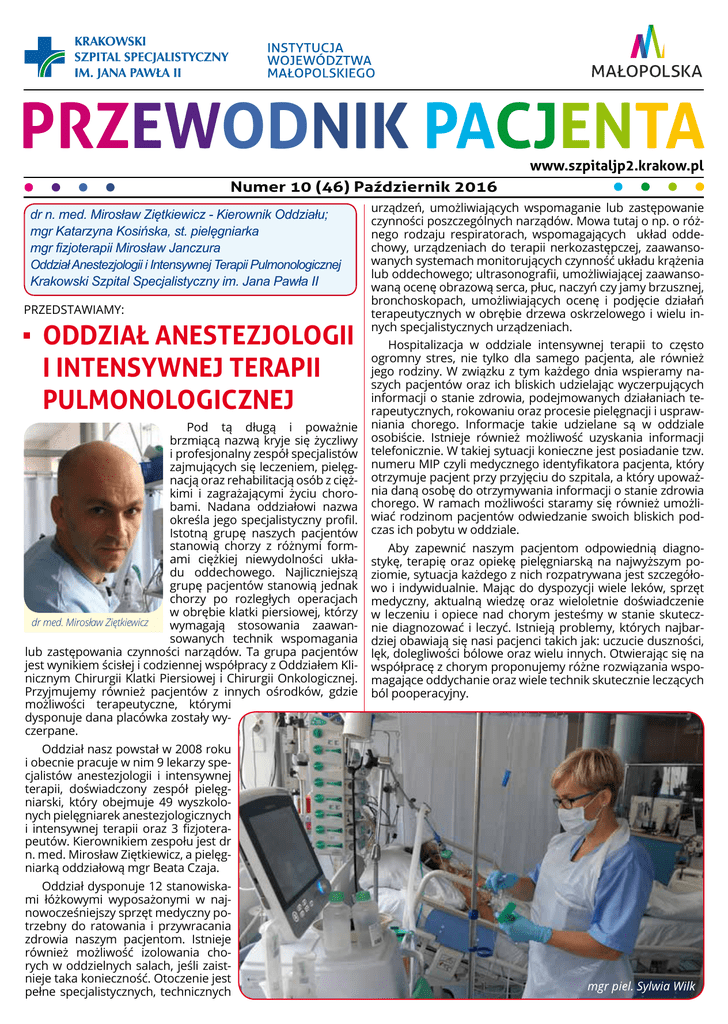 PRZEWODNIK PACJENTA www.szpitaljp2.krakow.pl Numer 10 (46) Październik 2016 dr n. med. Mirosław Ziętkiewicz - Kierownik Oddziału; mgr Katarzyna Kosińska, st. pielęgniarka mgr fizjoterapii Mirosław Janczura Oddział Anestezjologii i Intensywnej Terapii Pulmonologicznej Krakowski Szpital Specjalistyczny im. Jana Pawła II PRZEDSTAWIAMY: ODDZIAŁ ANESTEZJOLOGII I INTENSYWNEJ TERAPII PULMONOLOGICZNEJ Pod tą długą i poważnie brzmiącą nazwą kryje się życzliwy i profesjonalny zespół specjalistów zajmujących się leczeniem, pielęgnacją oraz rehabilitacją osób z ciężkimi i zagrażającymi życiu chorobami. Nadana oddziałowi nazwa określa jego specjalistyczny profil. Istotną grupę naszych pacjentów stanowią chorzy z różnymi formami ciężkiej niewydolności układu oddechowego. Najliczniejszą grupę pacjentów stanowią jednak chorzy po rozległych operacjach w obrębie klatki piersiowej, którzy dr med. Mirosław Ziętkiewicz wymagają stosowania zaawansowanych technik wspomagania lub zastępowania czynności narządów. Ta grupa pacjentów jest wynikiem ścisłej i codziennej współpracy z Oddziałem Klinicznym Chirurgii Klatki Piersiowej i Chirurgii Onkologicznej. Przyjmujemy również pacjentów z innych ośrodków, gdzie możliwości terapeutyczne, którymi dysponuje dana placówka zostały wyczerpane. Oddział nasz powstał w 2008 roku i obecnie pracuje w nim 9 lekarzy specjalistów anestezjologii i intensywnej terapii, doświadczony zespół pielęgniarski, który obejmuje 49 wyszkolonych pielęgniarek anestezjologicznych i intensywnej terapii oraz 3 fizjoterapeutów. Kierownikiem zespołu jest dr n. med. Mirosław Ziętkiewicz, a pielęgniarką oddziałową mgr Beata Czaja. Oddział dysponuje 12 stanowiskami łóżkowymi wyposażonymi w najnowocześniejszy sprzęt medyczny potrzebny do ratowania i przywracania zdrowia naszym pacjentom. Istnieje również możliwość izolowania chorych w oddzielnych salach, jeśli zaistnieje taka konieczność. Otoczenie jest pełne specjalistycznych, technicznych urządzeń, umożliwiających wspomaganie lub zastępowanie czynności poszczególnych narządów. Mowa tutaj o np. o różnego rodzaju respiratorach, wspomagających układ oddechowy, urządzeniach do terapii nerkozastępczej, zaawansowanych systemach monitorujących czynność układu krążenia lub oddechowego; ultrasonografii, umożliwiającej zaawansowaną ocenę obrazową serca, płuc, naczyń czy jamy brzusznej, bronchoskopach, umożliwiających ocenę i podjęcie działań terapeutycznych w obrębie drzewa oskrzelowego i wielu innych specjalistycznych urządzeniach. Hospitalizacja w oddziale intensywnej terapii to często ogromny stres, nie tylko dla samego pacjenta, ale również jego rodziny. W związku z tym każdego dnia wspieramy naszych pacjentów oraz ich bliskich udzielając wyczerpujących informacji o stanie zdrowia, podejmowanych działaniach terapeutycznych, rokowaniu oraz procesie pielęgnacji i usprawniania chorego. Informacje takie udzielane są w oddziale osobiście. Istnieje również możliwość uzyskania informacji telefonicznie. W takiej sytuacji konieczne jest posiadanie tzw. numeru MIP czyli medycznego identyfikatora pacjenta, który otrzymuje pacjent przy przyjęciu do szpitala, a który upoważnia daną osobę do otrzymywania informacji o stanie zdrowia chorego. W ramach możliwości staramy się również umożliwiać rodzinom pacjentów odwiedzanie swoich bliskich podczas ich pobytu w oddziale. Aby zapewnić naszym pacjentom odpowiednią diagnostykę, terapię oraz opiekę pielęgniarską na najwyższym poziomie, sytuacja każdego z nich rozpatrywana jest szczegółowo i indywidualnie. Mając do dyspozycji wiele leków, sprzęt medyczny, aktualną wiedzę oraz wieloletnie doświadczenie w leczeniu i opiece nad chorym jesteśmy w stanie skutecznie diagnozować i leczyć. Istnieją problemy, których najbardziej obawiają się nasi pacjenci takich jak: uczucie duszności, lęk, dolegliwości bólowe oraz wielu innych. Otwierając się na współpracę z chorym proponujemy różne rozwiązania wspomagające oddychanie oraz wiele technik skutecznie leczących ból pooperacyjny. Problem skutecznej terapii bólu jest przedmiotem szczególnej troski naszego zespołu. Mamy świadomość, że ból jest tym, czego pacjent decydujący się na operację boi się najbardziej. Od lipca 2010 Oddział Anestezjologii i Intensywnej Terapii Pulmonologicznej posiada ogólnopolski certyfikat Polskiego Towarzystwa Badania Bólu „Szpital bez bólu”, w ramach którego prowadzony jest intensywny nadzór, monitorowanie i leczenie bólu, zarówno pooperacyjnego jak i przewlekłego. Wśród stosowanych przez nas zróżnicowanych metod leczenia bólu szczególnie istotne miejsce zajmują techniki znieczulenia miejscowego. Oczywiście, zgodnie ze wszelkimi wymogami oraz dobrą praktyką, prowadzimy 24 godzinny nadzór nad chorym nie tylko poprzez monitorowanie parametrów życiowych, ale również poprzez stałą obecność przy pacjencie. W ramach szeroko pojętej opieki pielęgniarskiej nasz liczny i zgrany zespół każdego dnia wykonuje szereg czynności, których głównym celem jest zapewnienie skutecznej terapii oraz starannej pielęgnacji chorego. W tym celu, w zależności od stanu pacjenta, każda z pielęgniarek ma pod opieką najczęściej od 1 do 2 chorych. Pielęgnowanie pacjentów hospitalizowanych w oddziałach anestezjologii i intensywnej opieki jest zadaniem wymagającym dużego zaangażowania, wiedzy i wielu umiejętności począwszy od starannej obserwacji chorego, poprzez czynności typowo pielęgnacyjne takie jak np. wykonanie codziennej toalety ciała, aż do umiejętności zabiegowych, czy zdolności obsługi nowoczesnego sprzętu medycznego. Pielęgniarki monitorują czynności życiowe chorego, leczą i pielęgnują odleżyny, nadzorują i pielęgnują rany pooperacyjne oraz drenaże, uczestniczą w procesie leczenia bólu poo