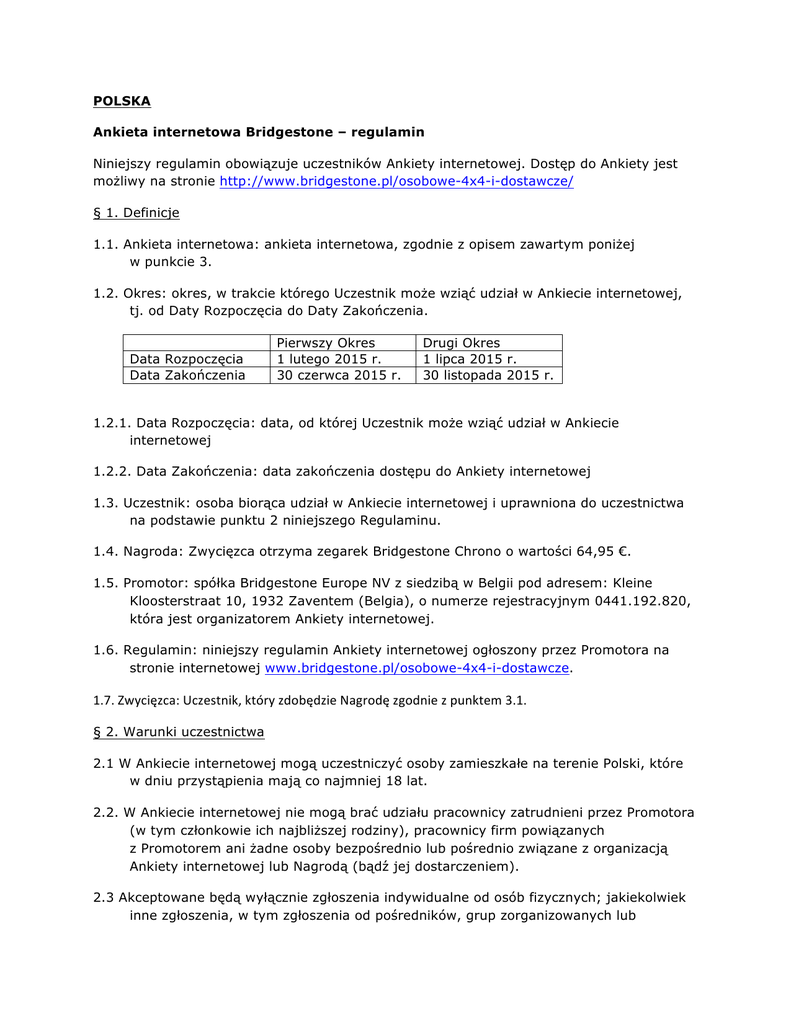 POLSKA Ankieta internetowa Bridgestone – regulamin Niniejszy regulamin obowiązuje uczestników Ankiety internetowej. Dostęp do Ankiety jest możliwy na stronie http://www.bridgestone.pl/osobowe-4x4-i-dostawcze/ § 1. Definicje 1.1. Ankieta internetowa: ankieta internetowa, zgodnie z opisem zawartym poniżej w punkcie 3. 1.2. Okres: okres, w trakcie którego Uczestnik może wziąć udział w Ankiecie internetowej, tj. od Daty Rozpoczęcia do Daty Zakończenia. Data Rozpoczęcia Data Zakończenia Pierwszy Okres 1 lutego 2015 r. 30 czerwca 2015 r. Drugi Okres 1 lipca 2015 r. 30 listopada 2015 r. 1.2.1. Data Rozpoczęcia: data, od której Uczestnik może wziąć udział w Ankiecie internetowej 1.2.2. Data Zakończenia: data zakończenia dostępu do Ankiety internetowej 1.3. Uczestnik: osoba biorąca udział w Ankiecie internetowej i uprawniona do uczestnictwa na podstawie punktu 2 niniejszego Regulaminu. 1.4. Nagroda: Zwycięzca otrzyma zegarek Bridgestone Chrono o wartości 64,95 €. 1.5. Promotor: spółka Bridgestone Europe NV z siedzibą w Belgii pod adresem: Kleine Kloosterstraat 10, 1932 Zaventem (Belgia), o numerze rejestracyjnym 0441.192.820, która jest organizatorem Ankiety internetowej. 1.6. Regulamin: niniejszy regulamin Ankiety internetowej ogłoszony przez Promotora na stronie internetowej www.bridgestone.pl/osobowe-4x4-i-dostawcze. 1.7. Zwycięzca: Uczestnik, który zdobędzie Nagrodę zgodnie z punktem 3.1. § 2. Warunki uczestnictwa 2.1 W Ankiecie internetowej mogą uczestniczyć osoby zamieszkałe na terenie Polski, które w dniu przystąpienia mają co najmniej 18 lat. 2.2. W Ankiecie internetowej nie mogą brać udziału pracownicy zatrudnieni przez Promotora (w tym członkowie ich najbliższej rodziny), pracownicy firm powiązanych z Promotorem ani żadne osoby bezpośrednio lub pośrednio związane z organizacją Ankiety internetowej lub Nagrodą (bądź jej dostarczeniem). 2.3 Akceptowane będą wyłącznie zgłoszenia indywidualne od osób fizycznych; jakiekolwiek inne zgłoszenia, w tym zgłoszenia od pośredników, grup zorganizowanych lub wygenerowane automatycznie przez komputer nie będą akceptowane. Aby zgłosić udział, Uczestnik musi wejść na stronę internetową www.bridgestone.pl/osobowe-4x4i-dostawcze/. Aby zgłoszenie mogło zostać zakwalifikowane, Uczestnik musi uczestniczyć w Ankiecie internetowej i musi zarejestrować się przy użyciu prawidłowego adresu e-mail. 2.4. Zgłoszenia mogą być przesyłane wyłącznie drogą internetową za pośrednictwem strony www.bridgestone.pl/osobowe-4x4-i-dostawcze/; zgłoszenia nie mogą być przesyłane pocztą. 2.5. Rejestracja w Ankiecie internetowej jest bezpłatna, co oznacza, że Uczestnik nie musi dokonać żadnego zakupu ani nie ponosi żadnych dodatkowych kosztów poza dotychczas poniesionymi, jak np. opłata za połączenie z Internetem. 2.6. Decydując się na udział w Ankiecie internetowej, Uczestnik akceptuje Regulamin. 2.7. Regulamin, Zasady prywatności i Zasady dotyczące plików cookie są dostępne na stronie internetowej http://www.bridgestone.pl. 2.8. Promotor zastrzega sobie prawo do wyłączenia z udziału Uczestników, którzy podają niepełne lub fałszywe dane, oraz do odrzucenia zgłoszeń Uczestników, którzy dopuszczają się nadużycia, manipulacji, obejścia lub próby manipulacji lub obejścia w stosunku do zasad Regulaminu bądź jakiegokolwiek rodzaju oszustwa. 2.9. Uczestnicy mogą brać udział w Ankiecie internetowej tylko w czasie trwania Ankiety internetowej i w sposób opisany w niniejszym Regulaminie. 2.10. Każdy Uczestnik może przesłać tylko jedno zgłoszenie. 2.11. Aby wziąć udział w Ankiecie internetowej, Uczestnik musi posiadać dostęp do szerokopasmowego łącza internetowego z komputera, smartfona lub innego urządzenia. § 3. Zwycięzca 3.1. Zwycięzcy otrzymają zegarek Bridgestone Chrono o wartości 64,95 €. 3.2. Losowanie Zwycięzców będzie miało miejsce pierwszego dnia roboczego, licząc od Daty Zakończenia każdego Okresu. 3.3. Nagroda jest imienna i nie podlega wymianie na gotówkę, towary i/lub usługi. 3.4. Zwycięzca zostanie powiadomiony drogą elektroniczną w ciągu 5 dni roboczych, licząc od Daty Zakończenia. 3.5. Jeżeli Zwycięzca nie zgłosi się po odbiór Nagrody w ciągu 3 dni od dnia otrzymania powiadomienia poprzez przesłanie odpowiedzi na e-mail powiadomienia zawierającej pełny adres zamieszkania, Promotor zastrzega sobie prawo do wybrania innego Zwycięzcy, który otrzyma Nagrodę, zgodnie z procedurą opisaną w punktach 3.1. i 3.2. § 4. Wyłączenie odpowiedzialności 4.1. Promotor, jego pracownicy, strony połączone z Promotorem stosunkiem umownym lub osoby w inny sposób związane z Ankietą internetową nie ponoszą odpowiedzialności za żadne szkody spowodowane Nagrodą (w tym jej przyznawaniem i/lub wykorzystaniem) lub uczestnictwem w Ankiecie internetowej, z wyjątkiem uszkodzenia ciała lub śmierci wskutek winy umyślnej lub rażącego niedbalstwa lub w związku z podstawowymi zobowiązaniami umownymi Promotora. 4.2. Promotor, jego pracownicy, strony połączone z Promotorem stosunkiem umownym lub osoby w inny sposób związane z Ankietą internetową nie ponoszą odpowiedzialności za zgłoszenia Uczestników, które zostały zagubione, nieukończone lub uszkodzone wskutek zdarzeń niezależnych od Promotora, takie jak zakłócenia w funkcjonowaniu oprogramowania, urządzeń należących do Uczestnika, jego sieci komputerowej, połączenia internetowego itp. 4.3. Promotor nie udziela żadnych gwarancji dotyczących udostępnionej Nagrody i nie ponosi odpowiedzialności z tym związanej (z wyjątkiem winy umyślnej lub rażącego niedbalstwa). Promotor nie ponosi odpowiedzialności za wady Nagród, na przykład w przypadkach gdy Nagroda zostanie przekazana lub odebrana później niż wskazywałby ogłoszony termin lub jeżeli (zastępcza) Nagroda różni się od Nagrody zaoferowanej początkowo. 4.4 N