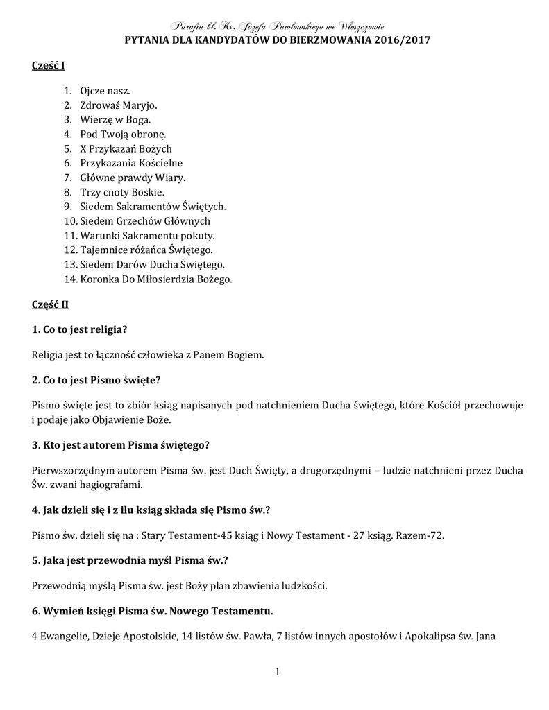 PYTANIA DLA KANDYDATÓW DO BIERZMOWANIA 2016/2017 Część I 1. Ojcze nasz. 2. Zdrowaś Maryjo. 3. Wierzę w Boga. 4. Pod Twoją obronę. 5. X Przykazań Bożych 6. Przykazania Kościelne 7. Główne prawdy Wiary. 8. Trzy cnoty Boskie. 9. Siedem Sakramentów Świętych. 10. Siedem Grzechów Głównych 11. Warunki Sakramentu pokuty. 12. Tajemnice różańca Świętego. 13. Siedem Darów Ducha Świętego. 14. Koronka Do Miłosierdzia Bożego. Część II 1. Co to jest religia? Religia jest to łączność człowieka z Panem Bogiem. 2. Co to jest Pismo święte? Pismo święte jest to zbiór ksiąg napisanych pod natchnieniem Ducha świętego, które Kościół przechowuje i podaje jako Objawienie Boże. 3. Kto jest autorem Pisma świętego? Pierwszorzędnym autorem Pisma św. jest Duch Święty, a drugorzędnymi – ludzie natchnieni przez Ducha Św. zwani hagiografami. 4. Jak dzieli się i z ilu ksiąg składa się Pismo św.? Pismo św. dzieli się na : Stary Testament-45 ksiąg i Nowy Testament - 27 ksiąg. Razem-72. 5. Jaka jest przewodnia myśl Pisma św.? Przewodnią myślą Pisma św. jest Boży plan zbawienia ludzkości. 6. Wymień księgi Pisma św. Nowego Testamentu. 4 Ewangelie, Dzieje Apostolskie, 14 listów św. Pawła, 7 listów innych apostołów i Apokalipsa św. Jana 1 7. Co to jest Tradycja? Tradycja czyli podanie ustne jest to zbiór objawionych prawd Bożych niespisanych w Piśmie św., przekazywanych przez Urząd Nauczycielski Kościoła; stanowi część Objawienia. 8. Na czym opieramy przekonanie o istnieniu Boga? O istnieniu Pana Boga możemy wnioskować : a. z istnienia świata i przedziwnego ładu na tym świecie, b. z przekonania niemal wszystkich ludów, c. z własnego sumienia, d. z Objawienia Bożego (wiara). 9. Jakie przymioty przypisujemy Panu Bogu? Pan Bóg jest : a. wieczny - zawsze był, jest i będzie, b. wszechmocny - wszystko może czynić, co jest dobre i wewnętrznie niesprzeczne, c. niezmienny - zawsze jest ten sam, d. mądry i święty - jest źródłem wszelkiej prawdy i dobra, e. miłosierny i sprawiedliwy. 10. W jaki sposób przygotował Pan Bóg ludzi na przyjście Zbawiciela czyli Mesjasza? Pan Bóg przygotował ludzi przez historię narodu wybranego - Izraela, a zwłaszcza przez: a. proroctwa mesjańskie, b. figury mesjańskie 11. Co to są proroctwa mesjańskie? Proroctwa mesjańskie są to przepowiednie proroków Starego Testamentu o mającym przyjść Mesjaszu. 12. Co to są figury mesjańskie? Figury mesjańskie są to osoby, rzeczy lud zdarzenia ze Starego Testamentu, które noszą pewne podobieństwa do życia i czynów przyszłego Zbawiciela. 2 13. Kto jest obiecanym Zbawicielem? Obiecanym Zbawicielem jest Jezus Chrystus 14. Kim jest Jezus Chrystus dla chrześcijanina? Jezus Chrystus jest Synem Bożym, który stał się człowiekiem dla naszego zbawienia. 15. Skąd wnosimy, że Jezus z Nazaretu jest Bogiem? O tym, że Pan Jezus jest Bogiem wiemy, gdyż : a. zaświadczył o tym Bóg Ojciec/ Jordan, Tabor /, b. wyznał to niejednokrotnie i na różne sposoby sam Jezus, c. świadczyli o tym nieprzerwanie Apostołowie, d. Jezus potwierdził swoje wyznanie cudami i Zmartwychwstaniem. Część III 1. Co to jest Kościół Katolicki? Dostrzegamy dwa wymiary Kościoła: zewnętrzny i duchowy: a. Kościół Katolicki jest to zjednoczenie chrześcijan, którzy pod przewodnictwem papieża dążą do zbawienia przez wyznawanie tej samej wiary i przyjmowanie tych samych sakramentów świętych; b. Kościół jest Ciałem Mistycznym Jezusa Chrystusa czyli żywym, nadprzyrodzonym organizmem, którego Głową jest Chrystus, członkami zaś ludzie zjednoczeni z Chrystusem przez Łaskę i wiarę. 2. Co to jest Łaska Uświęcająca? Łaska Uświęcająca jest to dar Boży, który czyni nas dziećmi i przyjaciółmi Boga. 3. Jaki jest cel i zadanie Kościoła? Zadaniem Kościoła jest kontynuowanie zbawczej misji Chrystusa czyli prowadzenie wszystkich ludzi do zjednoczenia z Bogiem na ziemi i w wieczności (zbawienie wieczne). 4. Jaką władzę dał Pan Jezus Kościołowi? Pan Jezus dał Kościołowi potrójną władzę: nauczania, uświęcania i pasterzowania. 5. Przezkogo Pan Jezus podtrzymuje, ożywia i umacnia swój Kościół? Pan Jezus ożywia i umacnia swój Kościół przez Ducha Świętego. 3 6. Kim jest Duch Święty? Duch Św. jest to trzecia osoba Boska, która pochodzi od Ojca i Syna. 7. Kiedy Duch Św. zstąpił na Apostołów? Duch Św. zstąpił na Apostołów w postaci ognistych języków w dzień Zielonych Świąt zwanych inaczej Pięćdziesiątnicą. 8. Kiedy Duch Św. zstępuje na nas? Duch Św. zstępuje na nas przy Chrzcie św., ale w szczególny sposób napełnia nas swoją mocą podczas Bierzmowania. 9. Co to jest sumienie? Sumienie jest to uzdolnienie, które pozwala nam odróżnić dobro od zła; pobudza nas do pełnienia dobra, a powstrzymuje od zła i jest naszym sędzią. 10. Kiedy człowiek popełnia grzech? Człowiek popełnia grzech, kiedy świadomie i dobrowolnie przekracza Prawo Boże zawarte w przykazaniach Bożych i kościelnych. 11. Na czy polega grzech ciężki? Grzech ciężki polega na tym, że człowiek przekracza przykazanie Boże lub kościelne w rzeczy ważnej w pełni świadomie i dobrowolnie; odwraca się od Boga, a zwraca się ku rzeczom lub osobom, jako do Boga. 12. Jakie są główne źródła grzechu? Źródłami grzechu są: szatan, nasze złe skłonności i złe otoczenie czyli źli ludzie. 13. Wymień grzechy główne, które są źródłem innych grzechów. Grzechy główne; pycha, chciwość, nieczystość, zazdrość, nieumiarkowanie w jedzeniu i piciu, gniew, lenistwo. 14. Co to są grzechy cudze? Grzechy cudze popełniamy wówczas, gdy pomagamy bliźniemu grzeszyć, lub nie powstrzymujemy go od grzechu, gdy możemy to uczynić. 15. Co to jest modlitwa? Modlitwa jest to wzniesienie myśli i uczuć do Boga dla oddania Mu czci należnej i uproszenia Łask potrzebnych. 4 16. Dlaczego powinniśmy się 