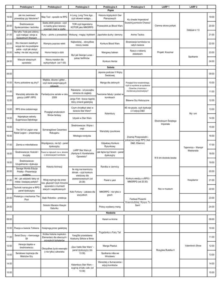 Prelekcyjna 1 19:00 20:00 21:00 22:00 23:00 24:00 Prelekcyjna 2 Jak nie zwariować Map Tool - sposób na RPG prowadząc gry fabularne? Średniowiecze: Społeczeństwo i technika Szata zdobi gracza - czyli co kaŜdy gracz larpowy powinien mieć w szafie Prelekcyjna 3 Prelekcyjna 4 Piątek A Long, Long Time Ago… czyli słowem wstępu… Historia Azjatyckich Gier Planszowych TOR czyli legendarny KOTOR jako MMORPG Przewodnik po Blood Wars Nie tylko Yoda jest zielony Runy – pismo z przeszłości Wolsung - magią i trybikiem Japońskie duchy i demony czyli makijaŜ i stroje w Gwiezdnych Wojnach Kto mieczem świetlnym wojuje ten ma poobijane palce - czyli jak ułoŜyć walkę i nie dać się pociąć Wieczór strasznych opowieści Wampiry poprzez wieki Najbardziej... obrzydliwe rzeczy świata Horror kiedyś a dziś Nocny maraton dla wytrzymalych (od 1:00) Prelekcyjna 5 LARP 1 LARP 2 19:00 Ku chwale Imperatora! Sczeźnij pomiocie Chaosu! Ciemna strona polityki 20:00 Oddział nr 13 Anime Tactics 21:00 Konkurs Blood Wars Ekranizacje komiksów na całym świecie 22:00 Mangowy balwan Rzecz o robieniu Ŝelastwem Być jak George Lucas pokaz fanfilmów Projekt: Koszmar 23:00 Spotkanie Konkurs Hentai 24:00 Sobota Japonia podczas II Wojny Światowej 09:00 10:00 Komu potrzebne są ziny? Miękkie, śliczne i glitter... czyli świat pasjonujących zabawek Warsztaty aktorskie dla graczy LARP i RPG Fantastyczne seriale w roku 2009 11:00 12:00 13:00 14:00 RPG dnia codziennego Największe sekrety Eugeniusza Dębskiego Przegląd amatorskich filmów fantasy Szmaragdowe Cesarstwo Rokuganu 16:00 17:00 18:00 19:00 20:00 Rakatanie - od początku istnienia do zagłady Jango Fett - łowca nagród, który zmienił galaktykę Średniowiecze: Kościół i krucjaty 10:00 Bitewne Gry Historyczne 12:00 11:00 Tworzenie fabuły i postaci w komiksach Czym chciałbyś latać w świecie Star Wars? 4E nie gryzie, czyli dyskusje o 4 edycji D&D 13:00 Kalambury My i oni 14:00 Ekwinokcjum Świętego Imperiała Średniowiecze: Wojna i oręŜ 15:00 Warsztaty rysunkowe Mitologia nordycka Ziemia w mikrofalówce Przegląd kina nowatorskiego, czyli co wyniknie ze spotkania Clownów z kosmosu i morderczej prezerwatywy? UŜywki w Star Wars 15:00 The 501’st Legion oraz Rebel Legion – prezentacja Manga dla zielonych 09:00 Współgraczu, nie bij! - panel dyskusyjny Faceci w rajtuzach na w. ekranie - o ekranizacjach komiksów Odpałowy Konkurs Rysunkowy LARP Star Wars pt. „Kantyna II: Koreliańskie Opowieści” 16:00 Znamię Przepowiedni pokazowa sesja RPG (4ed. D&D, Eberron) 17:00 Tajemnica – Wampir Maskarada Jak fajnie być fanem - panel dyskusyjny 18:00 W 8 dni dookoła świata Średniowiecze: Uzupełnienie i dyskusja Savage Worlds Edycja Polska - Prezentacja systemu 19:00 Historia Animacji Randka w ciemnicy Ile nóg ma kosmiczny ślimak – czyli konkurs wiedzowy dla zaawansowanych (od 20:30) AK - jak oddzielić fakty od Mózg wyjmuje się przez mitów i bieŜącej polityki? nos, głupcze! Czyli mroczne opowieści o mumiach Techniki narracyjne w RPG 22:00 starych i współczesnych panel dyskusyjny Koło Fortuny – zabawa dla wszystkich Prelekcja o mechanice The 23:00 Bajki Robotów - prelekcja Pool 21:00 Sobotni Maraton Klasyki Gatunku 24:00 20:00 Panel o yaoi Konkurs wiedzy o cRPG i MMORPG (od 20:30) Hospiterror Noc w muzeum 21:00 22:00 MMORPG - nie tylko o grach Polscy wydawcy mang 23:00 Festiwal Piosenki Krasnoludzkiej: Wyrycz To Sam! 24:00 Niedziela 09:00 Harem w Anime 10:00 Poezja w świecie Tolkiena 11:00 Świat Diuny – równowaga Sił 12:00 Herezje śląskie w średniowieczu 13:00 14:00 15:00 Serialowe inspiracje dla Mistrzów Gry 09:00 Hulajnogą przez galaktykę 10:00 Pogadanka o Fairy Tail Krótka historia męskości. Elementarz dla obecnych i przyszłych bohaterów YangObi przedstawia: Kostiumy Sithów w filmie Obrzydliwe Ŝycie wewnątrz (i nie tylko) człowieka „Quo Vadis Star Wars” panel dyskusyjny (do 13:30) Kalambury Star Wars – wyginaj śmiało ciało (od 13:30) 11:00 Valentine's Show Manga Plastuś 12:00 Rosyjska Ruletka II Spotkania m&a we Wrocławiu 13:00 Warsztaty z tłumaczenia i edycji komiksów 14:00 15:00