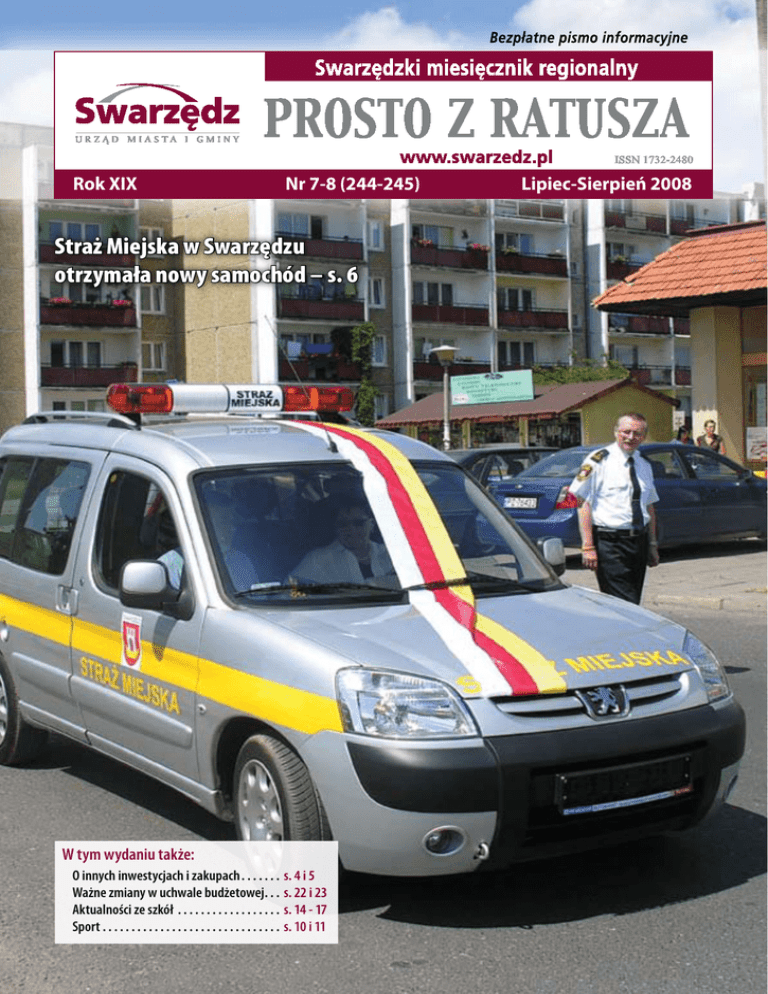 Rok XIX Nr 7-8 (244-245) Straż Miejska w Swarzędzu otrzymała nowy samochód – s. 6 W tym wydaniu także: O innych inwestycjach i zakupach. . . . . . . Ważne zmiany w uchwale budżetowej. . . Aktualności ze szkół . . . . . . . . . . . . . . . . . . Sport. . . . . . . . . . . . . . . . . . . . . . . . . . . . . . . s. 4 i 5 s. 22 i 23 s. 14 - 17 s. 10 i 11 Lipiec-Sierpień 2008 Aktualności Prosto z Ratusza XXIV sesja Rady Miejskiej dotychczas specjalista do spraw marketingu w zakładzie budżetowym Pływalnia „Wodny Raj”. Zmiany w inwestycjach Jednym z głównych punktów obrad XXIV sesji Rady Miejskiej 3 czerwca 2008 było rozpatrzenie projektu zmian w tegorocznej uchwale budżetowej. Najwięcej zmian zaproponowanych przez Burmistrz Annę Tomicką dotyczyło planów inwestycyjnych. M.W. Projekt radykalnej przebudowy zamierzeń inwestycyjnych był wcześniej dogłębnie analizowany podczas prac w komisjach, wobec czego podczas sesji radni, po rzeczowej dyskusji i zgłoszeniu kilku poprawek, jednogłośnie przyjęli proponowane zmiany w uchwale budżetowej. (Przedstawiamy je na stronach 22 i 23 tego wydania „Prosto z Ratusza). Podczas XXIV sesji Rady Miejskiej Swarzędza, radni jednogłośnie podjęli uchwałę w sprawie powołania sekretarza Gminy Swarzędz. Na wniosek burmistrz Anny Tomickiej sekretarzem została pani Agata Kuszyńska – Fot. M.Woliński – Po dokładnej analizie zapisów planu i ocenie realności tych zamierzeń postanowiliśmy zaproponować radnym szereg istotnych zmian. Część inwestycji, o których już teraz wiadomo, że – z różnych względów - nie mają szansy na realizację – przesuwamy na lata następne, inne natomiast, pierwotnie planowane na późniejszy czas, proponujemy realizować wcześniej – mówił zastępca burmistrza Adam Trawiński. Zależy nam na tym, aby plany inwestycyjne były realne, żeby pod koniec roku znów nie okazało się, że nie potrafimy wydać pieniędzy, którymi dysponujemy – podkreślał wiceburmistrz. Burmistrz Anna Tomicka przedstawiła również drugiego zastępcę burmistrza, którym została pani Agata Kubacka – do- tychczas dyrektor Gimnazjum nr 2 w Swarzędzu. Burmistrz Agacie Kubackiej podlegać będą w Urzędzie Miasta i Gminy m.in. sprawy związane z oświatą, kulturą i opieką społeczną. Burmistrz Anna Tomicka z drugim zastępcą burmistrza Agatą Kubacką. UWAGA!!! Nzoz Medlife Profilaktyka raka szyjki macicy - pogadanki, wykłady – Centrum Pomocy Doraźnej i Ratunkowej i badania Informuję, że od 01.07.2008 NZOZ MEDLIFE – CENTRUM POMOCY DORAŹNEJ I RATUNKOWEJ przejmuje opiekę nad Państwem w zakresie doraźnej pomocy medycznej nocnej i świątecznej, w godzinach 18.00 – 7.00. Od tego dnia w zakresie udzielenia w/w pomocy proszę kierować się pod adres: OS.RACZYŃSKIEGO 2/23, NOWA WIEŚ (budynek NZOZ Art. Medicum – po przejechaniu pod wiaduktem kolejowym obok stacji paliw BP proszę kierować się w lewo w kierunku bloków, i naprzeciw centrum handlowego, na końcu domów po prawej stronie skręcić w osiedlową uliczkę w prawo, między domy). Poradę lekarską uzyskacie Państwo, również pod numerem telefonu: 0 666 891 666 Jednocześnie informuję, że w zakresie: l nagłych zachorowań l stanów ostrych, zagrażających życiu l wypadków w Swarzędzu dalej dyżurują 2 zespoły wyjazdowe: ratowniczy oraz z lekarzem, Rejonowej Stacji Pogotowia Ratunkowego, na Osiedlu Dąbrowszczaków 8/12 w Swarzędzu, gdzie obecnie mieści się stacja Pogotowia Ratunkowego, pod numerem telefonu: 999, 112. Z poważaniem, Lek. med. Marek Stawski – Kierownik NZOZ MedLife W czerwcu Burmistrz Miasta i Gminy Swarzędz zaprosiła mieszkanki naszej gminy na pogadanki i wykłady poświęcone profilaktyce raka szyjki macicy, które odbyły się w Szkole Podstawowej nr 5 na os. Mielżyńskiego oraz w Gimnazjum nr 3 na os. Czwartaków w Swarzędzu. W późniejszym terminie Panie w wieku 25 - 59 lat zostaną imiennie zaproszone przez Burmistrza Swarzędza na bezpłatne badania cytologiczne w ramach profilaktyki raka szyjki macicy. R. Lipiec – Sierpień 2008 Inwestycje Prosto z Ratusza Trybuny „Unii” bezpieczne – wykonawca usuwa usterki Urząd Miasta i Gminy w Swarzędzu wyjaśnia nieprawdziwe informacje na temat problemów, jakie pojawiły się na zmodernizowanej trybunie stadionu Unii. Informacje na temat rzekomego zagrożenia katastrofą budowlaną podnoszone były w minionych miesiącach zarówno na sesjach Rady Miejskiej, jak i w komunikacie p.o. burmistrza Marka Baumgarta wydanym tuż po przegranych przez niego wyborach. Zacytujmy ten komunikat: „Po szczegółowej analizie opinii biegłego sądowego, która wpłynęła do Urzędu w dniu 27 marca 2008 roku i której przedmiotem było między innymi sprawdzenie realizacji inwestycji obejmującej budowę trybun z zadaszeniem i pomieszczeniami dla komentatorów przy stadionie klubu sportowego „Unia”, w trosce o bezpieczeństwo widzów i innych mogących przebywać tam osób, podjęta została decyzja o natychmiastowym wyłączeniu wskazanej inwestycji z użytkowania. Budynek z pomieszczeniami dla komentatorów oraz trybuny będą wyłączone z użytkowania do czasu uzyskania eks- pertyzy budowlanej wskazującej na brak zagrożenia katastrofą budowlaną.” Zgodnie z wnioskiem biegłego 4 czerwca 2008 została przekazana „Opinia dotycząca stanu technicznego oraz przyczyn uszkodzeń nasypu i trybun na stadionie Unii w Swarzędzu” sporządzona przez Instytut Konstrukcji Budowlanych Politechniki Poznańskiej. Jej autor, dr inż. Błażej Zgoła, dokonał przeglądu obiektu oraz dokumentacji wykonawczej i atestów materiałów użytych do budowy. Nie stwierdził, aby obiekt stanowił jakiekolwiek zagrożenie dla bezpieczeństwa widzów i innych mogących korzystać z niego osób. Opinia zawiera natomiast zalecenia co do naprawy usterek. Wyjaśnijmy istotę problemu. Konstrukcja obiektu (trybuna z zadaszeniem) jest wykonana bezpie
