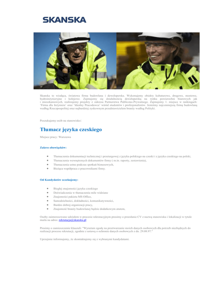 Skanska to wiodąca, światowa firma budowlana i deweloperska. Wykonujemy obiekty kubaturowe, drogowe, mostowe, hydroinżynieryjne i kolejowe. Zajmujemy się działalnością deweloperską na rynku powierzchni biurowych jak i mieszkaniowych, realizujemy projekty z zakresu Partnerstwa Publiczno-Prywatnego. Zajmujemy 1. miejsce w rankingach: ‘Firma dla Inżyniera’ oraz ‘Idealny Pracodawca’ wśród studentów i profesjonalistów. Jesteśmy najcenniejszą firmą budowlaną według Rzeczpospolitej oraz najbardziej zyskownym przedstawicielem branży według Polityki. Poszukujemy osób na stanowisko: Tłumacz języka czeskiego Miejsce pracy: Warszawa Zakres obowiązków: Tłumaczenia dokumentacji technicznej i przetargowej z języka polskiego na czeski i z języka czeskiego na polski, Tłumaczenia wewnętrznych dokumentów firmy ( m.in. raporty, zestawienia), Tłumaczenia ustne podczas spotkań biznesowych, Bieżąca współpraca z pracownikami firmy. Od Kandydatów oczekujemy: Biegłej znajomości języka czeskiego Doświadczenia w tłumaczeniu mile widziane Znajomości pakietu MS Office, Samodzielności, dokładności, komunikatywności, Bardzo dobrej organizacji pracy, Znajomość branży budowlanej będzie dodatkowym atutem, Osoby zainteresowane udziałem w procesie rekrutacyjnym prosimy o przesłanie CV z nazwą stanowiska i lokalizacji w tytule maila na adres: [email protected] Prosimy o zamieszczenie klauzuli: "Wyrażam zgodę na przetwarzanie moich danych osobowych dla potrzeb niezbędnych do realizacji procesu rekrutacji, zgodnie z ustawą o ochronie danych osobowych z dn. 29.08.97." Uprzejmie informujemy, że skontaktujemy się z wybranymi kandydatami.