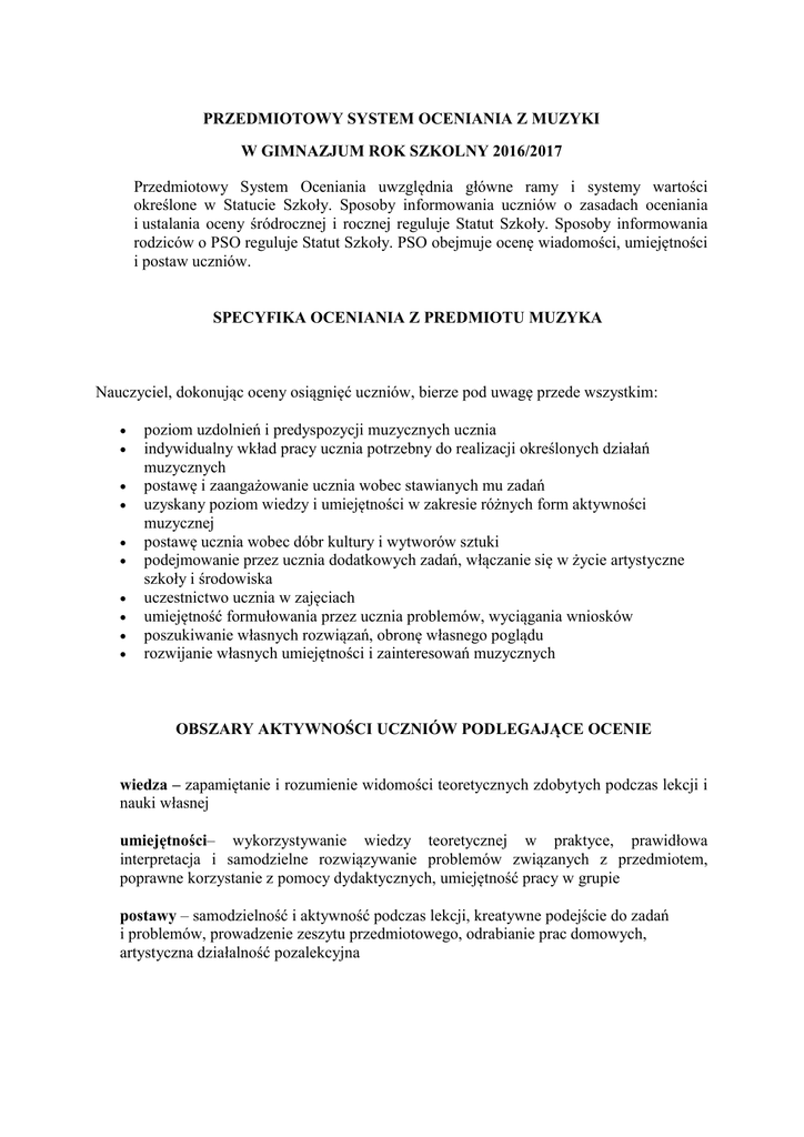 PRZEDMIOTOWY SYSTEM OCENIANIA Z MUZYKI W GIMNAZJUM ROK SZKOLNY 2016/2017 Przedmiotowy System Oceniania uwzględnia główne ramy i systemy wartości określone w Statucie Szkoły. Sposoby informowania uczniów o zasadach oceniania i ustalania oceny śródrocznej i rocznej reguluje Statut Szkoły. Sposoby informowania rodziców o PSO reguluje Statut Szkoły. PSO obejmuje ocenę wiadomości, umiejętności i postaw uczniów. SPECYFIKA OCENIANIA Z PREDMIOTU MUZYKA Nauczyciel, dokonując oceny osiągnięć uczniów, bierze pod uwagę przede wszystkim: poziom uzdolnień i predyspozycji muzycznych ucznia indywidualny wkład pracy ucznia potrzebny do realizacji określonych działań muzycznych postawę i zaangażowanie ucznia wobec stawianych mu zadań uzyskany poziom wiedzy i umiejętności w zakresie różnych form aktywności muzycznej postawę ucznia wobec dóbr kultury i wytworów sztuki podejmowanie przez ucznia dodatkowych zadań, włączanie się w życie artystyczne szkoły i środowiska uczestnictwo ucznia w zajęciach umiejętność formułowania przez ucznia problemów, wyciągania wniosków poszukiwanie własnych rozwiązań, obronę własnego poglądu rozwijanie własnych umiejętności i zainteresowań muzycznych OBSZARY AKTYWNOŚCI UCZNIÓW PODLEGAJĄCE OCENIE wiedza – zapamiętanie i rozumienie widomości teoretycznych zdobytych podczas lekcji i nauki własnej umiejętności– wykorzystywanie wiedzy teoretycznej w praktyce, prawidłowa interpretacja i samodzielne rozwiązywanie problemów związanych z przedmiotem, poprawne korzystanie z pomocy dydaktycznych, umiejętność pracy w grupie postawy – samodzielność i aktywność podczas lekcji, kreatywne podejście do zadań i problemów, prowadzenie zeszytu przedmiotowego, odrabianie prac domowych, artystyczna działalność pozalekcyjna OGÓLNE WYMAGANIA EDUKACYJNE: • Orientacja w dziełach muzycznych oraz najważniejszych wydarzeniach współczesnego życia kulturalnego w kraju i na świecie. • Znajomość podstawowych zasad budowy dzieł muzycznych • Umiejętność śpiewania w zespole jednogłosowym, z właściwą emisją głosu i w określonej skali głosu • Umiejętność dokonania prostej analizy słuchanego utworu muzycznego • Zdolność porównawczego myślenia o różnych stylach i kierunkach w sztuce. • Własny system wartościowania różnych zjawisk w sztuce i umiejętność właściwego reagowania na te zjawiska. • Umiejętność pracy zespołowej opartej o twórcze działania artystyczne • Chęć rozwijania swojej wiedzy i umiejętności z zakresu sztuki • Chęć uczestniczenia w życiu kulturalnym szkoły, regionu. • Aktywność, zaangażowanie i odpowiednia postawa na zajęciach muzyki NARZĘDZIA POMIARU sprawdziany ( jeden sprawdzian obejmuje 2 epoki) śpiew analiza utworów muzycznych referaty, prezentacje zeszyt przedmiotowy zadania domowe uczestnictwo w konkursach i olimpiadach związanych z przedmiotem wkład w przygotowanie imprez szkolnych FORMY SPRAWDZANIA POSTĘPÓW UCZNIA sprawdziany obejmujące wiadomości z dwóch działów czas trwania w zależności od zakresu materiału, (waga 5 kolor czerwony) Nauczyciel zamiast oceny sumującej ze sprawdzianu, może stosować ocenę opisową zwrotną z częstotliwością jedna na semestr. śpiew piosenek w małej grupie( 2-4 osoby), (waga 3 kolor zielony) prace domowe, (waga 1 kolor szary) prowadzenie zeszytu,(waga 2, kolor jasny szary) wypowiedzi uczniów w trakcie dyskusji oraz w związku ze słuchaniem muzyki, (waga 4 kolor niebieski) muzyczne ćwiczenia, zagadki, rebusy, (waga 1 kolor brązowy) długoterminowe prace projektowe ( gazetki, albumy, plakaty ),(waga 2 kolor złoty) udział ucznia w konkursach i olimpiadach artystycznych, (waga 5 kolor pomarańczowy) aktywny udział ucznia w życiu artystycznym szkoły (waga 3 kolor pomarańczowy) W przypadku sprawdzianów przyjmuje się skalę punktową przeliczaną na oceny cyfrowe wg kryteriów: 100% - 98% - ocena celująca 97% — 86% — ocena bardzo dobra 85%—72% —ocena dobra 71% — 53 % — ocena dostateczna 52% — 32% — ocena dopuszczająca 31% — 0% — ocena niedostateczna OGÓLNE ZASADY USTALANIA OCEN BIEŻĄCYCH a) Nauczyciel zapowiada test, prace klasową na tydzień przed terminem, określając zakres materiału oraz wpisując informacje w dzienniku. b) Nauczyciel oddaje sprawdzone prace pisemne w ciągu dwóch tygodni. c) Uczeń, który był nieobecny w szkole podczas sprawdzianu jest zobowiązany zaliczyć zaległości w trybie i terminie określonym przez nauczyciela, nie później jednak niż w ciągu 2 tygodni od powrotu do szkoły. d) Uczeń ma prawo do poprawienia oceny niedostatecznej z pracy pisemnej w trybie i terminie uzgodnionym przez nauczyciela, jednak nie później niż w ciągu 2 tygodni od jej wystawienia e) Poprawa pozostałych ocen jest możliwa po uzgodnieniu z nauczycielem f)oceny są jawne dla ucznia i jego rodziców (prawnych opiekunów) i przekazywane rodzicom na zebraniach, konsultacjach indywidualnych oraz poprzez system elektroniczny (e-dziennik) Na wniosek ucznia lub jego rodziców sprawdzone i ocenione prace pisemne oraz inna dokumentacja dotycząca oceniania ucznia są udostępniane do wglądu na zebraniach oraz na indywidualne życzenie. Nauczyciel może stosować informację zwrotną zamiast oceny sumującej w wybranych formach sprawdzania wiedzy i umiejętności ucznia. Na wniosek ucznia lub jego rodziców nauczyciel uzasadnia ustaloną ocenę w sposób określony w Statucie Szkoły. PROCEDURY BIEŻĄCEGO SPRAWDZANIA I OCENIANIA Sposoby informowania o wymaganiach: - nauczyciel na pierwszych zajęciach w roku szkolnym informuje uczniów o wymaganiach edukacyjnych z muzyki oraz o sposobie sprawdzania osiągnięć uczniów i kryteriach oceniania. Uczeń, który z przyczyn losowych nie może pisać sprawdzianu lub testu, ma obowiązek na najbliższej lekcji zgłosić się do nauczyciela, który ustala termin i formę zaliczenia zaległe