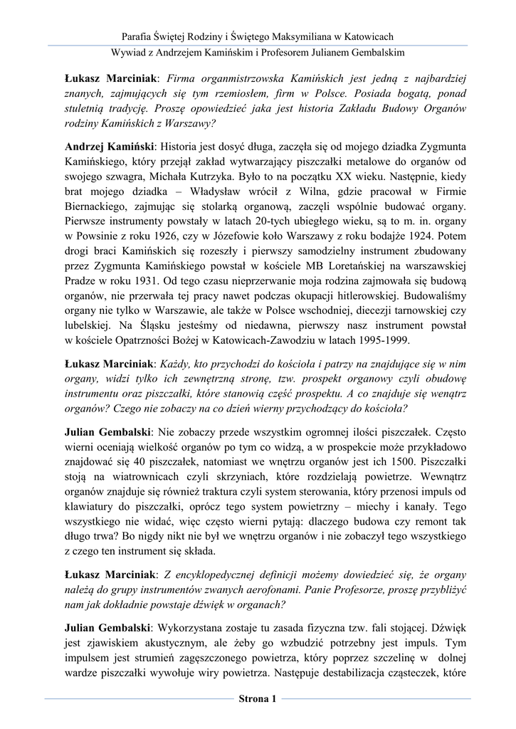 Parafia Świętej Rodziny i Świętego Maksymiliana w Katowicach Wywiad z Andrzejem Kamińskim i Profesorem Julianem Gembalskim Łukasz Marciniak: Firma organmistrzowska Kamińskich jest jedną z najbardziej znanych, zajmujących się tym rzemiosłem, firm w Polsce. Posiada bogatą, ponad stuletnią tradycję. Proszę opowiedzieć jaka jest historia Zakładu Budowy Organów rodziny Kamińskich z Warszawy? Andrzej Kamiński: Historia jest dosyć długa, zaczęła się od mojego dziadka Zygmunta Kamińskiego, który przejął zakład wytwarzający piszczałki metalowe do organów od swojego szwagra, Michała Kutrzyka. Było to na początku XX wieku. Następnie, kiedy brat mojego dziadka – Władysław wrócił z Wilna, gdzie pracował w Firmie Biernackiego, zajmując się stolarką organową, zaczęli wspólnie budować organy. Pierwsze instrumenty powstały w latach 20-tych ubiegłego wieku, są to m. in. organy w Powsinie z roku 1926, czy w Józefowie koło Warszawy z roku bodajże 1924. Potem drogi braci Kamińskich się rozeszły i pierwszy samodzielny instrument zbudowany przez Zygmunta Kamińskiego powstał w kościele MB Loretańskiej na warszawskiej Pradze w roku 1931. Od tego czasu nieprzerwanie moja rodzina zajmowała się budową organów, nie przerwała tej pracy nawet podczas okupacji hitlerowskiej. Budowaliśmy organy nie tylko w Warszawie, ale także w Polsce wschodniej, diecezji tarnowskiej czy lubelskiej. Na Śląsku jesteśmy od niedawna, pierwszy nasz instrument powstał w kościele Opatrzności Bożej w Katowicach-Zawodziu w latach 1995-1999. Łukasz Marciniak: Każdy, kto przychodzi do kościoła i patrzy na znajdujące się w nim organy, widzi tylko ich zewnętrzną stronę, tzw. prospekt organowy czyli obudowę instrumentu oraz piszczałki, które stanowią część prospektu. A co znajduje się wenątrz organów? Czego nie zobaczy na co dzień wierny przychodzący do kościoła? Julian Gembalski: Nie zobaczy przede wszystkim ogromnej ilości piszczałek. Często wierni oceniają wielkość organów po tym co widzą, a w prospekcie może przykładowo znajdować się 40 piszczałek, natomiast we wnętrzu organów jest ich 1500. Piszczałki stoją na wiatrownicach czyli skrzyniach, które rozdzielają powietrze. Wewnątrz organów znajduje się również traktura czyli system sterowania, który przenosi impuls od klawiatury do piszczałki, oprócz tego system powietrzny – miechy i kanały. Tego wszystkiego nie widać, więc często wierni pytają: dlaczego budowa czy remont tak długo trwa? Bo nigdy nikt nie był we wnętrzu organów i nie zobaczył tego wszystkiego z czego ten instrument się składa. Łukasz Marciniak: Z encyklopedycznej definicji możemy dowiedzieć się, że organy należą do grupy instrumentów zwanych aerofonami. Panie Profesorze, proszę przybliżyć nam jak dokładnie powstaje dźwięk w organach? Julian Gembalski: Wykorzystana zostaje tu zasada fizyczna tzw. fali stojącej. Dźwięk jest zjawiskiem akustycznym, ale żeby go wzbudzić potrzebny jest impuls. Tym impulsem jest strumień zagęszczonego powietrza, który poprzez szczelinę w dolnej wardze piszczałki wywołuje wiry powietrza. Następuje destabilizacja cząsteczek, które Strona 1 Parafia Świętej Rodziny i Świętego Maksymiliana w Katowicach Wywiad z Andrzejem Kamińskim i Profesorem Julianem Gembalskim są w stanie spoczynku, a ten wir powoduje, że pobudzone zostają do drgań i układają się w falę stojącą. Tak długo jak trwa impuls, czyli jak długo dochodzi powietrze do piszczałki, tak długo fala drga i przekłada się na zjawisko akustyczne, zwane subiektywnie dźwiękiem. Obiektywnie jest to uporządkowany ruch cząsteczek, który powoduje drgania powietrza, stając się źródłem dźwięku. Tak powstaje dźwięk w piszczałkach wargowych. W piszczałkach języczkowych mamy do czynienia z wibratorem mechanicznym tzw. idiofonem (języczkiem), który również pobudzany jest do drgań strumieniem powietrza, wpadającym przez otwór w nodze piszczałki. Źródłem dźwięku są więc drgania języczka (wykonanego zwykle z mosiądzu), zaś sama tuba, znajdująca sie powyżej języczka, potrzebna jest do jego wzmocnienia. Łukasz Marciniak: Nie sposób zliczyć wszystkie zbudowane przez zakład rodziny Kamińskich na przestrzeni lat instrumenty. Na Śląsku do najbardziej znanych należą z pewnością organy kościoła Opatrzności Bożej w Katowicach-Zawodziu, zbudowane w estetyce baroku francuskiego oraz organy naszego kościoła, którym nadano zgoła odmienne cechy – organów północoniemieckich. Proszę powiedzieć co to oznacza w praktyce, że organy zbudowane są w stylu północnoniemieckim? Julian Gembalski: Styl północnoniemiecki to przede wszystkim dyspozycja, czyli zestaw głosów, który nawiązuje do pewnego stylu historycznego, w tym przypadku do okresu baroku na północy Niemiec. Analiza ówczesnego stylu pozwala nam zdefiniować budowane w tamtym okresie organy pod względem estetyki brzmienia i konstrukcji. Miały one najczęściej trzy zespoły brzmieniowe z Rückpositivem, czyli zespołem umieszczonym w balustradzie chóru. Zespół ten obsługiwany był przez manuał pierwszy. Następnie Hauptwerk czyli główny, potężny zespół brzmieniowy i Brustwerk, który tutaj jest nieco zmodyfikowany. Ze względu na konstrukcję kościoła, umieszczony on został za Hauptwerkiem. W organach północnoniemieckich Brustwerk znajdował się pod głównym zespołem brzmieniowym. W kościele Świętej Rodziny zrealizowano także inny ważny składnik stylu północnoniemieckiego: wieże pedałowe, umieszczone w balustradzie chóru. Jest to typowe rozwiązanie architektoniczne dla organów północnoniemieckich. Zespół brzmieniowy pedału nie jest umieszczony w głębi organów, ale z przodu, a jego wieże flankują główny korpus organów. W organach zastosowano także wiele innych historyzujących rozwiązań: tzw. trakturę zawieszoną, połąc