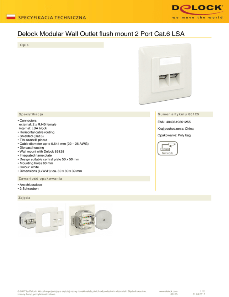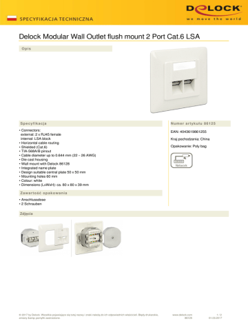Delock Modular Wall Outlet flush mount 2 Port Cat.6 LSA Opis Specyfikacja • Connectors: external: 2 x RJ45 female internal: LSA block • Horizontal cable routing • Shielded (Cat.6) • TIA-568A/B pinout • Cable diameter up to 0.644 mm (22 – 26 AWG) • Die cast housing • Wall mount with Delock 86128 • Integrated name plate • Design suitable central plate 50 x 50 mm • Mounting holes 60 mm • Colour: white • Dimensions (LxWxH): ca. 80 x 80 x 39 mm Numer artykułu 86125 EAN: 4043619861255 Kraj pochodzenia: China Opakowanie: Poly bag Zawartość opakowania • Anschlussdose • 2 Schrauben Zdjęcia © 2017 by Delock. Wszelkie pojawiające się tutaj nazwy i znaki należą do ich odpowiednich właścicieli. Błędy drukarskie, zmiany & pomyłki zastrzeżone. www.delock.com 86125 1/2 01.03.2017 General Suitable for conductor gauge: 22 - 26 AWG Mounting type: in-wall Interface Zewnętrzne: 2 x RJ45 Jack Wewnętrzne: 2 x blok zacisków LSA Technical characteristics Category: Cat.6 Shielding: shielded Physical characteristics Housing colour: white Length: 80 mm Width: 80 mm Height: 39.1 mm © 2017 by Delock. Wszelkie pojawiające się tutaj nazwy i znaki należą do ich odpowiednich właścicieli. Błędy drukarskie, zmiany & pomyłki zastrzeżone. Powered by TCPDF (www.tcpdf.org) www.delock.com 86125 2/2 01.03.2017