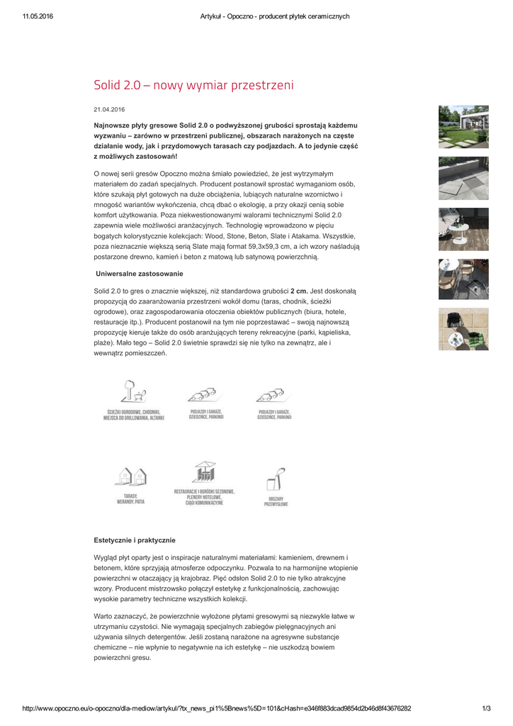 11.05.2016 Artykuł Opoczno producent płytek ceramicznych Solid 2.0 – nowy wymiar przestrzeni 21.04.2016 Najnowsze płyty gresowe Solid 2.0 o podwyższonej grubości sprostają każdemu wyzwaniu – zarówno w przestrzeni publicznej, obszarach narażonych na częste działanie wody, jak i przydomowych tarasach czy podjazdach. A to jedynie część z możliwych zastosowań! O nowej serii gresów Opoczno można śmiało powiedzieć, że jest wytrzymałym materiałem do zadań specjalnych. Producent postanowił sprostać wymaganiom osób, które szukają płyt gotowych na duże obciążenia, lubiących naturalne wzornictwo i mnogość wariantów wykończenia, chcą dbać o ekologię, a przy okazji cenią sobie komfort użytkowania. Poza niekwestionowanymi walorami technicznymi Solid 2.0 zapewnia wiele możliwości aranżacyjnych. Technologię wprowadzono w pięciu bogatych kolorystycznie kolekcjach: Wood, Stone, Beton, Slate i Atakama. Wszystkie, poza nieznacznie większą serią Slate mają format 59,3x59,3 cm, a ich wzory naśladują postarzone drewno, kamień i beton z matową lub satynową powierzchnią. Uniwersalne zastosowanie Solid 2.0 to gres o znacznie większej, niż standardowa grubości 2 cm. Jest doskonałą propozycją do zaaranżowania przestrzeni wokół domu (taras, chodnik, ścieżki ogrodowe), oraz zagospodarowania otoczenia obiektów publicznych (biura, hotele, restauracje itp.). Producent postanowił na tym nie poprzestawać – swoją najnowszą propozycję kieruje także do osób aranżujących tereny rekreacyjne (parki, kąpieliska, plaże). Mało tego – Solid 2.0 świetnie sprawdzi się nie tylko na zewnątrz, ale i wewnątrz pomieszczeń. Estetycznie i praktycznie Wygląd płyt oparty jest o inspiracje naturalnymi materiałami: kamieniem, drewnem i betonem, które sprzyjają atmosferze odpoczynku. Pozwala to na harmonijne wtopienie powierzchni w otaczający ją krajobraz. Pięć odsłon Solid 2.0 to nie tylko atrakcyjne wzory. Producent mistrzowsko połączył estetykę z funkcjonalnością, zachowując wysokie parametry techniczne wszystkich kolekcji. Warto zaznaczyć, że powierzchnie wyłożone płytami gresowymi są niezwykle łatwe w utrzymaniu czystości. Nie wymagają specjalnych zabiegów pielęgnacyjnych ani używania silnych detergentów. Jeśli zostaną narażone na agresywne substancje chemiczne – nie wpłynie to negatywnie na ich estetykę – nie uszkodzą bowiem powierzchni gresu. http://www.opoczno.eu/oopoczno/dlamediow/artykul/?tx_news_pi1%5Bnews%5D=101&cHash=e346f883dcad9854d2b46d8f43676282 1/3 11.05.2016 Artykuł Opoczno producent płytek ceramicznych Prosty montaż Solid 2.0 wyróżnia się możliwością układania bez zaprawy klejowej (tzw. „suchy montaż”), bezpośrednio na gruncie (np. na trawie, żwirku lub piasku). Suchy montaż na tarasach zapobiega odparzaniu się płytek, a co za tym idzie niweluje różnicę kosztów pomiędzy zwykłymi, a pogrubionymi płytkami. Możliwe jest także układanie płyt na wspornikach, które umożliwiają zmiany aranżacji podłogi w sposób bezkosztowy. Oczywiście poza licznymi udogodnieniami montażowymi, tradycyjny sposób instalacji na zaprawę klejową jest również możliwy. Recepta na sezonowość – wielokrotne użycie Właściciele sezonowych ogródków nie muszą już szukać skomplikowanych rozwiązań w związku z demontażem swoich plenerowych przestrzeni. W kolejnych sezonach ogrodowych wystarczy zaaranżować miejsce w zupełnie nowy sposób, zmieniając całkowicie ułożenie płyt gresowych. Na basen i plażę Solid 2.0 cechuje się podwyższoną odpornością antypoślizgową, którą określa zarówno parametr R (wyznaczany dla przemieszczania się w obuwiu), jak i parametr tak zwanej „bosej stopy”. Oznacza to, że płyty gresowe nie narażą nas na poślizgnięcie podczas deszczu, kiedy chodzimy po nich w butach, jak i latem podczas kąpieli na basenie. Istotna jest tu także odporność na sól i chlor, a nawet na wodę morską. Nowy produkt doskonale sprawdzi się do układania ścieżek na plażach. Nawet w miejscach silnie nasłonecznionych zachowuje swoją pierwotną barwę. Ponadprzeciętna wytrzymałość Gresy Solid 2.0 dzięki niskiej nasiąkliwości wodnej są gotowe na skrajnie niskie temperatury i zmiany pogody. Przez wiele lat, bez względu na wpływ zimy i lata, będą cieszyć oko nienagannym wyglądem. Co więcej, najnowsza propozycja Opoczno charakteryzuje się odpornością na bardzo duże obciążenia. Pojedyncza płyta wytrzymuje ciężar ponad jednej tony! Ma to niebagatelne znaczenie przy aranżacji różnego rodzaju podjazdów, garaży i parkingów. Unikalne właściwości gresów Solid 2.0 sprawiają, że są idealnym rozwiązaniem zarówno w przypadku miejsc publicznych, jak http://www.opoczno.eu/oopoczno/dlamediow/artykul/?tx_news_pi1%5Bnews%5D=101&cHash=e346f883dcad9854d2b46d8f43676282 2/3 11.05.2016 Artykuł Opoczno producent płytek ceramicznych i otoczenia budynków mieszkalnych. Sprawdź, którą kolekcję wybierzesz dla siebie: WOOD 2.0 zainspirowane drewnem, które zawsze świetnie wkomponuje się w naturalne otoczenie. Jasne kolory (biel i beż) będą dobrze współgrać z elewacją budynku, a ciemny brąz i grafit podkreślą synergię z naturą. STONE 2.0, której surowy wygląd możesz ocieplić wybraną barwą ciepłego beżu lub brązu. Możesz także pozostać w chłodnej tonacji jasnej lub ciemnej szarości. SLATE 2.0 kolekcja ta oferowana jest także w wersji standardowej grubości 1 cm. Dzięki temu mamy możliwość układania posadzki z tego samego wzoru wewnątrz i na zewnątrz pomieszczenia, uzyskując efekt jednolitej powierzchni. BETON 2.0 kolekcja inspirowana betonem to najczęstszy trend wykorzystywany przez architektów i projektantów. Będzie zawsze dobrze wyglądać w naturalnym otoczeniu, bez względu na wybrany kolor ciepła biel o beżowym wykończeniu, jasna oraz ciemna szarość. Płytki te oferowane są ta