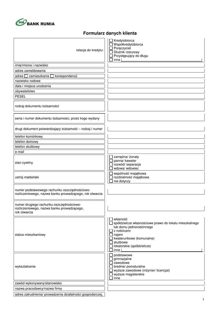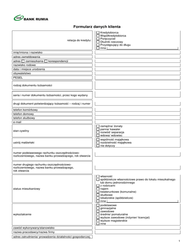 Formularz danych klienta - Bank Rumia Spółdzielczy