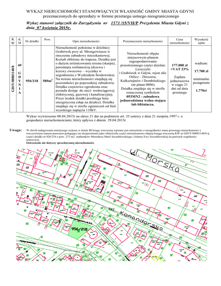 WYKAZ NIERUCHOMOŚCI STANOWIĄCYCH WŁASNOŚĆ GMINY MIASTA GDYNI przeznaczonych do sprzedaży w formie przetargu ustnego nieograniczonego Wykaz stanowi załącznik do Zarządzenia nr 1573 /15/VII/P Prezydenta Miasta Gdyni z dnia 07 kwietnia 2015r. GD1Y/00001140/8 K K W M Nr działki Pow. 49 G D Y N I A 956/218 589m2 Opis nieruchomości Przeznaczenie nieruchomości Nieruchomość położona w dzielnicy Grabówek przy ul. Mrongowiusza w Nieruchomość objęta otoczeniu zabudowy mieszkaniowej. miejscowym planem Kształt zbliżony do trapezu. Działka jest zagospodarowania o dużym zróżnicowaniu terenu (skarpa), przestrzennego części dzielnic porośnięta roślinnością (drzewa i Leszczyki krzewy owocowe – wycinka w i Grabówek w Gdyni, rejon ulic uzgodnieniu z Wydziałem Środowiska). Orlicz – Dreszera, Na terenie nieruchomości znajdują się Kalksztajnów i Dembińskiego pozostałości po poprzedniej zabudowie. (nr planu 0806). Działka częściowo ogrodzona oraz Działka znajduje się w strefie posiada dostęp do sieci: wodociągowej oznaczonej symbolem elektrycznej, gazowej i kanalizacyjnej. 053MN2 - zabudowa Przez środek działki przebiega linia jednorodzinna wolno stojąca energetyczna (słup na działce). Działka lub bliźniacza. znajduje się w strefie ograniczeń od linii wysokiego napięcia 110kV. Cena nieruchomości 177.000 zł +VAT 23% Zapłata jednorazowa w ciągu 21 dni od dnia przetargu Wysokość opłat wadium: 17.700 zł minimalne postąpienie 1.770zł Wykaz wywieszono 08.04.2015r na okres 21 dni na podstawie art. 35 ustawy z dnia 21 sierpnia 1997 r. o gospodarce nieruchomościami, który upływa z dniem 29.04.2015r. Uwaga: W chwili redagowania niniejszego wykazu w dziale III księgi wieczystej wpisane jest ostrzeżenie o niezgodności stanu prawnego nieruchomości z rzeczywistym stanem prawnym polegające na nieujawnieniu jako właściciela części nieruchomości objętej księgą wieczystą KW nr GD1Y/00001140/8 tj. części działki nr 928/218 o pow. 273 m2 małżonków Mirosława Marii Szczeblewskiego i Jolanty Ewy Szczeblewskiej na prawach wspólności ustawowej. Ostrzeżenie nie dotyczy sprzedawanej nieruchomości.