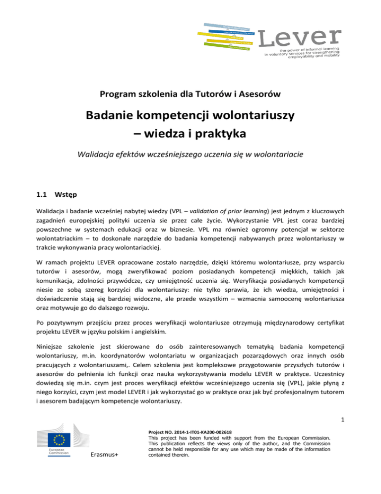 Program szkolenia dla Tutorów i Asesorów Badanie kompetencji wolontariuszy – wiedza i praktyka Walidacja efektów wcześniejszego uczenia się w wolontariacie 1.1 Wstęp Walidacja i badanie wcześniej nabytej wiedzy (VPL – validation of prior learning) jest jednym z kluczowych zagadnień europejskiej polityki uczenia sie przez całe życie. Wykorzystanie VPL jest coraz bardziej powszechne w systemach edukacji oraz w biznesie. VPL ma również ogromny potencjał w sektorze wolontatriackim – to doskonałe narzędzie do badania kompetencji nabywanych przez wolontariuszy w trakcie wykonywania pracy wolontariackiej. W ramach projektu LEVER opracowane zostało narzędzie, dzięki któremu wolontariusze, przy wsparciu tutorów i asesorów, mogą zweryfikować poziom posiadanych kompetencji miękkich, takich jak komunikacja, zdolności przywódcze, czy umiejętność uczenia się. Weryfikacja posiadanych kompetencji niesie ze sobą szereg korzyści dla wolontariuszy: nie tylko sprawia, że ich wiedza, umiejętności i doświadczenie stają się bardziej widoczne, ale przede wszystkim – wzmacnia samoocenę wolontariusza oraz motywuje go do dalszego rozwoju. Po pozytywnym przejściu przez proces weryfikacji wolontariusze otrzymują międzynarodowy certyfikat projektu LEVER w języku polskim i angielskim. Niniejsze szkolenie jest skierowane do osób zainteresowanych tematyką badania kompetencji wolontariuszy, m.in. koordynatorów wolontariatu w organizacjach pozarządowych oraz innych osób pracujących z wolontariuszami,. Celem szkolenia jest kompleksowe przygotowanie przyszłych tutorów i asesorów do pełnienia ich funkcji oraz nauka wykorzystywania modelu LEVER w praktyce. Uczestnicy dowiedzą się m.in. czym jest proces weryfikacji efektów wcześniejszego uczenia się (VPL), jakie płyną z niego korzyści, czym jest model LEVER i jak wykorzystać go w praktyce oraz jak być profesjonalnym tutorem i asesorem badającym kompetencje wolontariuszy. 1 Erasmus+ Project NO. 2014-1-IT01-KA200-002618 This project has been funded with support from the European Commission. This publication reflects the views only of the author, and the Commission cannot be held responsible for any use which may be made of the information contained therein. 1.2 Cel szkolenia Uczestnicy szkolenia poprzez połączenie swoich doświadczeń, wiedzy i ćwiczeń praktycznych nabędą umiejętności niezbędne do pełnienia roli tutorów – osób wspierających wolontariuszy w procesie weryfikowania ich kompetencji oraz asesorów – osób, które przeglądają materiał zgromadzony przez wolontariuszy i na jego podstawie oceniają poziom posiadanych przez wolontariusza kompetencji. Uczestnicy dowiedzą się m.in.: 1. Jak wykorzystać model weryfikowania wcześniej zdobytej wiedzy w sektorze wolontariackim. 2. W jaki sposób korzystać z narzędzi do zbierania, dokumentowania i oceny kompetencji, wypracowanych w ramach projektu LEVER. 3. W jaki sposób stać sie profesjonalnym tutorem i asesorem dla wolontariuszy. 1.3 Uczestnicy uzyskają: Wiedzę z zakresu walidacji wcześniej zdobytej wiedzy jako drogi do rozwijania umiejętności w sektorze wolontariackim. o VPL jako część narodowej i międzynarodowej strategii uczenia sie przez całe życie. o Narodowe, regionalne i lokalne strategie walidacji efektów wcześniejszego uczenia się. o Etapy modelu VPL oraz narzędzia do identyfikowania, dokumentowania, oceny i walidacji efektów wcześniejszego uczenia się. o Proces VPL z perspektywy wolontariusza. o Zapewnienie wysokiej jakości procesu. Wiedzę z zakresu korzyści, potencjalnych problemów oraz wyzwań wiążących się z wykorzystaniem VPL w sektorze wolontariackim. Umiejętności z zakresu prowadzenia oceny oraz wykorzystania różnorodnych narzędzi i metod dla identyfikowania, dokumentowania i walidacji efektów wcześniejszego uczenia się. Umiejętności z zakresu zapewniania wysokiej jakości procesu VPL w sektorze wolontariackim. Umiejętności z zakresu podejmowania współpracy między sektorem wolontariackim, instytucjami edukacyjnymi oraz biznesem. Umiejętności z zakresu rozwijania swojego warsztatu praktycznego. 1.4 Do kogo skierowane jest szkolenie? Szkolenie jest skierowane do osób pracujących z wolontariuszami, które są zainteresowane tematyką weryfikowania kompetencji wolontariuszy i chciałyby pełnić rolę certyfikowanych tutorów i asesorów, np. koordynatorów wolontariatu w organizacjach pozarządowych, koordynatorów wolontariatu 2 Erasmus+ Project NO. 2014-1-IT01-KA200-002618 This project has been funded with support from the European Commission. This publication reflects the views only of the author, and the Commission cannot be held responsible for any use which may be made of the information contained therein. pracowniczego, pracowników instytucji edukacyjnych, pracowników działów HR, doradców zawodowych, etc. 1.5 Moduły szkoleniowe i treści Szkolenie podzielone jest na 5 modułów tematycznych. Program obejmuje szkolenie stacjonarne i szkolenie online w formie e-learningu. Moduł 1 Wstęp do tematyki weryfikacji wcześniej zdobytej wiedzy w sektorze wolontariackim. Moduł 2 Etapy procesu VPL oraz Model LEVER: zadania i role dla koordynatorów wolontariatu i praktyków VPL. Moduł 3 Tutorzy Modelu LEVER – przewodnicy wolontariuszy i doradcy zajmujący się kompetencjami miękkimi. Moduł 4 Asesorzy – oceniający w Modelu LEVER. Moduł 5 Sposoby zapewniania wysokiej jakości procesu VPL. 3 Erasmus+ Project NO. 2014-1-IT01-KA200-002618 This project has been funded with support from the European Commission. This publication reflects the views only of the author, and the Commission cannot be held responsible for any use which may be made of the information contained therein. Moduł 1 Wstęp do tematyki weryfikacji efektów wcześniejszego uczenia się w sektorze wolontariackim. Cel szkolenia Po ukończeniu tego modułu, uczestnik zdobędzie: Wiedzę z zakresu: - w