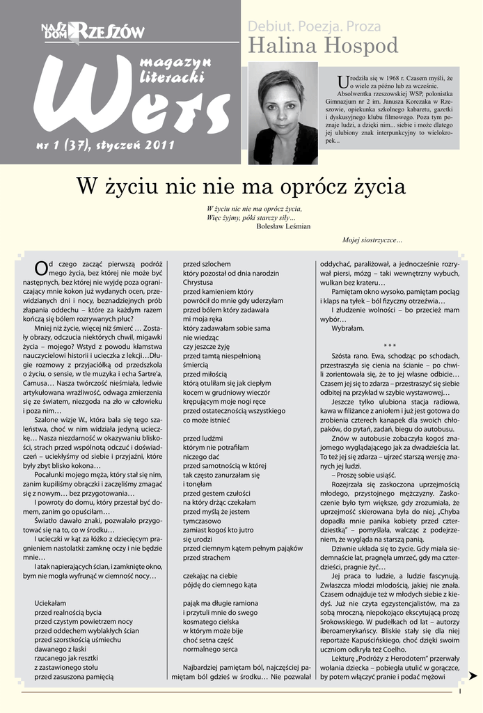 Debiut. Poezja. Proza magazyn literacki Wers Halina Hospod nr 1 (37), styczeń 2011 U rodziła się w 1968 r. Czasem myśli, że o wiele za późno lub za wcześnie. Absolwentka rzeszowskiej WSP, polonistka Gimnazjum nr 2 im. Janusza Korczaka w Rzeszowie, opiekunka szkolnego kabaretu, gazetki i dyskusyjnego klubu filmowego. Poza tym poznaje ludzi, a dzięki nim... siebie i może dlatego jej ulubiony znak interpunkcyjny to wielokropek... W życiu nic nie ma oprócz życia W życiu nic nie ma oprócz życia, Więc żyjmy, póki starczy siły… Bolesław Leśmian O d czego zacząć pierwszą podróż mego życia, bez której nie może być następnych, bez której nie wyjdę poza ograniczający mnie kokon już wydanych ocen, przewidzianych dni i nocy, beznadziejnych prób złapania oddechu – które za każdym razem kończą się bólem rozrywanych płuc? Mniej niż życie, więcej niż śmierć … Zostały obrazy, odczucia niektórych chwil, migawki życia – mojego? Wstyd z powodu kłamstwa nauczycielowi historii i ucieczka z lekcji…Długie rozmowy z przyjaciółką od przedszkola o życiu, o sensie, w tle muzyka i echa Sartre’a, Camusa… Nasza twórczość nieśmiała, ledwie artykułowana wrażliwość, odwaga zmierzenia się ze światem, niezgoda na zło w człowieku i poza nim… Szalone wizje W., która bała się tego szaleństwa, choć w nim widziała jedyną ucieczkę… Nasza niezdarność w okazywaniu bliskości, strach przed wspólnotą odczuć i doświadczeń – uciekłyśmy od siebie i przyjaźni, które były zbyt blisko kokona… Pocałunki mojego męża, który stał się nim, zanim kupiliśmy obrączki i zaczęliśmy zmagać się z nowym… bez przygotowania… I powroty do domu, który przestał być domem, zanim go opuściłam… Światło dawało znaki, pozwalało przygotować się na to, co w środku… I ucieczki w kąt za łóżko z dziecięcym pragnieniem nastolatki: zamknę oczy i nie będzie mnie… I atak napierających ścian, i zamknięte okno, bym nie mogła wyfrunąć w ciemność nocy… Uciekałam przed realnością bycia przed czystym powietrzem nocy przed oddechem wyblakłych ścian przed szorstkością uśmiechu dawanego z łaski rzucanego jak resztki z zastawionego stołu przed zasuszona pamięcią przed szlochem który pozostał od dnia narodzin Chrystusa przed kamieniem który powrócił do mnie gdy uderzyłam przed bólem który zadawała mi moja ręka który zadawałam sobie sama nie wiedząc czy jeszcze żyję przed tamtą niespełnioną śmiercią przed miłością którą otuliłam się jak ciepłym kocem w grudniowy wieczór krępującym moje nogi ręce przed ostatecznością wszystkiego co może istnieć przed ludźmi którym nie potrafiłam niczego dać przed samotnością w której tak często zanurzałam się i tonęłam przed gestem czułości na który drżąc czekałam przed myślą że jestem tymczasowo zamiast kogoś kto jutro się urodzi przed ciemnym kątem pełnym pająków przed strachem czekając na ciebie pójdę do ciemnego kąta pająk ma długie ramiona i przytuli mnie do swego kosmatego cielska w którym może bije choć setna część normalnego serca Najbardziej pamiętam ból, najczęściej pamiętam ból gdzieś w środku… Nie pozwalał Mojej siostrzyczce… oddychać, paraliżował, a jednocześnie rozrywał piersi, mózg – taki wewnętrzny wybuch, wulkan bez krateru… Pamiętam okno wysoko, pamiętam pociąg i klaps na tyłek – ból fizyczny otrzeźwia… I złudzenie wolności – bo przecież mam wybór… Wybrałam. *** Szósta rano. Ewa, schodząc po schodach, przestraszyła się cienia na ścianie – po chwili zorientowała się, że to jej własne odbicie… Czasem jej się to zdarza – przestraszyć się siebie odbitej na przykład w szybie wystawowej… Jeszcze tylko ulubiona stacja radiowa, kawa w filiżance z aniołem i już jest gotowa do zrobienia czterech kanapek dla swoich chłopaków, do pytań, zadań, biegu do autobusu. Znów w autobusie zobaczyła kogoś znajomego wyglądającego jak za dwadzieścia lat. To też jej się zdarza – ujrzeć starszą wersję znanych jej ludzi. – Proszę sobie usiąść. Rozejrzała się zaskoczona uprzejmością młodego, przystojnego mężczyzny. Zaskoczenie było tym większe, gdy zrozumiała, że uprzejmość skierowana była do niej. „Chyba dopadła mnie panika kobiety przed czterdziestką” – pomyślała, walcząc z podejrzeniem, że wygląda na starszą panią. Dziwnie układa się to życie. Gdy miała siedemnaście lat, pragnęła umrzeć, gdy ma czterdzieści, pragnie żyć… Jej praca to ludzie, a ludzie fascynują. Zwłaszcza młodzi młodością, jakiej nie znała. Czasem odnajduje też w młodych siebie z kiedyś. Już nie czyta egzystencjalistów, ma za sobą mroczną, niepokojąco ekscytującą prozę Srokowskiego. W pudełkach od lat – autorzy iberoamerykańscy. Bliskie stały się dla niej reportaże Kapuścińskiego, choć dzięki swoim uczniom odkryła też Coelho. Lekturę „Podróży z Herodotem” przerwały wołania dziecka – pobiegła utulić w gorączce, by potem włączyć pranie i podać mężowi I WERS nr 37, styczeń 2011 młotek, klucz, wiertarkę itp. Nie znosiła tej „prawdziwej” roboty, a nazwy narzędzi mylą jej się ciągle, mimo „starannie odrabianych lekcji pomocnika”. Skoro zrobiłaś dzisiaj wszystko co miałaś zrobić w tym tygodniu I patrz – masz ręce popękane ponadplanowo i nadmiernie Czemu wciąż krzątasz się bez przerwy biegasz bez celu z kąta w kąt Przeganiasz tylko tego pająka co od miesiąca buduje sieć Rozmyślam nad mego istnienia sensem i go nie widzę Dla moich myśli by je wyrzucić ponad deszcz kurzu nad podłogą tydzień za krótki A kiedy mocą woli sprawiam że sny me stają się realne Nagle dostrzegam – to nie sny to bańki mydlane znad balii z praniem Nie mogli wybrać się w podróż życia, choć to może życie jest najprawdziwszą podróżą. Podróżą 