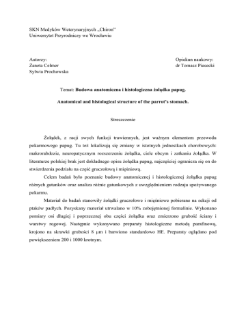 SKN Medyków Weterynaryjnych „Chiron” Uniwersytet Przyrodniczy we Wrocławiu Autorzy: Żaneta Celmer Sylwia Prochowska Opiekun naukowy: dr Tomasz Piasecki Temat: Budowa anatomiczna i histologiczna żołądka papug. Anatomical and histological structure of the parrot’s stomach. Streszczenie Żołądek, z racji swych funkcji trawiennych, jest ważnym elementem przewodu pokarmowego papug. Tu też lokalizują się zmiany w istotnych jednostkach chorobowych: makrorabdozie, neuropatycznym rozszerzeniu żołądka, ciele obcym i zatkaniu żołądka. W literaturze polskiej brak jest dokładnego opisu żołądka papug, najczęściej ogranicza się on do stwierdzenia podziału na część gruczołową i mięśniową. Celem badań było poznanie budowy anatomicznej i histologicznej żołądka papug różnych gatunków oraz analiza różnic gatunkowych z uwzględnieniem rodzaju spożywanego pokarmu. Materiał do badań stanowiły żołądki gruczołowe i mięśniowe pobierane na sekcji od ptaków padłych. Pozyskany materiał utrwalano w 10% zobojętnionej formalinie. Wykonano pomiary osi długiej i poprzecznej obu części żołądka oraz zmierzono grubość ściany i warstwy rogowej. Następnie wykonywano preparaty histologiczne metodą parafinową, krojono na skrawki grubości 8 µm i barwiono standardowo HE. Preparaty oglądano pod powiększeniem 200 i 1000 krotnym.