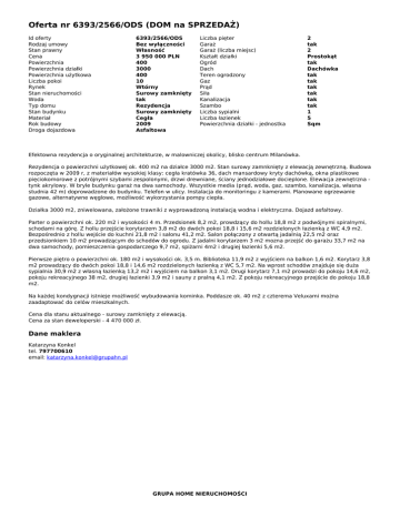Oferta nr 6393/2566/ODS (DOM na SPRZEDAŻ) Id oferty Rodzaj umowy Stan prawny Cena Powierzchnia Powierzchnia działki Powierzchnia użytkowa Liczba pokoi Rynek Stan nieruchomości Woda Typ domu Stan budynku Materiał Rok budowy Droga dojazdowa 6393/2566/ODS Bez wyłączności Własność 3 950 000 PLN 400 3000 400 10 Wtórny Surowy zamknięty tak Rezydencja Surowy zamknięty Cegła 2009 Asfaltowa Liczba pięter Garaż Garaż (liczba miejsc) Kształt działki Ogród Dach Teren ogrodzony Gaz Prąd Siła Kanalizacja Szambo Liczba sypialni Liczba łazienek Powierzchnia działki - jednostka 2 tak 2 Prostokąt tak Dachówka tak tak tak tak tak tak 1 5 Sqm Efektowna rezydencja o oryginalnej architekturze, w malowniczej okolicy, blisko centrum Milanówka. Rezydencja o powierzchni użytkowej ok. 400 m2 na działce 3000 m2. Stan surowy zamnknięty z elewacją zewnętrzną. Budowa rozpoczęta w 2009 r, z materiałów wysokiej klasy: cegła kratówka 36, dach mansardowy kryty dachówką, okna plastikowe pięciokomorowe z potrójnymi szybami zespolonymi, drzwi drewniane, ściany jednodziałowe docieplone. Elewacja zewnętrzna tynk akrylowy. W bryle budynku garaż na dwa samochody. Wszystkie media (prąd, woda, gaz, szambo, kanalizacja, własna studnia 42 m) doprowadzone do budynku. Telefon w ulicy. Instalacja do monitoringu z kamerami. Planowane ogrzewanie gazowe, alternatywne węglowe, możliwość wykorzystania pompy ciepła. Działka 3000 m2, zniwelowana, założone trawniki z wyprowadzoną instalacją wodna i elektryczna. Dojazd asfaltowy. Parter o powierzchni ok. 220 m2 i wysokości 4 m. Przedsionek 8,2 m2, prowdzący do hollu 18,8 m2 z podwójnymi spiralnymi, schodami na górę. Z hollu przejście korytarzem 3,8 m2 do dwóch pokoi 18,8 i 15,6 m2 rozdzielonych łazienką z WC 4,9 m2. Bezpośrednio z hollu wejście do kuchni 21,8 m2 i salonu 41,2 m2. Salon połączony z otwartą jadalnią 22,5 m2 oraz przedsionkiem 10 m2 prowadzącym do schodów do ogrodu. Z jadalni korytarzem 3 m2 mozna przejść do garażu 33,7 m2 na dwa samochody, pomieszczenia gospodarczego 9,7 m2, spiżarni 4m2 i drugiej łazienki 5,6 m2. Pierwsze piętro o powierzchni ok. 180 m2 i wysokości ok. 3,5 m. Biblioteka 11,9 m2 z wyjściem na balkon 1,6 m2. Korytarz 3,8 m2 prowadzący do dwóch pokoi 18,8 i 14,6 m2 rozdzielonych łazienką z WC 5,7 m2. Na wprost schodów znajduje się duża sypialnia 30,9 m2 z własną łazienką 13,2 m2 i wyjściem na balkon 3,1 m2. Drugi korytarz 7,1 m2 prowadzi do pokoju 14,6 m2, pokoju rekreacyjnego 38 m2, drugiej łazienki 3,9 m2 i sauny z pralną 4,1 m2. Z pokoju rekreacyjnego przejście do pokoju 18,8 m2. Na każdej kondygnacji istnieje możliwość wybudowania kominka. Poddasze ok. 40 m2 z czterema Veluxami można zaadaptować do celów mieszkalnych. Cena dla stanu aktualnego - surowy zamknięty z elewacją. Cena za stan deweloperski - 4 470 000 zł. Dane maklera Katarzyna Konkel tel. 797700610 email: [email protected] GRUPA HOME NIERUCHOMOŚCI Powered by TCPDF (www.tcpdf.org)