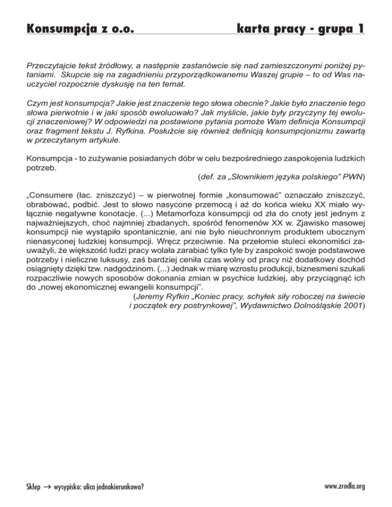 Konsumpcja z o.o. karta pracy - grupa 1 Przeczytajcie tekst źródłowy, a następnie zastanówcie się nad zamieszczonymi poniżej pytaniami. Skupcie się na zagadnieniu przyporządkowanemu Waszej grupie – to od Was nauczyciel rozpocznie dyskusję na ten temat. Czym jest konsumpcja? Jakie jest znaczenie tego słowa obecnie? Jakie było znaczenie tego słowa pierwotnie i w jaki sposób ewoluowało? Jak myślicie, jakie były przyczyny tej ewolucji znaczeniowej? W odpowiedzi na postawione pytania pomoże Wam definicja Konsumpcji oraz fragment tekstu J. Ryfkina. Posłużcie się również definicją konsumpcjonizmu zawartą w przeczytanym artykule. Konsumpcja - to zużywanie posiadanych dóbr w celu bezpośredniego zaspokojenia ludzkich potrzeb. (def. za „Słownikiem języka polskiego” PWN) „Consumere (łac. zniszczyć) – w pierwotnej formie „konsumować” oznaczało zniszczyć, obrabować, podbić. Jest to słowo nasycone przemocą i aż do końca wieku XX miało wyłącznie negatywne konotacje. (...) Metamorfoza konsumpcji od zła do cnoty jest jednym z najważniejszych, choć najmniej zbadanych, spośród fenomenów XX w. Zjawisko masowej konsumpcji nie wystąpiło spontanicznie, ani nie było nieuchronnym produktem ubocznym nienasyconej ludzkiej konsumpcji. Wręcz przeciwnie. Na przełomie stuleci ekonomiści zauważyli, że większość ludzi pracy wolała zarabiać tylko tyle by zaspokoić swoje podstawowe potrzeby i nieliczne luksusy, zaś bardziej ceniła czas wolny od pracy niż dodatkowy dochód osiągnięty dzięki tzw. nadgodzinom. (...) Jednak w miarę wzrostu produkcji, biznesmeni szukali rozpaczliwie nowych sposobów dokonania zmian w psychice ludzkiej, aby przyciągnąć ich do „nowej ekonomicznej ewangelii konsumpcji”. (Jeremy Ryfkin „Koniec pracy, schyłek siły roboczej na świecie i początek ery postrynkowej”, Wydawnictwo Dolnośląskie 2001) Sklep g wysypisko: ulica jednokierunkowa? www.zrodla.org Konsumpcja z o.o. karta pracy - grupa 3 Przeczytajcie tekst źródłowy, a następnie zastanówcie się nad zamieszczonymi poniżej pytaniami. Skonfrontujcie twierdzenie M. Novaka z artykułem B. Roka. Czy tezy zawarte w artykule i cytowanej niżej wypowiedzi się wykluczają, uzupełniają czy są ze sobą zbieżne? Jakie jest Wasze zdanie w tej materii? „W ostatnich dziesięcioleciach kapitalizm poważnie zredukował biedę na całym świecie. W Chinach i Indiach pół miliarda ludzi wydobyło się z biedy. To przecież jest zasługą kapitalizmu, a nie komunizmu czy jakiejś innej utopii lewicowej”- mówi Michael Novak. (M. BosackI „Teolog, którego raduje konsumpcjonizm”, http://www.gazetawyborcza.pl) (Michael Novak - teolog i filozof, dyrektor Studiów Społecznych i Politycznych w konserwatywnym American Enterprise Institute w Waszyngtonie. Ur. w 1933 r. w Pensylwanii w rodzinie imigrantów ze Słowacji. W latach 70. był doradcą Biura ds. Etycznych w Białym Domu. W latach 80. był ambasadorem USA przy Komisji Praw Człowieka ONZ.) Przed sformułowaniem odpowiedzi zapoznajcie się też z poniższym tekstem. „Wydawać by się mogło, że znaczne ograniczenie zbiorowej konsumpcji powinno przynieść same korzyści - ludziom i całej Ziemi. Kłopot w tym, że świata nie da się zmienić z dnia na dzień. Nawet, jeśli wszyscy zgodziliby się, że taka zmiana jest konieczna. Wyobraźmy sobie, że na skutek nagłego zbiorowego olśnienia zdecydowana większość obywateli państw wysoko i średnio rozwiniętych bierze sobie do serca apele i argumentacje ekologów. Dzięki owej cudownej zmianie społecznej świadomości globalna konsumpcja w tych państwach zostaje ograniczona - dajmy na to - o 30%. Panie w biurach nie piją trzech filiżanek kawy dziennie na osobę, tylko po jednej co drugi dzień, nie używając cukru ani śmietanki. Luksusowa bielizna, elektryczne szczoteczki do zębów, bibeloty, jedwabne krawaty, złote zegarki, jednorazowe ściereczki do kurzu - wszystko to leży na półkach sklepowych pośród mnóstwa innych dużych oraz małych towarów, których nikt nie kupuje. Bez tego przecież można żyć, a obywatele o podwyższonej świadomości ekologicznej bez żalu rezygnują z kupowania rzeczy zbędnych. W skali globalnej 30% towarów, które do tej pory znajdowały nabywców, już się nie sprzedaje. Taka sytuacja dla gospodarki oznacza poważny kryzys - rychłe bezrobocie, frustracje społeczne, drastycznie okrojony budżet. Gdyby to wszystko miało stać się nagle, chaos gospodarczy przysłoniłby korzyści związane z mniejszym obciążeniem środowiska naturalnego. To trochę naiwne rozumowanie przypomina tylko, że najbardziej słuszne i szlachetne hasła bywają utopijne. Nie zapominajmy jednak, że to właśnie utopie mogą wyznaczać kierunki zmian.” (Anna Gawlik „Czy można być zimną kroplą wody we wrzącym kotle?”, Magazyn Ekologiczny „Kropla”, nr 1/2003, http://kropla.eko.org.pl) Sklep g wysypisko: ulica jednokierunkowa? www.zrodla.org Konsumpcja z o.o. karta pracy - grupa 4 Przeczytajcie tekst źródłowy, a następnie zastanówcie się nad zamieszczonymi poniżej pytaniami. Jak interpretujcie zamieszczoną poniżej grafikę? Budzi ona w Was pozytywne czy negatywne skojarzenia? Czy uważacie, że ludzkość konsumuje ponad miarę? Jak konsumpcja wygląda w Waszym najbliższym otoczeniu, jaki model konsumpcji przejawiają znajomi, sąsiedzi, rodzina? Czy znacie jakieś proste sposoby, aby ograniczyć negatywny wpływ konsumpcji na środowisko naturalne? autor: Jarek Piotrowicz - grafika przygotowana na potrzeby kampanii „Kupuj odpowiedzialnie”, www.infonet.civ.pl Konsumpcja z o.o. karta pracy - grupa 2 Przeczytajcie tekst źródłowy, a następnie zastanówcie się nad zamieszczonymi poniżej pytaniami. Co miał na myśli Bolesław Rok tytułując swój artykuł „Konsumpcja Z O.graniczoną O.dpowiedzialnością”? Jak konsumpcja wpływa na środowisko naturalne? Jakie mogą być ekologic