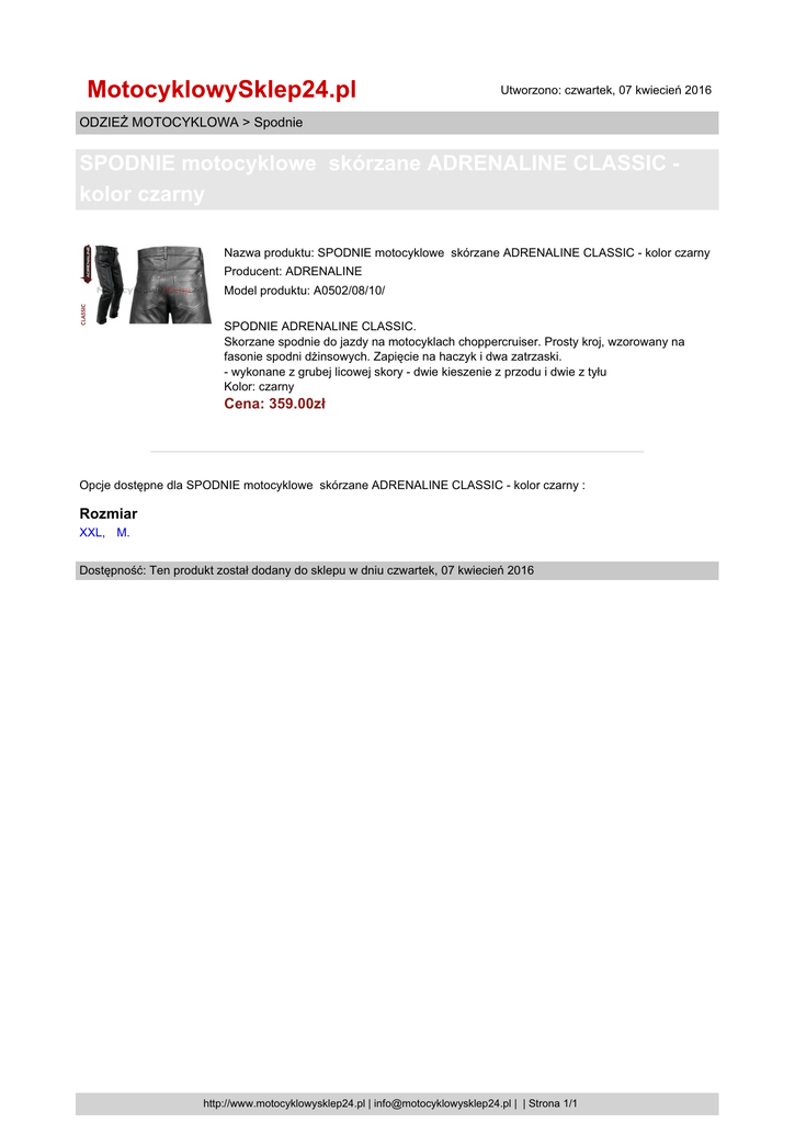 MotocyklowySklep24.pl Utworzono: czwartek, 07 kwiecień 2016 ODZIEŻ MOTOCYKLOWA > Spodnie SPODNIE motocyklowe skórzane ADRENALINE CLASSIC kolor czarny Nazwa produktu: SPODNIE motocyklowe skórzane ADRENALINE CLASSIC - kolor czarny Producent: ADRENALINE Model produktu: A0502/08/10/ SPODNIE ADRENALINE CLASSIC. Skorzane spodnie do jazdy na motocyklach choppercruiser. Prosty kroj, wzorowany na fasonie spodni dżinsowych. Zapięcie na haczyk i dwa zatrzaski. - wykonane z grubej licowej skory - dwie kieszenie z przodu i dwie z tyłu Kolor: czarny Cena: 359.00zł Opcje dostępne dla SPODNIE motocyklowe skórzane ADRENALINE CLASSIC - kolor czarny : Rozmiar XXL, M. Dostępność: Ten produkt został dodany do sklepu w dniu czwartek, 07 kwiecień 2016 http://www.motocyklowysklep24.pl | [email protected] | | Strona 1/1