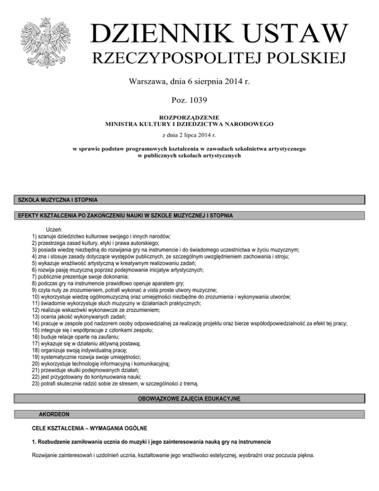 DZIENNIK USTAW RZECZYPOSPOLITEJ POLSKIEJ Warszawa, dnia 6 sierpnia 2014 r. Poz. 1039 ROZPORZĄDZENIE MINISTRA KULTURY I DZIEDZICTWA NARODOWEGO z dnia 2 lipca 2014 r. w sprawie podstaw programowych kształcenia w zawodach szkolnictwa artystycznego w publicznych szkołach artystycznych SZKOŁA MUZYCZNA I STOPNIA EFEKTY KSZTAŁCENIA PO ZAKOŃCZENIU NAUKI W SZKOLE MUZYCZNEJ I STOPNIA Uczeń: 1) szanuje dziedzictwo kulturowe swojego i innych narodów; 2) przestrzega zasad kultury, etyki i prawa autorskiego; 3) posiada wiedzę niezbędną do rozwijania gry na instrumencie i do świadomego uczestnictwa w życiu muzycznym; 4) zna i stosuje zasady dotyczące występów publicznych, ze szczególnym uwzględnieniem zachowania i stroju; 5) wykazuje wrażliwość artystyczną w kreatywnym realizowaniu zadań; 6) rozwija pasję muzyczną poprzez podejmowanie inicjatyw artystycznych; 7) publicznie prezentuje swoje dokonania; 8) podczas gry na instrumencie prawidłowo operuje aparatem gry; 9) czyta nuty ze zrozumieniem, potrafi wykonać a vista proste utwory muzyczne; 10) wykorzystuje wiedzę ogólnomuzyczną oraz umiejętności niezbędne do zrozumienia i wykonywania utworów; 11) świadomie wykorzystuje słuch muzyczny w działaniach praktycznych; 12) realizuje wskazówki wykonawcze ze zrozumieniem; 13) ocenia jakość wykonywanych zadań; 14) pracuje w zespole pod nadzorem osoby odpowiedzialnej za realizację projektu oraz bierze współodpowiedzialność za efekt tej pracy; 15) integruje się i współpracuje z członkami zespołu; 16) buduje relacje oparte na zaufaniu; 17) wykazuje się w działaniu aktywną postawą; 18) organizuje swoją indywidualną pracę; 19) systematycznie rozwija swoje umiejętności; 20) wykorzystuje technologię informacyjną i komunikacyjną; 21) przewiduje skutki podejmowanych działań; 22) jest przygotowany do kontynuowania nauki; 23) potrafi skutecznie radzić sobie ze stresem, w szczególności z tremą. OBOWIĄZKOWE ZAJĘCIA EDUKACYJNE AKORDEON CELE KSZTAŁCENIA – WYMAGANIA OGÓLNE 1. Rozbudzenie zamiłowania ucznia do muzyki i jego zainteresowania nauką gry na instrumencie Rozwijanie zainteresowań i uzdolnień ucznia, kształtowanie jego wrażliwości estetycznej, wyobraźni oraz poczucia piękna. Uczeń: 1) zdobywa wiedzę ogólnomuzyczną, niezbędną do nauki gry na akordeonie; 2) poznaje podstawową literaturę akordeonową – oryginalną i transkrybowaną. 2. Opanowanie techniczno-wykonawczych podstaw gry na instrumencie Uczeń: 1) zdobywa wiedzę na temat ogólnej budowy instrumentu, prawidłowej postawy podczas gry oraz zasad prawidłowego prowadzenia i zmian miecha; 2) zapoznaje się z podstawowymi sposobami wydobywania i kształtowania dźwięku na akordeonie. 3. Kształcenie umiejętności organizowania samodzielnej pracy nad wyznaczonymi zadaniami Wdrażanie ucznia do systematycznego ćwiczenia na instrumencie, kształtowanie umiejętności ćwiczenia efektywnego oraz samodzielnego przygotowania łatwych utworów. 4. Przygotowanie do występów publicznych Uczeń: 1) kształtuje umiejętności koncentracji i panowania nad tremą oraz różnych sposobów zapamiętywania utworów; 2) przyswaja podstawowe elementy obycia scenicznego; 3) zdobywa umiejętności dokonywania właściwej samooceny występu publicznego; 4) rozwija psychiczną gotowość do występów publicznych; 5) poszerza liczbę utworów w swoim repertuarze. 5. Przygotowanie do aktywnego uczestnictwa w różnych formach życia artystycznego Uczeń: 1) uczestniczy jako solista i kameralista w różnych formach muzykowania zespołowego; 2) jest świadomym odbiorcą kultury jako słuchacz koncertów, spektakli operowych i teatralnych; 3) czynnie uczestniczy w domowym muzykowaniu. CELE KSZTAŁCENIA – WYMAGANIA SZCZEGÓŁOWE 1. Rozbudzenie zamiłowania ucznia do muzyki i jego zainteresowania nauką gry na instrumencie Uczeń: 1) posiada podstawową wiedzę z zakresu zasad muzyki (notacja muzyczna, główne pojęcia i terminy muzyczne) niezbędną do gry na instrumencie; 2) zna repertuar akordeonowy – oryginalny i transkrybowany w zakresie szkoły muzycznej I stopnia; 3) czyta zapis nutowy w kluczu wiolinowym i basowym; 4) samodzielnie odczytuje tekst ze zrozumieniem; 5) wykorzystuje zdobytą wiedzę ogólnomuzyczną w pracy nad utworem. 2. Opanowanie techniczno-wykonawczych podstaw gry na instrumencie Uczeń: 1) zna ogólną budowę instrumentu, potrafi nazwać poszczególne części akordeonu i określić ich rolę w procesie powstawania dźwięku; 2) zna podstawowe zasady prawidłowej eksploatacji akordeonu; 3) zna i stosuje podstawowe sposoby artykulacji akordeonowej: palcowej, miechowej i miechowo-palcowej; 4) zachowuje prawidłową postawę podczas gry na instrumencie; 5) prawidłowo prowadzi i zmienia miech; 6) posługuje się prawidłowo ukształtowanym aparatem gry; 7) jest wrażliwy na jakość i estetykę dźwięku; 8) poprawnie wykonuje utwory muzyczne o łatwym i średnim stopniu trudności, wykorzystując zdobyte umiejętności techniczne i ogólnomuzyczne. 3. Kształcenie umiejętności organizowania samodzielnej pracy nad wyznaczonymi zadaniami Uczeń: 1) zna cele i sposoby efektywnego ćwiczenia; 2) samodzielnie pracuje w domu nad zadaniami wyznaczonymi przez nauczyciela; 3) świadomie ćwiczy i koryguje własne błędy; 4) opracowuje pod względem techniczno-wykonawczym łatwe utwory (wstępne opracowanie aplikatury, zmian miecha, regestracji). 4. Przygotowanie do występów publicznych 2 Uczeń: 1) zna sposoby uczenia się utworów na pamięć; 2) przygotowuje utwory do wykonania estradowego; 3) wykonuje wybrane utwory z pamięci; 4) bierze udział w audycjach i koncertach szkolnych, przesłuchaniach oraz innych formach prezentacji artystycznej. 5. Przygotowanie do aktywnego uczestnictwa w różnych formach życia artystycznego Uczeń: 1) poznaje życie kulturalne środowiska, korzystając z wiedzy ogólnomuzycznej i aktualnych informacji multimedialnych; 2) czynnie ucz