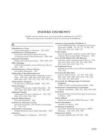 INDEKS OSOBOWY Indeks zawiera informacje na temat funkcji pełnionych w 1934 r. Kursywą oznaczono nazwiska autorów cytowanych publikacji. Antonow-Owsiejenko Władimir A. poseł ZSRR (do III), następnie prokurator generalny ZSRR 11, 19, 72, 73, 80, 107, Adamkiewicz Jerzy 120, 124, 168, 187, 188, 271 konsul generalny w Ottawie 661–663 Araki Sadao Adamkiewicz Włodzimierz generał japoński, minister wojny (do 23 I), naczelnik Wydziału Opieki Prawnej członek Najwyższej Rady Wojennej 138 w Departamencie Konsularnym 609, 610 Aras Tevfik Rüştü (Tewfik Ruszti) Adamski Stanisław minister spraw zagranicznych Turcji 124, biskup diecezji katowickiej 289, 290, 453 151–153, 230, 234, 235, 347, 482, 483, Alba Santiago 535, 544, 545, 629, 763, 774 polityk hiszpański, przewodniczący KorteArchimbaud Léon zów 166 polityk francuski, poseł (Partia Radykalna) Alcalá-Zamora y Torres Niceto 733, 763 prezydent Hiszpanii 165 Arciszewski Mirosław Aleksander I Karadziordziewić poseł w Bukareszcie 41, 227–232, 436, (zm. 9 X), król Jugosławii (zginął w zama439–444, 450, 486, 633, 634, 726–729, chu) 437, 501, 548, 651, 653, 658–661, 731–735, 761, 802, 803 690–692, 697, 710, 731, 753, 791, 793, 794 Arcoverde de Albuquerque Cavalcanti Aleksandrow Grigorij Joaquim II sekretarz ambasady ZSRR 768, 769 (1850–1930), kardynał brazylijski 694 Aloisi Pompeo Argetoianu (Argetoiano) Constantin delegat Włoch przy Lidze Narodów 20, polityk rumuński 230, 231, 438, 443, 634 320, 383, 423, 600– 602, 723, 763, 780 Ario Karl Alphand Charles korespondent niemieckiej agencji prasowej ambasador Francji w Moskwie 434, 467, w Polsce 195 468, 592–594, 708, 709 Arion Mihail Angulo Rafael Maria sekretarz generalny MSZ Rumunii 486 prawnik kubański 355 Armin Kazimierz Antonescu (Antonesco) Ion osadnik w Liberii 810 generał rumuński, szef Sztabu Generalnego 734, 761 Aschmann Gottfried naczelnik Wydziału Prasowego w MSZ Antoniade Constantin Niemiec 191, 194, 195, 788 delegat Rumunii przy Lidze Narodów 604 Ásgeirsson Ásgeir Antonow poseł Bułgarii w Ankarze 234, 235 premier Islandii (do 28 VII) 484 A 829 INDEKS OSOBOWY Ashida Hitoshi naczelny redaktor „The Japan Times and Mail” 420 Attolico Bernardo ambasador Włoch w Moskwie 383, 433–436, 480, 481, 531 Aubert Louis F. publicysta francuski, członek delegacji na XV sesję Ligi Narodów 568–570 Avenol Joseph Louis sekretarz generalny Ligi Narodów 142, 599, 721, 722, 773 Averescu (Averesco) Alexandru marszałek i polityk rumuński, były premier 230, 634 Azaña Díaz Manuel polityk hiszpański, członek Kortezów, b. premier 165 B Badan-Jaworenko Ołeksandr b. sekretarz Ludowego Komisariatu Oświaty USRR i szef kancelarii komisarza, aresztowany 15 Bader [?] 228, 229 Bainville Jacques Pierre historyk francuski, publicysta „Action Française” 83, 84 Balducci Ezio faszysta sanmaryński, sekretarz GUF w Bolonii 245 Baldwin Stanley polityk Partii Konserwatywnej, b. premier Wielkiej Brytanii, lord tajnej pieczęci (do VI) 226, 744, 750–752, 759 Baliński Stanisław referendarz referatu Środkowej Europy w Wydziale Wschodnim 123, 232 Balodis Jānis łotewski generał i polityk, poseł na Sejm (Łotewski Związek Rolników) 488 Bałycki Wsewołod zastępca szefa OGPU (do VII), później ludowy komisarz spraw wewnętrznych USRR, członek BP KP(b)U 15, 169 Bandera Stepan Andrijowycz jeden z przywódców OUN, szef 830 Egzekutywy Krajowej, aresztowany (VI) 108 Barclay Edwin James prezydent Liberii 807, 809 Bargeton Paul dyrektor ds. politycznych i handlowych w MSZ Francji 390, 391, 394, 476, 477 Bartel Kazimierz b. premier 200 Barthel de Weydenthal Jerzy poseł w Szanghaju 358–367 Barthou Louis (zm. 9 X), minister spraw zagranicznych Francji (od 9 II), zginął w zamachu 222, 223, 235, 242, 243, 245–248, 254, 296, 300, 302, 318, 323–328, 331–333, 335– 339, 344, 345, 357, 376, 377, 379, 380, 383–385, 390–394, 396, 416, 419, 420, 422, 426, 427, 436–443, 451, 457, 459, 462, 463, 465–467, 472, 475, 477–479, 501, 510, 539, 546–548, 550, 555, 557, 566, 573–575, 579, 585, 588–590, 595, 597, 600, 607, 613, 635, 650–652, 654, 660, 705, 707, 713, 747, 748, 752, 759, 762, 783, 787, 788 Bartlett Vernon dziennikarz angielski, publicysta „News Chronicle” 474 Bassompierre Albert de ambasador Belgii w Tokio 532, 533 Bastianini Giuseppe ambasador Włoch 320, 321, 344, 345, 383 Bauer Otto polityk austriacki, poseł (SDAPÖ), od II na emigracji 150 Bech Joseph premier Luksemburga, minister spraw zagranicznych i rolnictwa, delegat na XV sesji Zgromadzenia LN 604 Beck Jadwiga żona ministra spraw zagranicznych 88, 124, 168, 338, 376, 804, 805 Beck Józef minister spraw zagranicznych passim Beczkowicz Zygmunt poseł w Rydze 197, 199 Belić Aleksandar profesor filologii słowiańskiej, rektor Uniwersytetu w Belgradzie, członek zagraniczny PAU 688 INDEKS OSOBOWY Belina-Prażmowski-Kryński Zbigniew konsul w Leningradzie 499, 500 Bell Robert korespondent „The Manchester Guardian” 474 Bełow Iwan P. dowódca Leningradzkiego Okręgu Wojskowego 499 Beneš (Benesz) Edvard minister spraw zagranicznych Czechosłowacji 43, 44, 61–63, 128, 142, 216, 221, 286–288, 305, 315, 316, 328, 333, 347, 348, 391, 416, 417, 436, 440, 445, 450, 496, 532, 533, 549, 550, 570–573, 586, 601, 602, 604, 651, 652, 653, 722, 731, 734, 742, 745, 746, 797 Bennett Richard Bedford premier Kanady, polityk Partii Konserwatywnej 661–663 Bérenger Henry francuski polityk i dyplomata, szef senackiej Komisji Spraw Zagranicznych 764 Berger-Waldenegg (Valdenek) Egon minister spraw zagranicznych Austrii (od 3 VIII) 590, 799 Berķis (Berkis) Krišjānis generał łotewski 488 Bernus Pierre redaktor „Journal des Débats” 83, 84 Berson Jan Stanisław (pseud. Otmar) publicysta „Gazety Polskiej”, korespondent PAT w Moskwie 94, 318, 581, 624, 702, 768, 772, 778, 788 Bertram Adolf kardynał, arcybiskup metropolita wrocławski, przewodniczący niemieckiej konfere