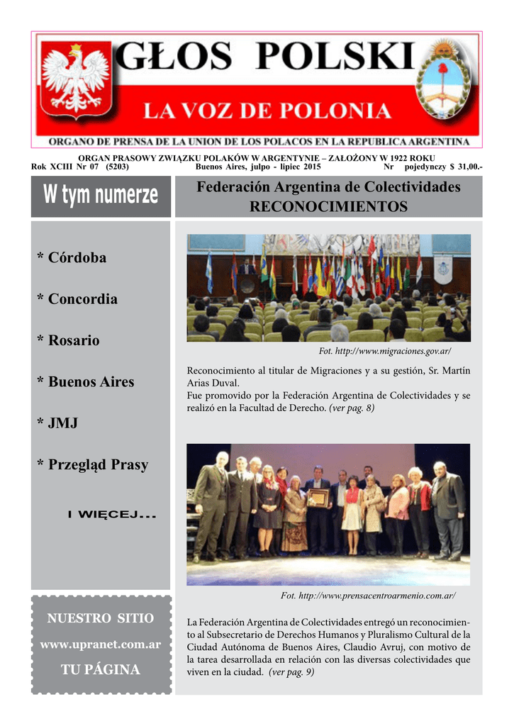 ORGAN PRASOWY ZWIĄZKU POLAKÓW W ARGENTYNIE – ZAŁOŻONY W 1922 ROKU Rok XCIII Nr 07 (5203) Buenos Aires, julpo - lipiec 2015 Nr pojedynczy $ 31,00.- W tym numerze Federación Argentina de Colectividades RECONOCIMIENTOS * Córdoba * Concordia * Rosario * Buenos Aires * JMJ Fot. http://www.migraciones.gov.ar/ Reconocimiento al titular de Migraciones y a su gestión, Sr. Martín Arias Duval. Fue promovido por la Federación Argentina de Colectividades y se realizó en la Facultad de Derecho. (ver pag. 8) * Przegląd Prasy i więcej... Fot. http://www.prensacentroarmenio.com.ar/ NUESTRO SITIO www.upranet.com.ar TU PÁGINA La Federación Argentina de Colectividades entregó un reconocimiento al Subsecretario de Derechos Humanos y Pluralismo Cultural de la Ciudad Autónoma de Buenos Aires, Claudio Avruj, con motivo de la tarea desarrollada en relación con las diversas colectividades que viven en la ciudad. (ver pag. 9) Str. 2 Głos Polski Buenos Aires, Nr 07 / 2015 (5203) Córdoba nada Cultural Polaca, el evento central del día, en el Centro Cultural Casona Municipal, una antigua y tradicional casona ubicada en el centro de la ciudad, la cual data de fines del s. XIX y fue remodelada y --- Hacía un buen tiempo no se realizaba en Córdoba transformada en centro cultural por la Municipalidad una actividad cultural para abordar la cultura e his- de Córdoba, a quien agradecemos facilitó ese espacio toria de Polonia desde distintas miradas y momentos para poder llevar a cabo nuestras actividades vespertihistóricos del país. Es por ello que la Asociación Polaca de Córdoba, con el apoyo de la Embajada de Polonia en Argentina, organizó la Jornada Cultural Polaca el viernes 19 de Junio en la ciudad de Córdoba. nas. María Teresa Dittler, autora del reconocido libro entre la comunidad polaca en Argentina “Amapolas Rojas. Inmigrantes de Posguerra”, dio comienzo a las disertaciones en la Jornada Cultural proyectando un emotivo video con fotografías sobre su trabajo de los inmigrantes polacos y luego, con la sensibilidad y sencillez que caracteriza a su autora, se dio paso a Durante la mañana del Viernes 19 de Junio se llevó a una ronda de preguntas por parte del público presente, cabo en la Asociación Polaca una Guardia Consular a ávido de conocer más de sus experiencias e impresiocargo de la Sra. Addeo-Krajewska, quien desde tem- nes en la realización de este excelente libro. prano en la mañana recibió a hijos, nietos y bisnietos de inmigrantes polacos que acudieron -con turno previo asignado- a realizar consultas y evacuar todas las dudas posibles respectivas a los trámites de obtención de ciudadanía y/o pasaporte polaco. La Sra. Cónsul manifestó su interés y felicitaciones para nuestra institución por las distintas actividades de baile, canto e idioma polaco que se llevan a cabo en la calle Polonia 1547 fomentando así la cultura polaca en todas sus formas posibles, para niños, jóvenes y adultos de distintas edades. Las actividades continuaron con el inicio de la Jor- Luego, el Vocal Cultural de la Asociación Polaca Alexis Marcial Szmidt, realizó una exposición sobre los orígenes del sindicato polaco Solidaridad (“Solidarność”) en la década de 1980 y como -con su líder Lech Wałęsa y la resistencia pacífica de los trabajadores polacos- a través de distintos sucesos que afectaron a una Polonia comunista y sometida, fueron cambiando su propia historia y la de Europa, hasta la caída del muro de Berlín y fin del régimen comunista soviético en 1989. La Sra. Cónsul de Polonia en Argentina fue la encargada de cerrar las disertaciones de la Jornada con los (cont. pag. 3) (5203) Głos Polski Buenos Aires, Nr 07 / 2015 Str. 3 da Cultural Polaca en Córdoba. “25 Años de la Democracia en Polonia (1989-2014)”. El sábado 20 de Junio la Sra. Joanna Addeo-Krajewska y María Teresa Dittler, quienes deseaban conocer las instalaciones de la Colonia Polaca ubicada en la localidad serrana de La Granja lo hicieron junto a miembros de la Comisión Directiva, donde fueron recibidos con un delicioso almuerzo por parte de los anfitriones José “Pipek” Bielewicz, su señora Virginia y Silvina Czerniawski, con quienes disfrutamos una amena tarde entre polacos en el bello entorno natural que ofrecen las Sierras de Córdoba. De parte de la Comisión Directiva y toda la Asociación Polaca agradecemos la grata visita de la Sra. Cónsul y Sra. María Teresa Dittler, a quienes esperamos tener pronto por nuestra casa nuevamente. (de pag. 2) La Sra. Joanna Addeo-Krajewska realizó un análisis de cómo fue el paso y transformación de un país que se encontraba bajo un régimen comunista y opresor de libertades tan esenciales como las individuales -económicas, políticas, culturales, sociales- a través de la lucha por la libertad y la democracia, a ser una nación con un sistema político democrático, con una economía pujante y en crecimiento, y miembro de la Unión Europea desde el año 2004. Para finalizar, el Balet Krakus interpretó “Polonesa” que con sus finos acordes y armoniosos pasos, en el marco de una tarde de cultura polaca en la elegante sala mayor de la Casona Municipal, fue un excelente cierre para la Jorna- Agradecemos a todos quienes hicieron posible y aportaron su tiempo y esfuerzo para que tanto la Guardia Consular como la Jornada Cultural fueran un éxito y una clara muestra de que la Colectividad Polaca de Córdoba trabaja por y para mantener la cultura y raíces polacas a través de numerosas y variadas actividades e iniciativas a lo largo del año. Alexis Marcial Szmidt Str. 4 Głos Polski Buenos Aires, Nr 07 / 2015 Los niños del Mały Krakus aprenden sobre las tradiciones polacas: (5203) Concordia Damos la BIENVENIDA a una nueva Asociación integrante de UPRA... Witaj CONCORDIA! En esta ocasión realizaron sus propias coronas y coronitas para la Noc Kupały o Noc Świętojańska (Noche de Kupała o Noche de San Juan), que se celebra en Pol