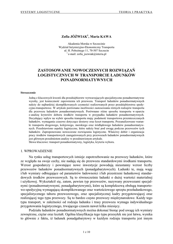 SYST E MY LOGI ST YCZNE T E ORI A I P RAKT YKA Zofia JÓŹWIAK1, Maria KAWA Akademia Morska w Szczecinie Wydział Inżynieryjno-Ekonomiczny Transportu ul. H. Pobożnego 11, 70-507 Szczecin 1 e-mail: [email protected] ZASTOSOWANIE NOWOCZESNYCH ROZWIĄZAŃ LOGISTYCZNYCH W TRANSPORCIE ŁADUNKÓW PONADNORMATYWNYCH Streszczenie Jedną z kluczowych kwestii dla przedsiębiorstw wytwarzających specjalistyczne ponadnormatywne wyroby, jest konieczność zapewnienia ich przewozu. Transport ładunków ponadnormatywnych należy do najbardziej skomplikowanych czynności realizowanych przez przedsiębiorstwa spedycyjno-transportowe. W artykule porównano możliwości zastosowania różnych rodzajów transportu dla przewozu ładunków ponadnormatywnych. Porównano różne sposoby transportu w oparciu o analizę kryteriów doboru środków transportu w przypadku ładunków ponadnormatywnych. Decydujący wpływ na wybór sposobu transportu mają: podatność transportowa przemieszczanych ładunków, wymagania czasowe dotyczące dostawy oraz koszt transportu. Przeanalizowano warunki transportu drogowego, kolejowego, morskiego oraz śródlądowego ładunków ponadnormatywnych. Przedstawiono aspekty logistyczne, które należy brać pod uwagę podczas przewozów tych ładunków. Zaproponowano nowoczesne rozwiązania logistyczne. Właściwy dobór i organizacja pracy środków transportowych zaangażowanych przy przewozach ładunków ponadnormatywnych jest głównym przedmiotem analizy w przedstawionym artykule. Słowa kluczowe: transport ponadnormatywny, logistyka, kryteria wyboru. 1. WPROWADZENIE Na rynku usług transportowych istnieje zapotrzebowanie na przewozy ładunków, które ze względu na swoje cechy, nie nadają się do przewozu standardowymi środkami transportu. Wzrost gospodarczy i powstające nowe inwestycje powodują nieustanny wzrost liczby przewozów ładunków ponadnormatywnych (ponadgabarytowych). Ładunki te, mają wagę i/lub wymiary odbiegające od parametrów ładowności i/lub przestrzeni ładunkowej standardowych środków przewozowych. Są to równocześnie ładunki o dużej wartości materialnej i użytkowej. Wykształcił się, zatem, pewien typ przewozów, nazywany przewozami specjalnymi (ponadnormatywnymi, ponadgabarytowymi), które są kompleksową obsługą transportowo-spedycyjną wymagającą skomplikowanego oraz wartościowego sprzętu przeładunkowego, specjalistycznego taboru przewozowego, oraz specjalistycznej kadry przygotowującej oraz realizującej tego typu przewozy. Są to bardzo często przewozy międzynarodowe. Każdy tego typu transport, w zależności od rodzaju ładunku i trasy przewozu wymaga indywidualnego przygotowania logistycznego, trwającego czasem nawet kilka miesięcy. Podziału ładunków ponadnormatywnych można dokonać biorąc pod uwagę ich wymiary zewnętrzne, ciężar oraz kształt. Ogólna klasyfikacja tego typu przesyłek nie jest łatwa, wynika to głównie z faktu, iż ładunek ponadgabarytowy w każdym rodzaju transportu jest innym 1 z 10 SYST E MY LOGI ST YCZNE T E ORI A I P RAKT YKA typem ładunku o różniących się od siebie wartościach cech technicznych. Dlatego specyfika danego ładunku jest czynnikiem determinującym sposób wykonania przewozu, doboru środka transportu, rodzaju sprzętu transportowego oraz trybu określania tras przejazdu i zezwoleń, a w konsekwencji możliwości wykonania zlecenia. Ładunki ponadnormatywne można podzielić na kilka grup [3]: • ponadgabarytowe zwykłe, • ponadgabarytowe specjalne, • ciężkie, • ciężkie o skupionej masie, • ciężkie przestrzenne, • długie. Ładunki ponadnormatywne przemieszcza się głównie transportem samochodowym. Szacuje się, że po np. autostradach amerykańskich przewożonych jest w skali roku około 3,5 ml. Ładunków ponadnormatywnych. Wg szacunków autorek transport ponadgabarytowy stanowi ok. 10% ogólnej masy przewożonych ładunków. W Polsce zgodnie z ustawą Prawo o ruchu drogowym pojazd lub zespół pojazdów jest pojazdem ponadnormatywnym, jeżeli jego naciski osi wraz z ładunkiem lub bez ładunku są większe od dopuszczalnych, przewidzianych dla danej drogi w przepisach o drogach publicznych, albo, którego wymiary lub masa wraz z ładunkiem lub bez niego przekroczą choćby o 1cm następujące wartości: • długość zestawu drogowego z naczepą – 16,50 m, • długość zestawu z przyczepą – 18,5 m, • szerokość pojazdu – 2,55 m (dla chłodni 2,60 m – choć ze względu na sztywną zabudowę nie ma możliwości przekroczenia tego wymiaru), • wysokość pojazdu – 4 m. 2. TRANSPORT ŁADUNKÓW PONADNORMATYWNYCH Ładunek, który w transporcie drogowym jest „ponadgabarytem”, na barce, statku, wagonie kolejowym, czy w samolocie może być ładunkiem standardowym. Dlatego też nie ma jednoznacznej i ogólnej definicji dla tego typu ładunków. Szczególną formą transportu ładunków ponadgabarytowych są dostawy inwestycyjne obiektów produkcyjnych, urządzeń przemysłowych, przemieszczania całych zakładów produkcyjnych itp. Są one jedną z najbardziej skomplikowanych logistycznie usług z zakresu transportu, obejmującą wynajęcie różnego typu środków transportu, szczegółowe planowanie rozkładu załadunków, opracowanie schematów rozładunków oraz wymagań odnośnie mocowania ładunku, zapewnienie kompleksowego wystawienia dokumentów przewozowych i celnych (w przypadku transportu międzynarodowego). W transporcie drogowym ładunkiem ponadnormatywnym jest towar, którego wymiary lub waga przekroczą maksymalne, dopuszczalne parametry standardowego zestawu drogowego lub zestawu z przyczepą. W Polsce obowiązują szczegółowe przepisy określające poruszanie się pojazdów po drogach publicznych w zależności od warunków technicznych drogi i dopuszczalnych nacisków na oś napędową, nie napędową oraz składową. Dopuszczalne naciski na oś napędową pojazdu w Polsce przedstawiono w tabeli 1. W transpo